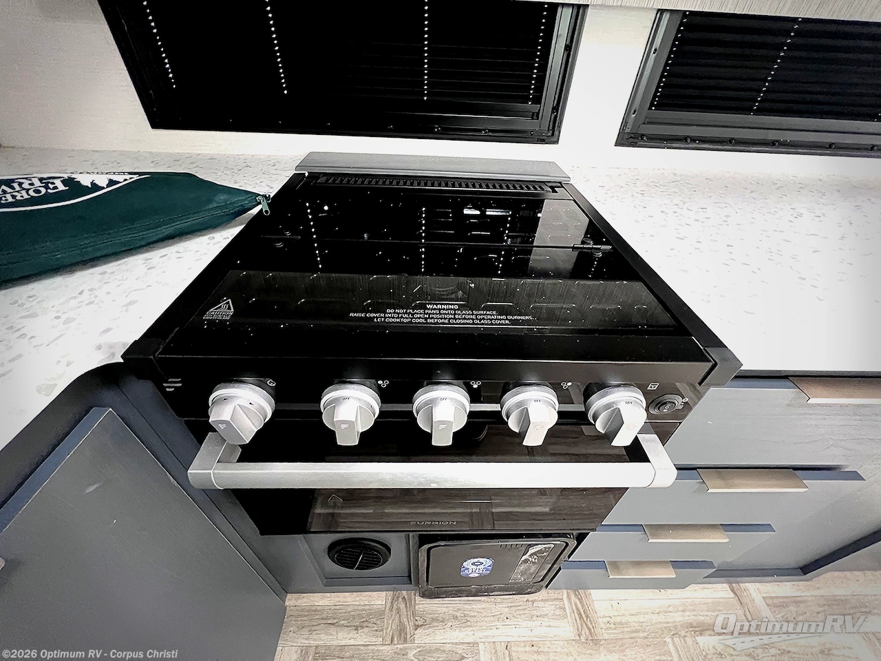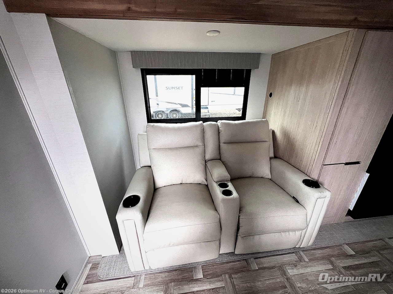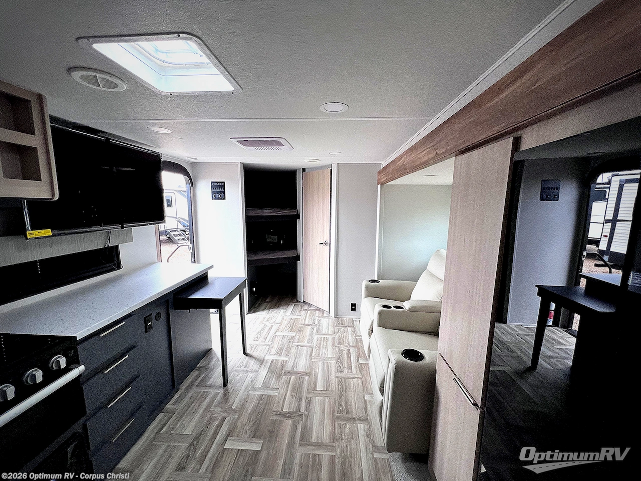 If you're looking for more comfort and a larger sleeping capacity in your next RV, this travel trailer is the one! There are double-size bunks in the rear corner, along with a ladder to easily hop into bed, and the full bath is in the other rear corner for easy nighttime use. You'll enjoy the front private bedroom with its queen bed and dual wardrobes for your things. In the morning, you can make breakfast in the full kitchen, then dine at the bartop with three stools. Or head outdoors to cook on the camp kitchen and eat under the awning! There is also a theater seat within the slide out for more comfort and space, plus the pantry and refrigerator are here so you can easily grab a snack!
