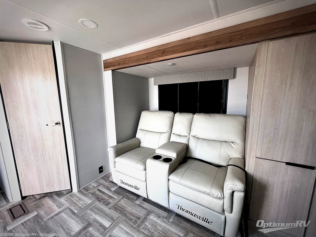 The perfect couple's trailer is found with this RV! You'll enjoy the front private bedroom with its queen bed and dual wardrobes for your things, and the rear corner full bath on board will let you stay clean throughout your trip. In the morning, you can make breakfast in the full kitchen, then dine at the bartop with three stools. There is also a theater seat within the slide out for more comfort and space, plus the pantry and refrigerator are here so you can easily grab a snack. A desk with a chair lets you work while you're away from home if you need to, and there is even a closet with washer and dryer prep if you choose to add those appliances!