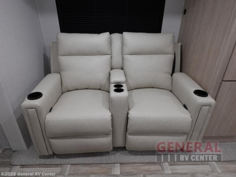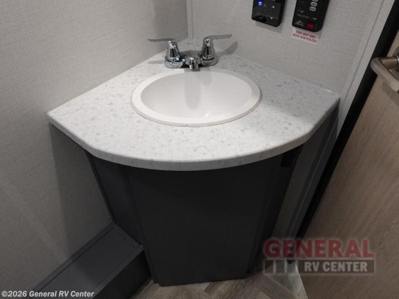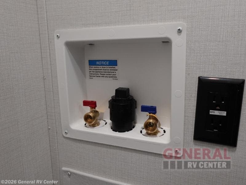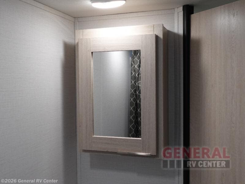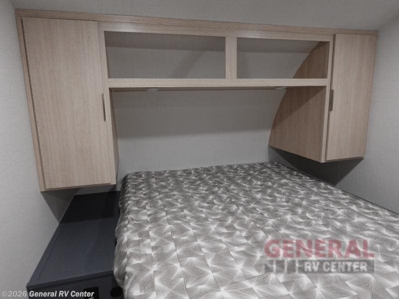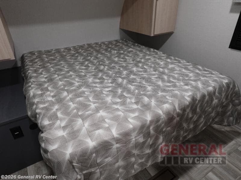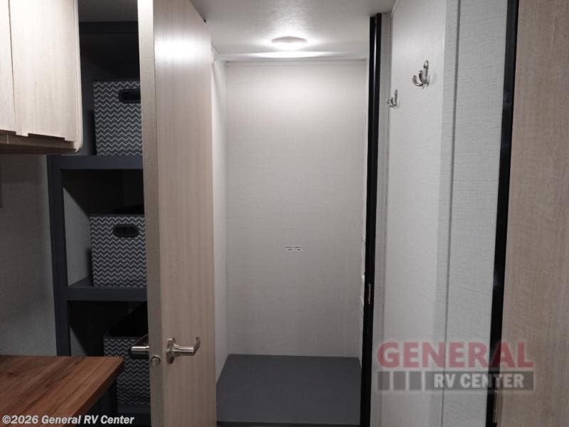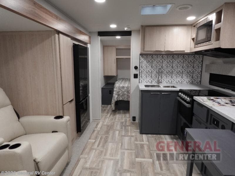 The perfect couple's trailer is found with this RV! You'll enjoy the front private bedroom with its queen bed and dual wardrobes for your things, and the rear corner full bath on board will let you stay clean throughout your trip. In the morning, you can make breakfast in the full kitchen, then dine at the bartop with three stools. There is also a theater seat within the slide out for more comfort and space, plus the pantry and refrigerator are here so you can easily grab a snack. A desk with a chair lets you work while you're away from home if you need to, and there is even a closet with washer and dryer prep if you choose to add those appliances!