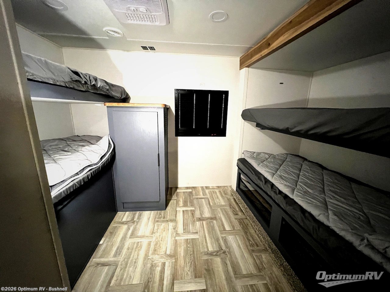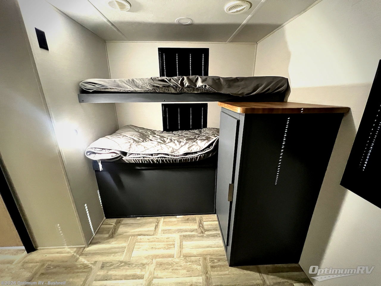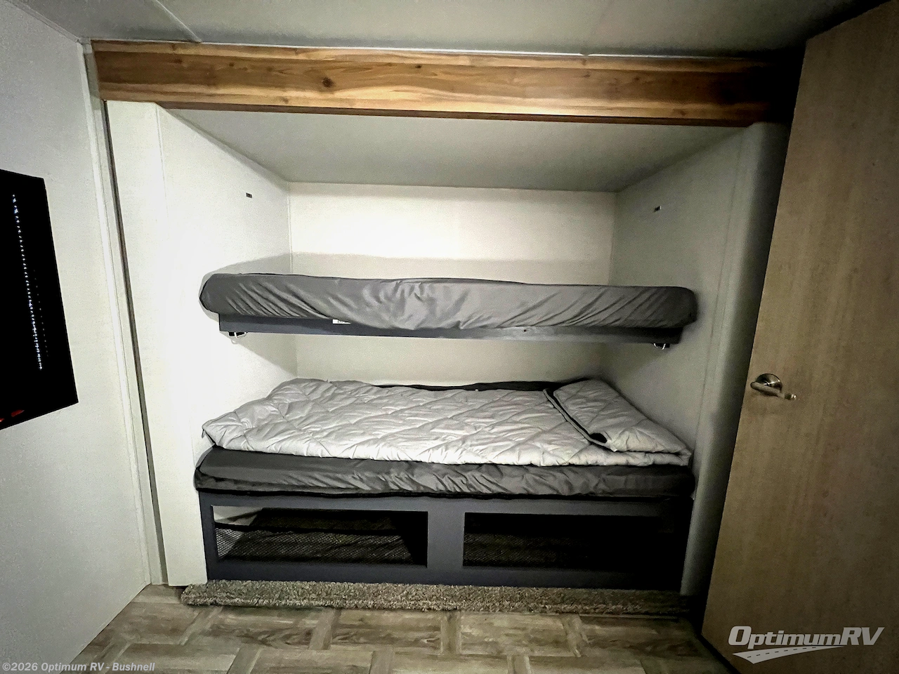 Camping with friends and family just got easier in this double slide, bunkhouse travel trailer! There are four bunks in the bunkhouse, along with a closet for clothes and shoes plus a slide out for more space. The front private bedroom provides the owners with their own space, and if you have any other guests, they can sleep on the booth dinette and sofa in the main living room. The full bath is convenient since you won't have to use the camp's facilities, and a full kitchen on board will let you whip up your best campground meals!