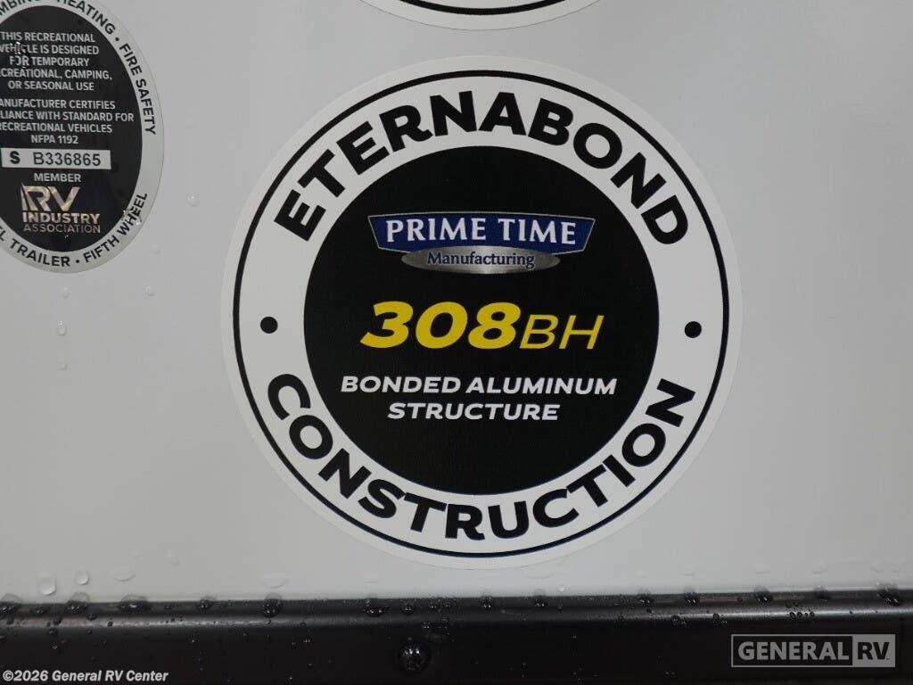 Experience the ultimate in family-friendly adventure with the 2025 Prime Time Tracer 308BH. This beautifully designed travel trailer is your gateway to unforgettable journeys, offering ample space and comfort for up to ten guests. At nearly 35 feet in length, it features a thoughtful layout that includes a spacious bunkhouse, perfect for the kids or guests, and a cozy queen bed retreat for you. The convertible dinette and sofa ensure everyone has a comfortable place to sleep after a day full of exploration. The heart of this RV is its well-appointed center kitchen, equipped with a full-size electric refrigerator and a three-burner cooktop, ready to handle all your culinary needs. The open living area, enhanced by two slides, offers a generous space for relaxation and entertainment, with a strategically placed entertainment center for those cozy movie nights. Outside, the 19-foot powered awning extends your living space into the great outdoors, providing the perfect spot for enjoying meals or simply soaking in the scenery. Designed with convenience in mind, the Tracer 308BH includes ample storage solutions, from the pass-thru storage for your travel gear to the built-in wardrobes. With a robust construction featuring D rated radial tires and a hitch weight of 780 lbs, this RV is ready to hit the road whenever you are. Discover the joys of RV living and create lasting memories with the Prime Time Tracer 308BH. For more details or to see it in person, visit your nearest General RV dealership.