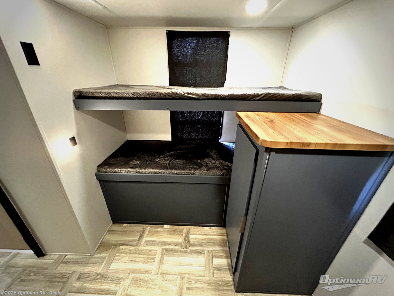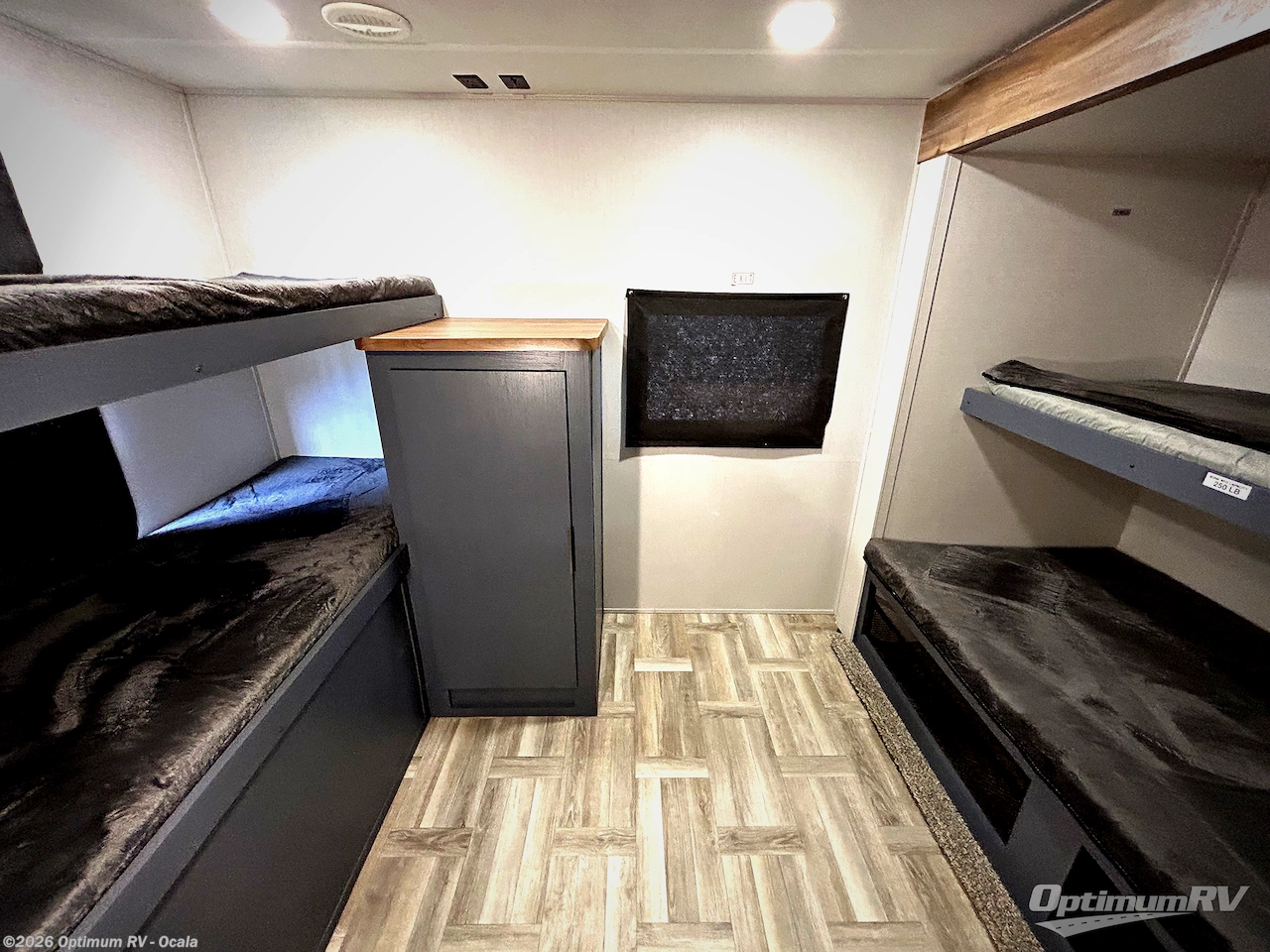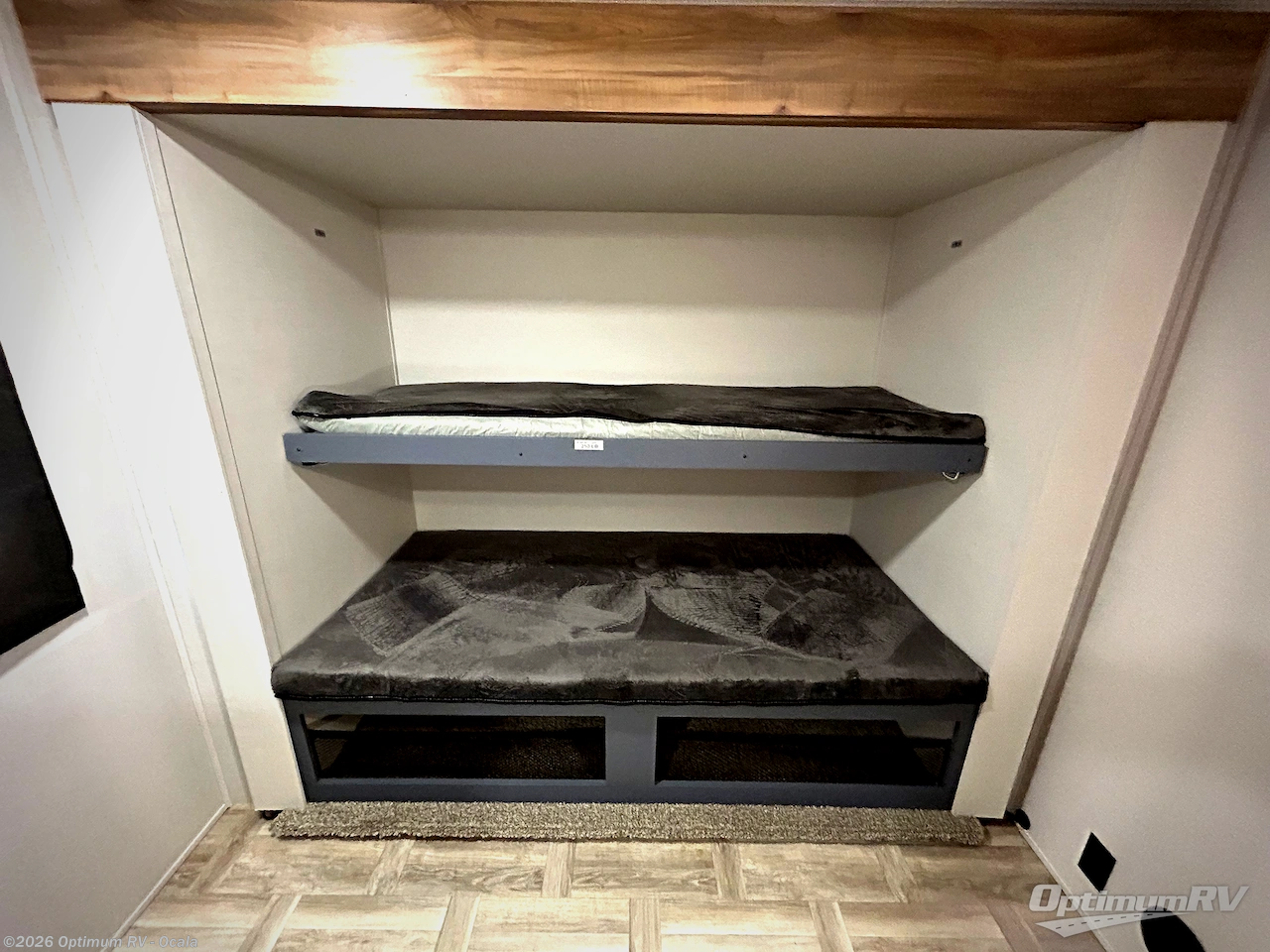 If more interior space and a larger sleeping capacity is what you're looking for, your search is over! The rear bunkhouse includes slide out bunk beds across from a second set of bunks plus a closet to keep this space organized. You will have the queen bed all to yourselves in the front bedroom, and there are even two wardrobes and an overhead cabinet for books. The combined living area and kitchen is made open thanks to the large slide out. Here, you'll find a sofa and booth dinette plus an entertainment center with TV prep if you want the option for movie nights. The chef of your group will love the full kitchen, complete with a microwave oven, 2 in 1 gas oven and range, and a large 2-door 12V refrigerator to keep your perishables fresh. Head outdoors after dinner to enjoy the 19' power awning with LED lights, and you can keep yard games in the exterior storage!