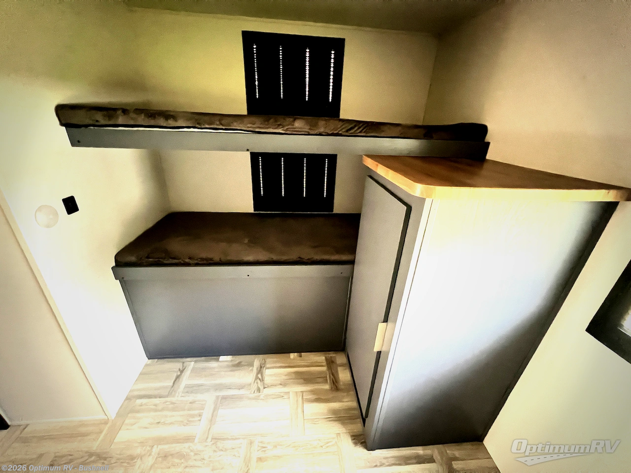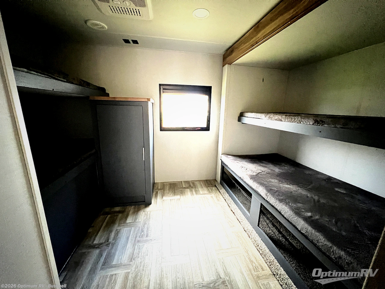 If more interior space and a larger sleeping capacity is what you're looking for, your search is over! The rear bunkhouse includes slide out bunk beds across from a second set of bunks plus a closet to keep this space organized. You will have the queen bed all to yourselves in the front bedroom, and there are even two wardrobes and an overhead cabinet for books. The combined living area and kitchen is made open thanks to the large slide out. Here, you'll find a sofa and booth dinette plus an entertainment center with TV prep if you want the option for movie nights. The chef of your group will love the full kitchen, complete with a microwave oven, 2 in 1 gas oven and range, and a large 2-door 12V refrigerator to keep your perishables fresh. Head outdoors after dinner to enjoy the 19' power awning with LED lights, and you can keep yard games in the exterior storage!