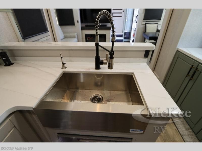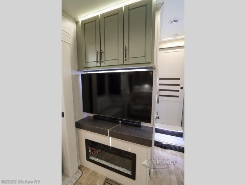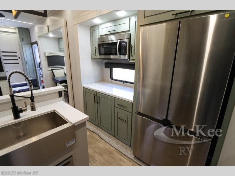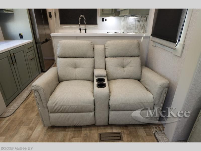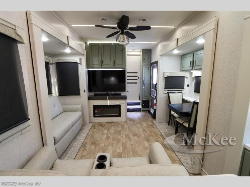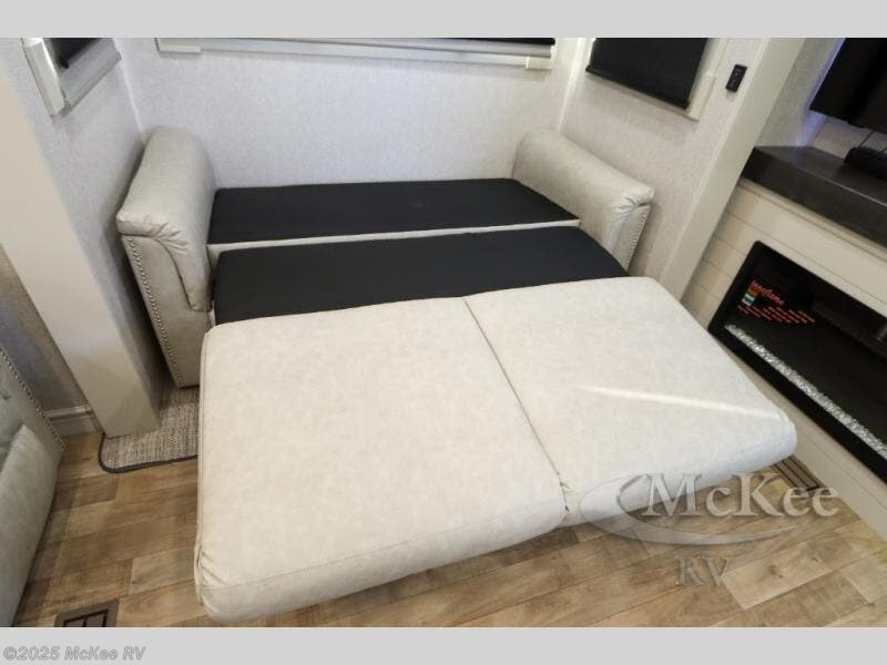 One step inside this fifth wheel and you'll see why it's an award-winning most-popular unit! You'll love the rear kitchen that includes ample countertop for food prep and a slide including the refrigerator, pantry and microwave for added moving around space. Head to the main living area where you can enjoy some family time on the theater seats, and the dinette with chairs will be the perfect place for a game of cards. The half bath is right off of this room for convenience, and your guests or kids can convert the tri-fold sofa into a bed for sleeping space at night. You will love the master bedroom with a king bed slide out, a dresser with a flip-up lid, plus a 39" TV. The front full bath is super spacious, and it includes a large walk-in wardrobe where you can even add an optional washer and dryer if you choose!