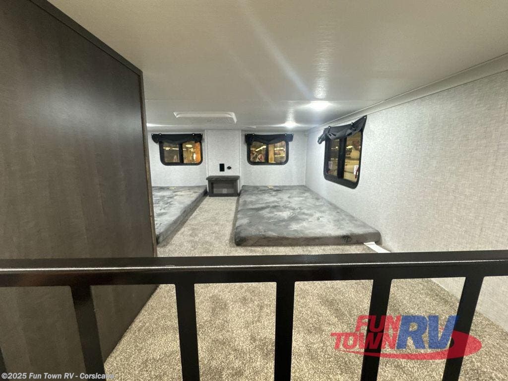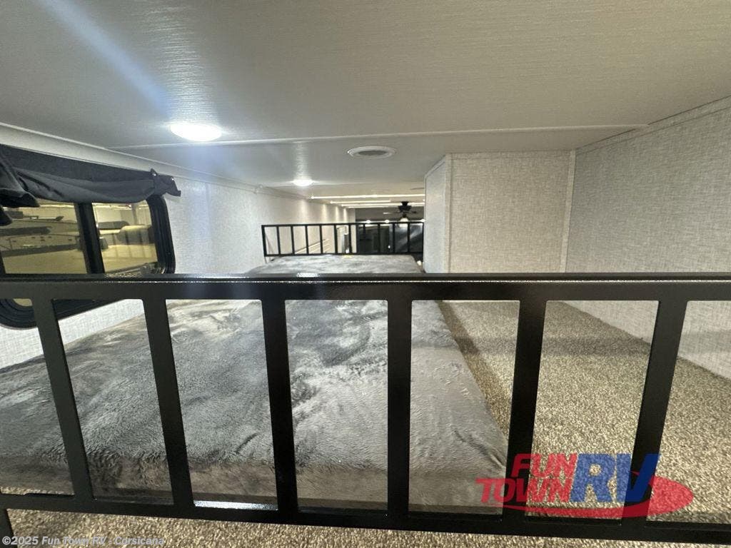 If you are looking for a destination trailer with more space and a larger sleeping capacity, this is the one! There are double loft areas; one above the bedroom with dual bunk mats and one above the bedroom with a third bunk mat. You'll find the rear bedroom ultra inviting with its king bed slide out, entertainment center with a 39" TV, plus a wardrobe and dresser to keep your things organized. If you have any other guests, they can sleep on the 72" sofa in the middle living area. There is also theater seating here, a ceiling fan, plus a fireplace and 50" TV. And the free-standing table with chairs and a bench provides a place to dine and play games in the evening. Head to the front kitchen where you'll find generous counter space, a bar top with two stools, and all the kitchen appliances to create your best meals!