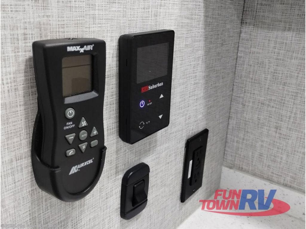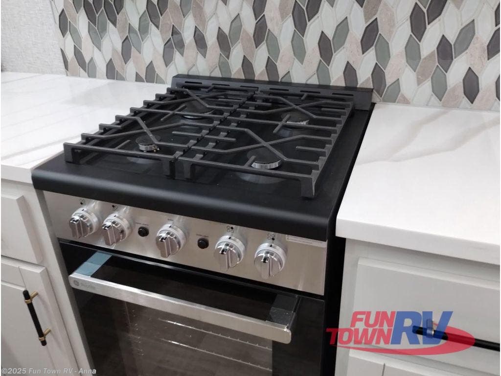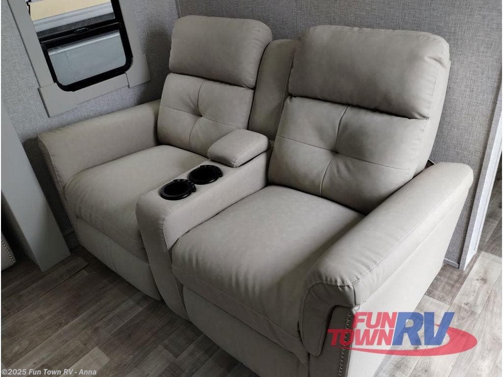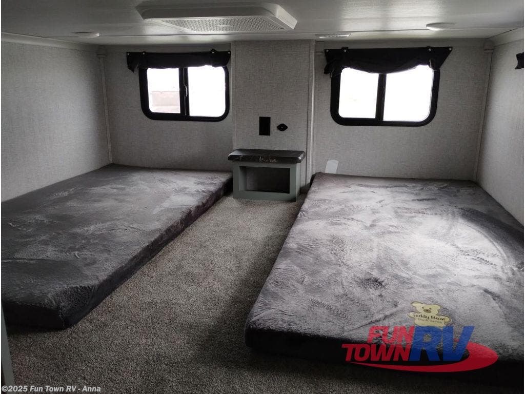 If you are looking for a destination trailer with more space and a larger sleeping capacity, this is the one! There are double loft areas; one above the bedroom with dual bunk mats and one above the bedroom with a third bunk mat. You'll find the rear bedroom ultra inviting with its king bed slide out, entertainment center with a 39" TV, plus a wardrobe and dresser to keep your things organized. If you have any other guests, they can sleep on the 72" sofa in the middle living area. There is also theater seating here, a ceiling fan, plus a fireplace and 50" TV. And the free-standing table with chairs and a bench provides a place to dine and play games in the evening. Head to the front kitchen where you'll find generous counter space, a bar top with two stools, and all the kitchen appliances to create your best meals!