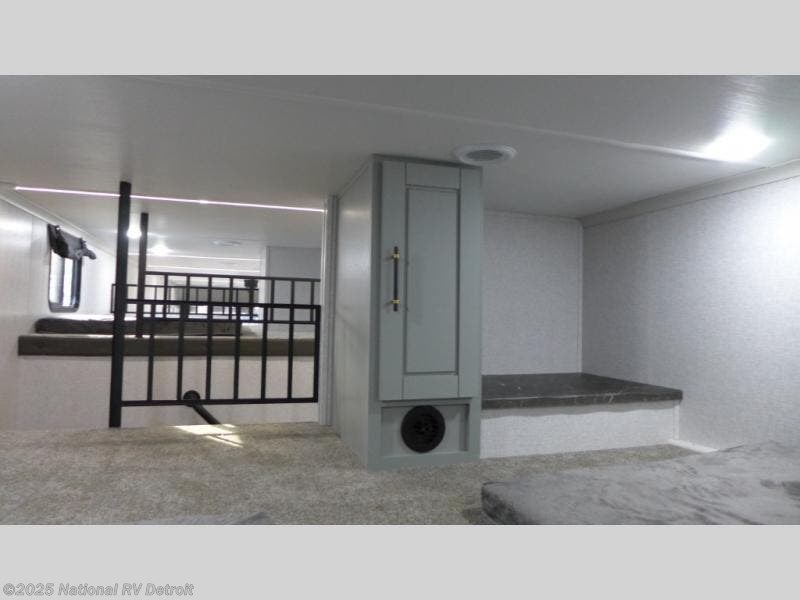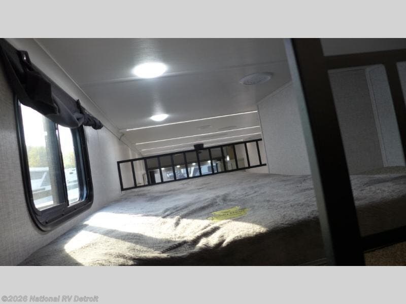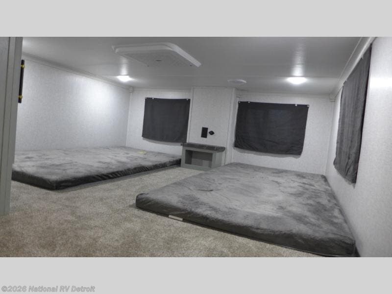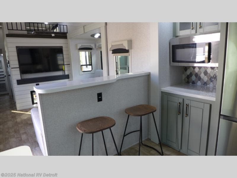 If you are looking for a destination trailer with more space and a larger sleeping capacity, this is the one! There are double loft areas; one above the bedroom with dual bunk mats and one above the bedroom with a third bunk mat. You'll find the rear bedroom ultra inviting with its king bed slide out, entertainment center with a 39" TV, plus a wardrobe and dresser to keep your things organized. If you have any other guests, they can sleep on the 72" sofa in the middle living area. There is also theater seating here, a ceiling fan, plus a fireplace and 50" TV. And the free-standing table with chairs and a bench provides a place to dine and play games in the evening. Head to the front kitchen where you'll find generous counter space, a bar top with two stools, and all the kitchen appliances to create your best meals!