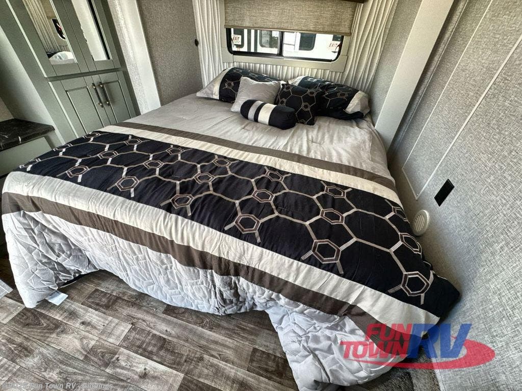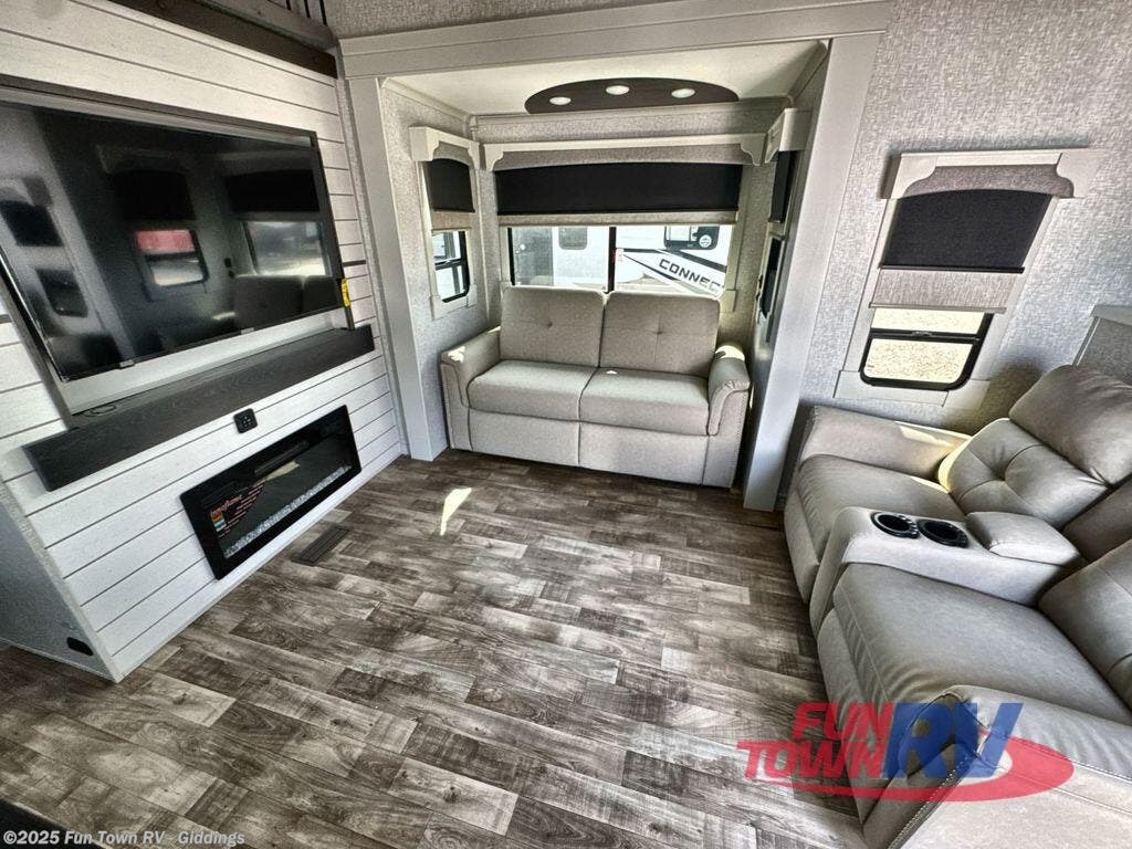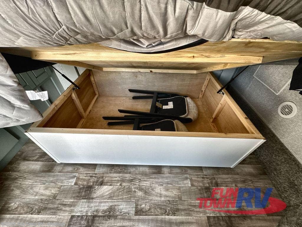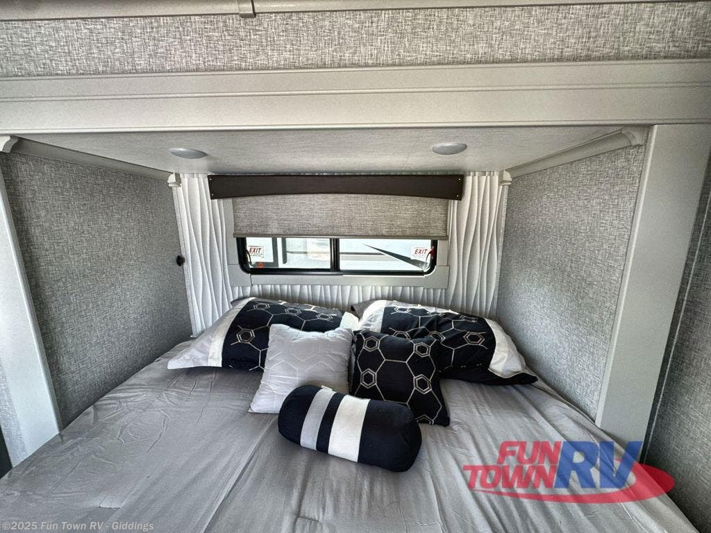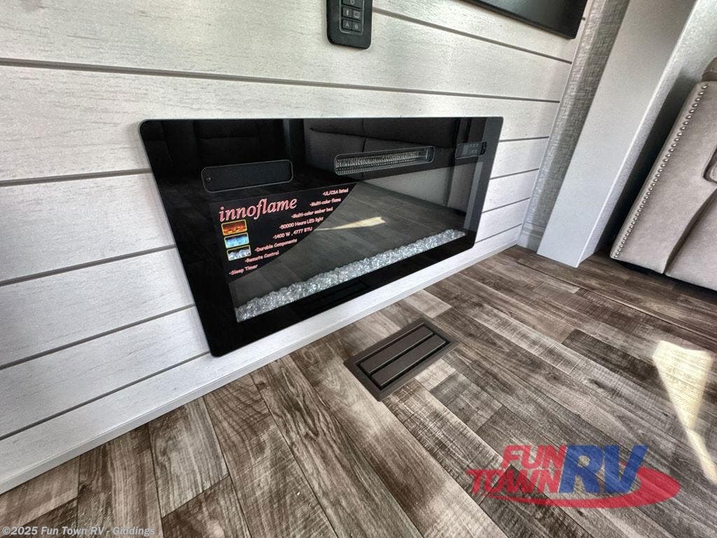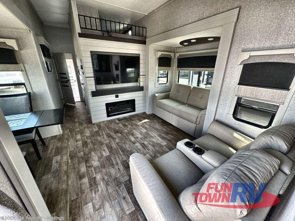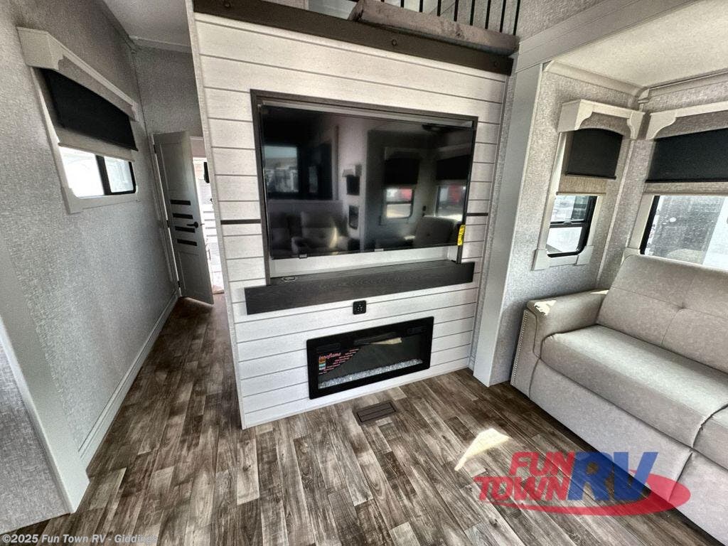 If you are looking for a destination trailer with more space and a larger sleeping capacity, this is the one! There are double loft areas; one above the bedroom with dual bunk mats and one above the bedroom with a third bunk mat. You'll find the rear bedroom ultra inviting with its king bed slide out, entertainment center with a 39" TV, plus a wardrobe and dresser to keep your things organized. If you have any other guests, they can sleep on the 72" sofa in the middle living area. There is also theater seating here, a ceiling fan, plus a fireplace and 50" TV. And the free-standing table with chairs and a bench provides a place to dine and play games in the evening. Head to the front kitchen where you'll find generous counter space, a bar top with two stools, and all the kitchen appliances to create your best meals!