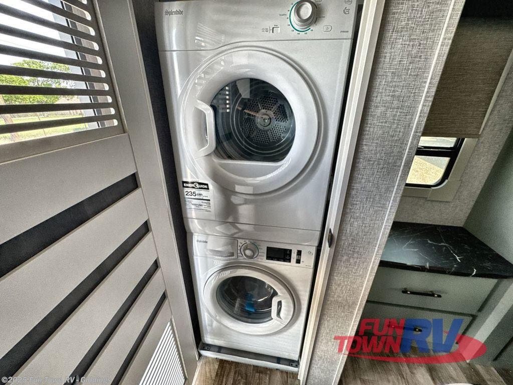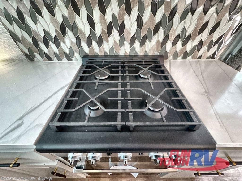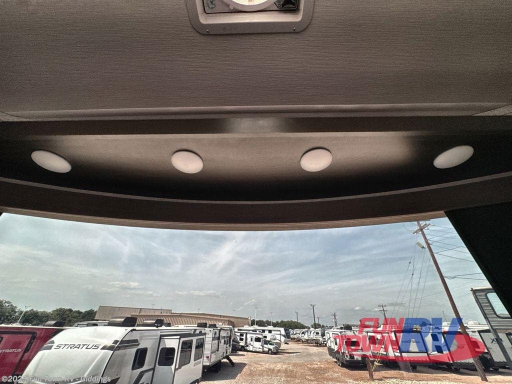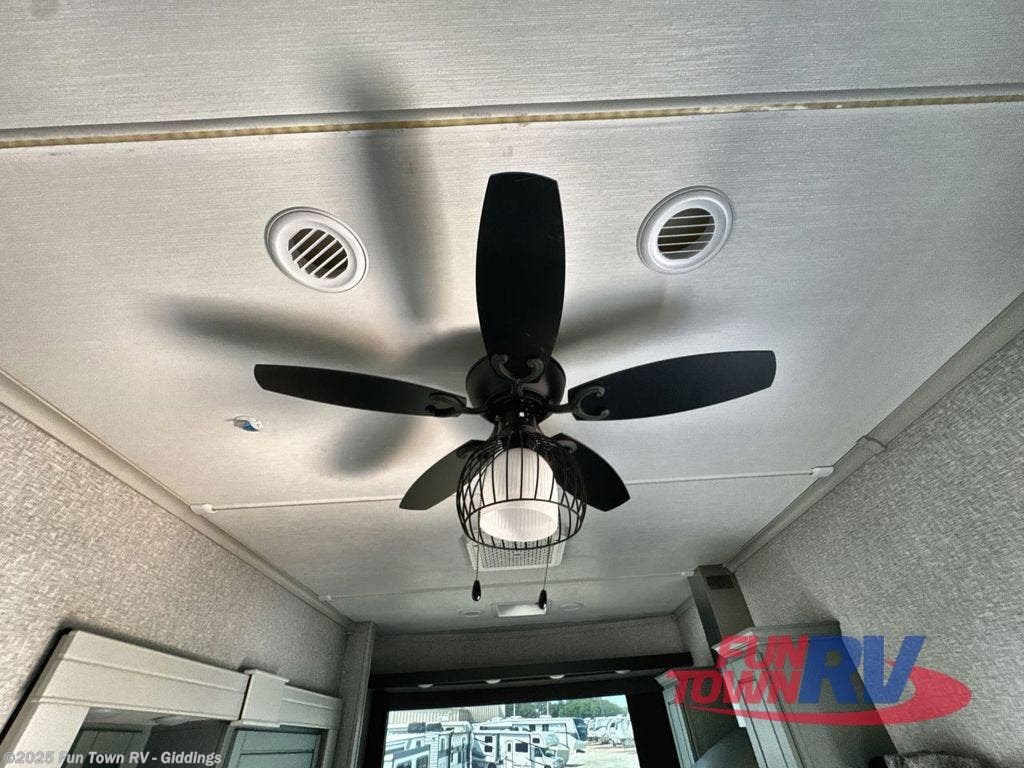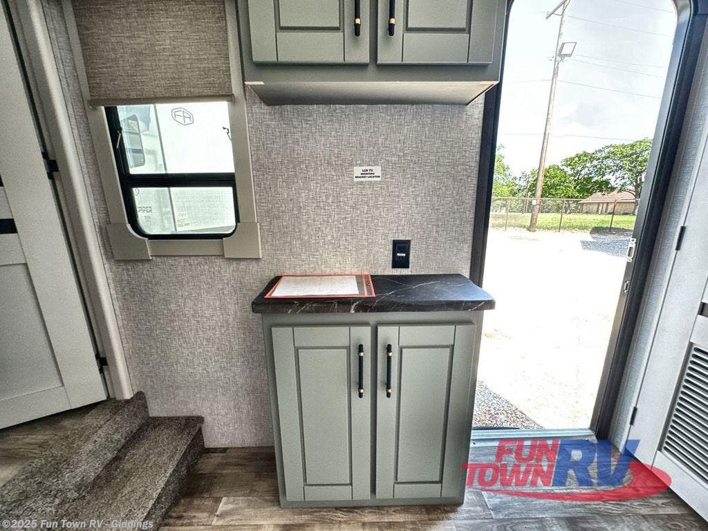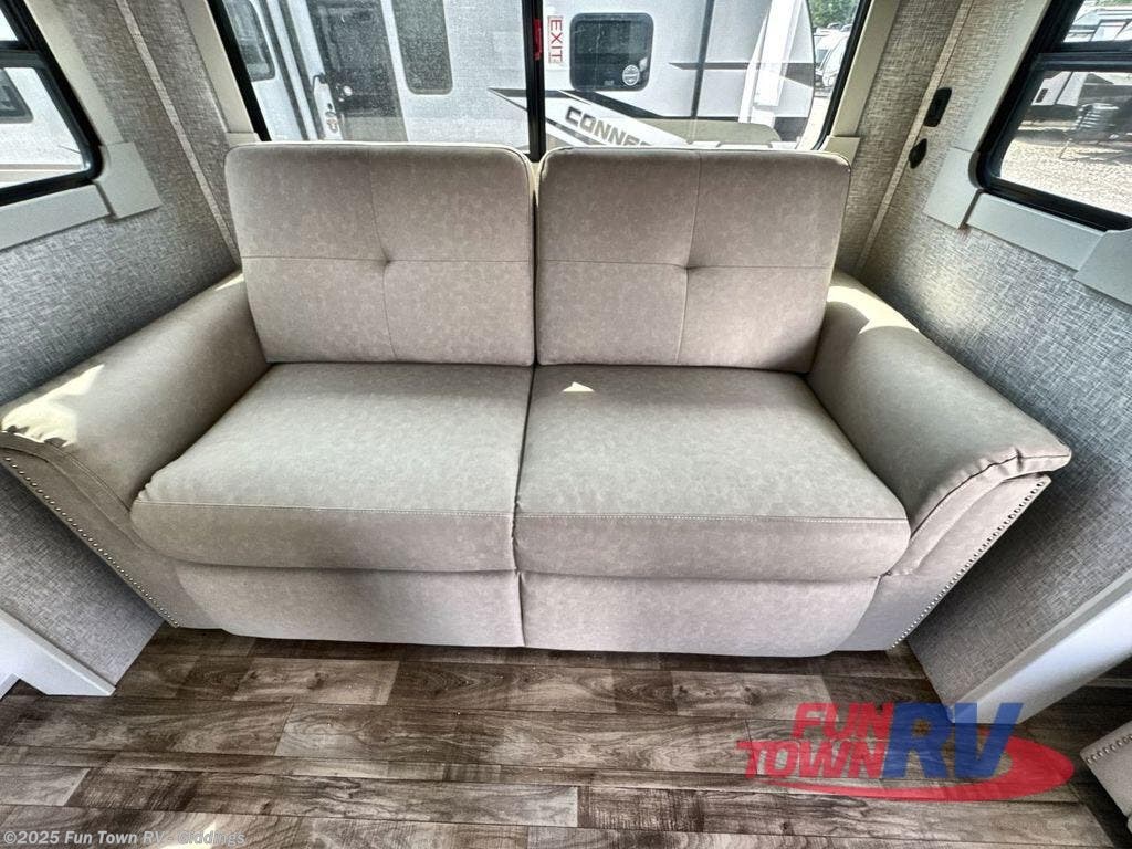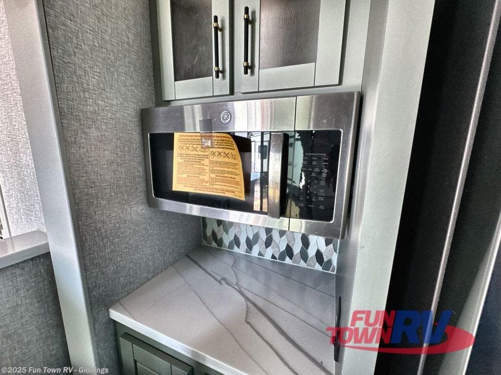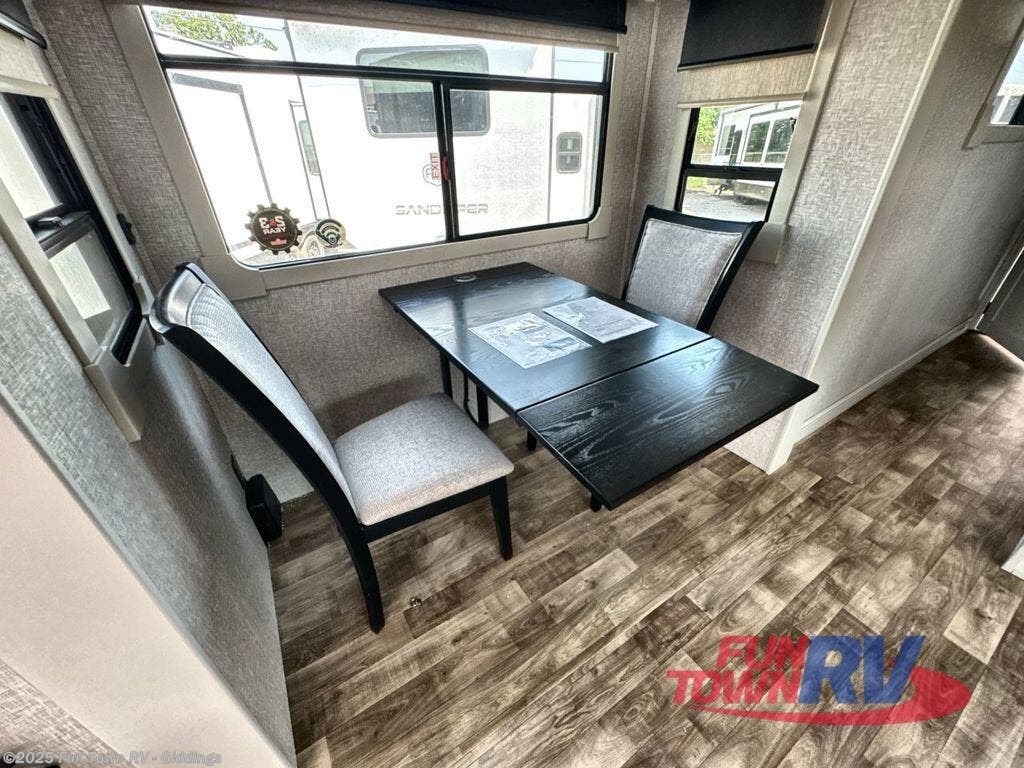 If you are looking for a destination trailer with more space and a larger sleeping capacity, this is the one! There are double loft areas; one above the bedroom with dual bunk mats and one above the bedroom with a third bunk mat. You'll find the rear bedroom ultra inviting with its king bed slide out, entertainment center with a 39" TV, plus a wardrobe and dresser to keep your things organized. If you have any other guests, they can sleep on the 72" sofa in the middle living area. There is also theater seating here, a ceiling fan, plus a fireplace and 50" TV. And the free-standing table with chairs and a bench provides a place to dine and play games in the evening. Head to the front kitchen where you'll find generous counter space, a bar top with two stools, and all the kitchen appliances to create your best meals!