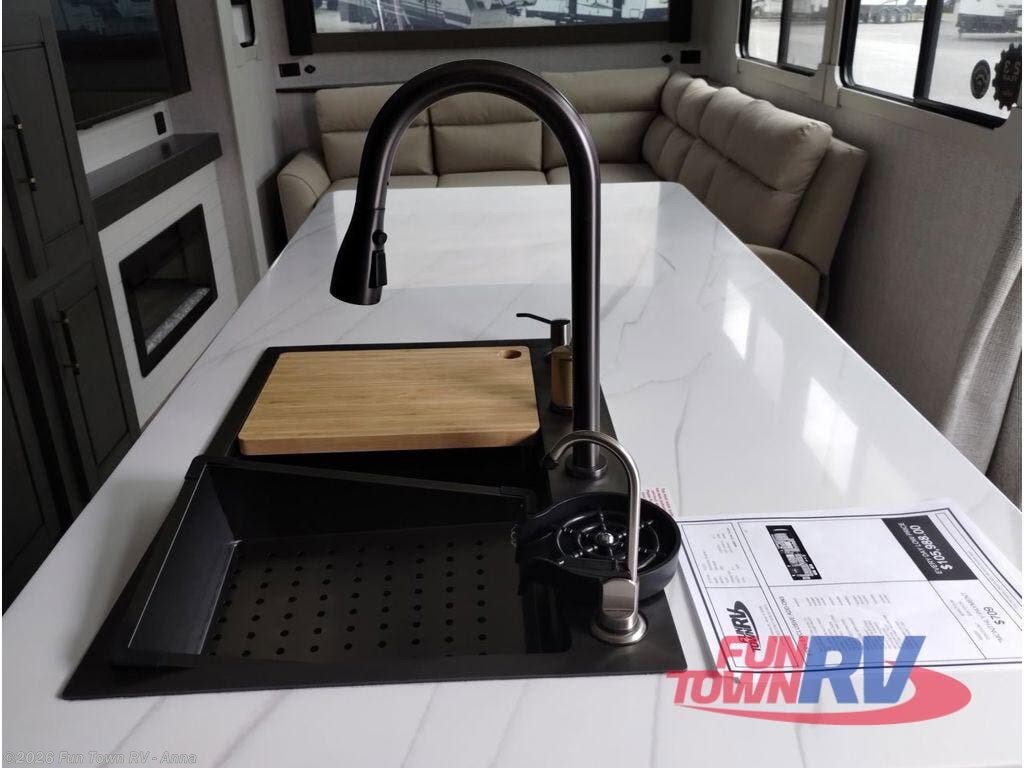 You're going to love time spent in this triple slide out destination trailer! A front L-shaped sectional sofa provides your crew with a space to relax in the evenings, and the fireplace here with a 65" TV is sure to make it feel like home. A large kitchen island with stools gives you a more counter space and a place to dine at together. You will also enjoy the sliding door here for more natural light. The full bath includes a spacious 48" shower plus dual bath sinks so you both can get ready for bed at the same time. You'll feel right at home in the rear bedroom with its king bed slide out, dual nightstands, two wardrobes and a dresser for maximum storage space!