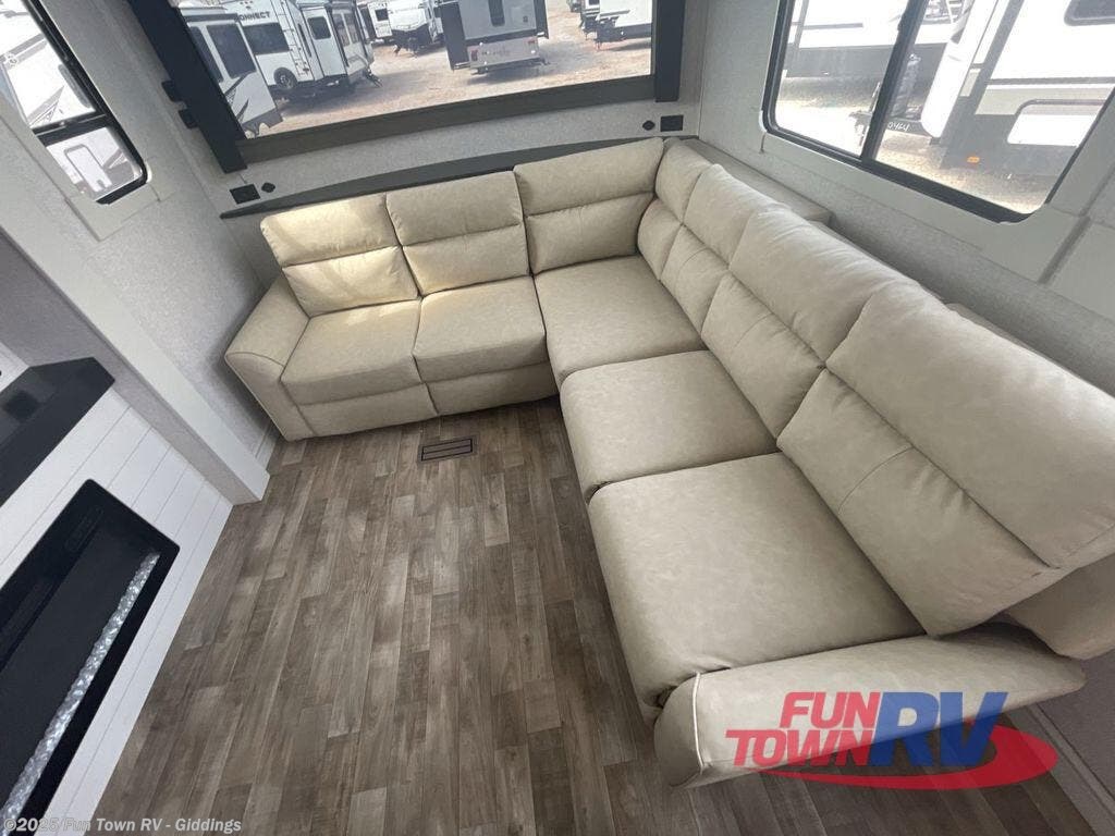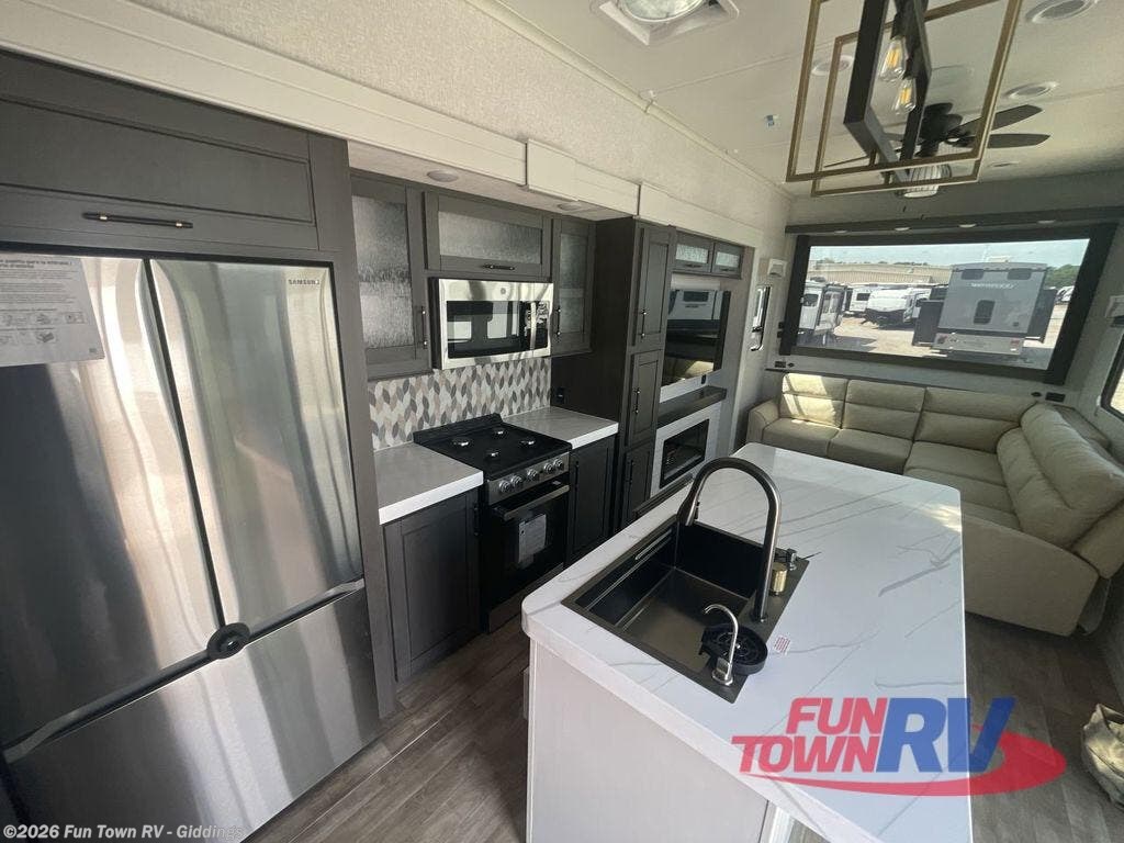 You're going to love time spent in this triple slide out destination trailer! A front L-shaped sectional sofa provides your crew with a space to relax in the evenings, and the fireplace here with a 65" TV is sure to make it feel like home. A large kitchen island with stools gives you a more counter space and a place to dine at together. You will also enjoy the sliding door here for more natural light. The full bath includes a spacious 48" shower plus dual bath sinks so you both can get ready for bed at the same time. You'll feel right at home in the rear bedroom with its king bed slide out, dual nightstands, two wardrobes and a dresser for maximum storage space!