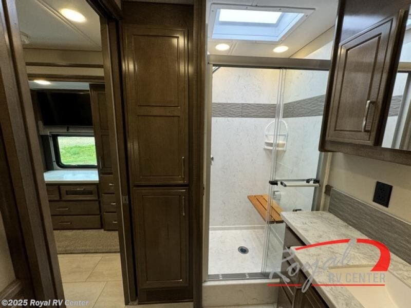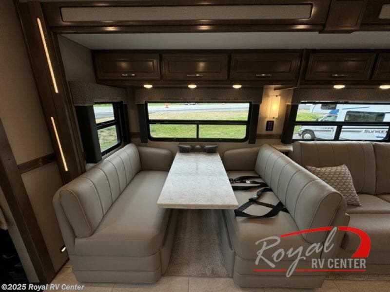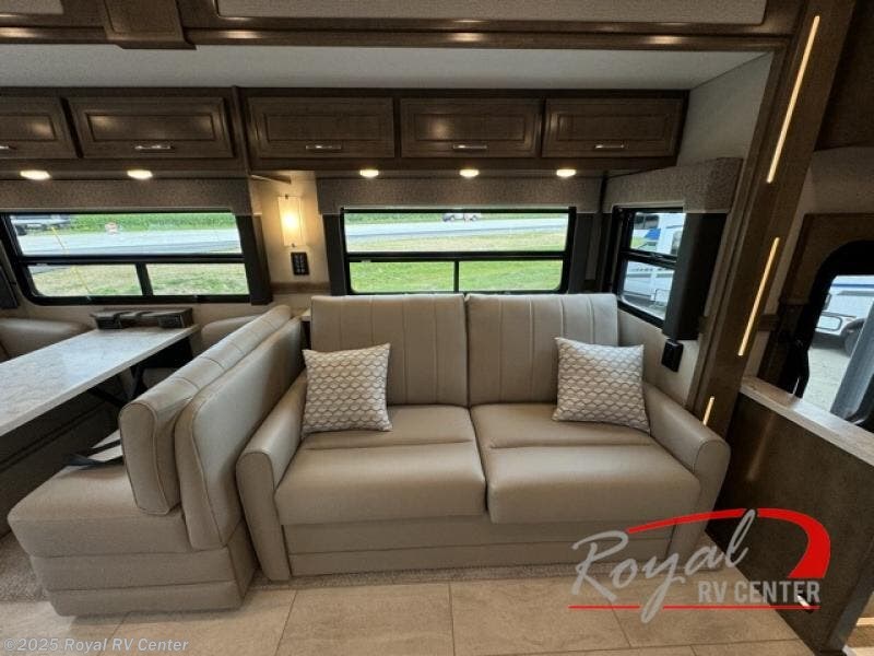 This Explorer Super C diesel motorhome is an advantageous coach that has all of the essentials and then some! With modern appliances and stylish décor, this coach stands out from the rest of the competition. The kitchen is packed full with an 18-cubic foot French door refrigerator, stainless steel convection microwave, and two-burner induction cooktop, and the full bathroom inside of the master suite has a shower skylight and LED vanity light. Out in the main living area, you will find a sofa sleeper so that you can relax at the end of a long and exhausting day, and you are also going to find a booth dinette right next to the sofa so that you can easily sit down with a hot meal each night.