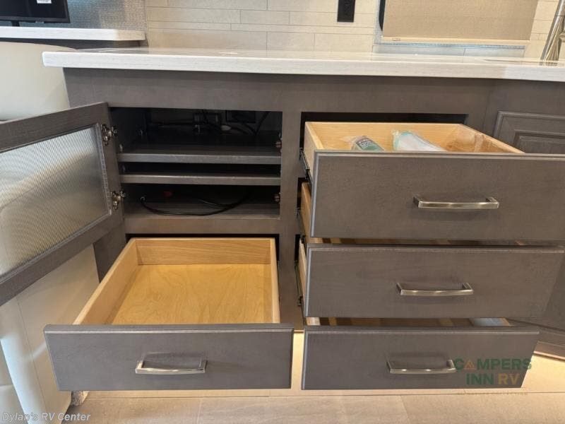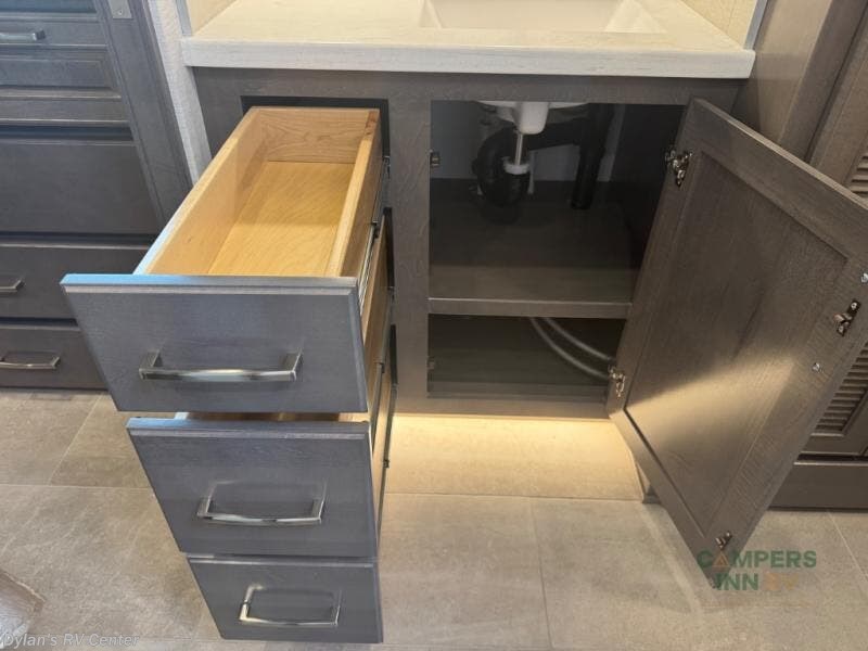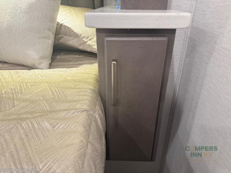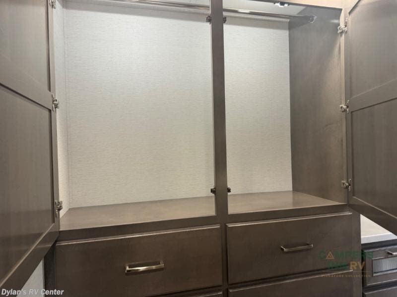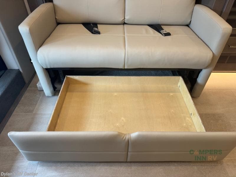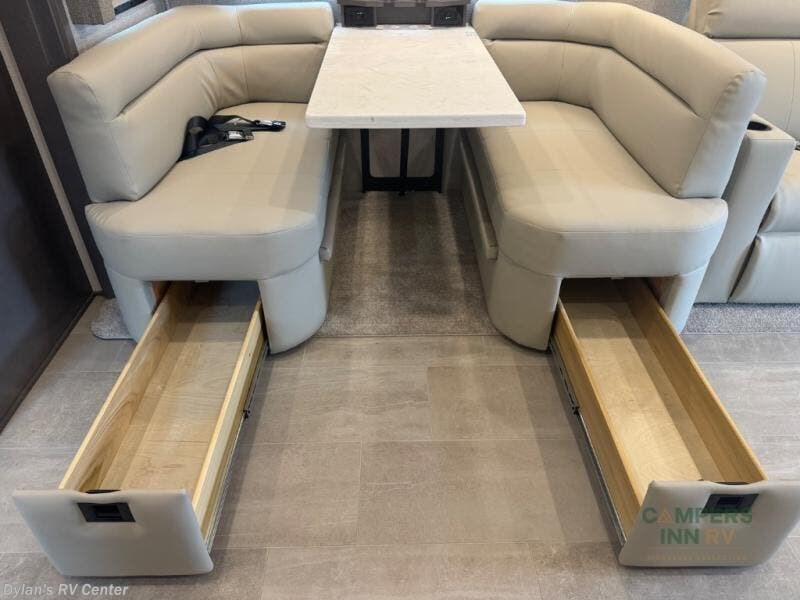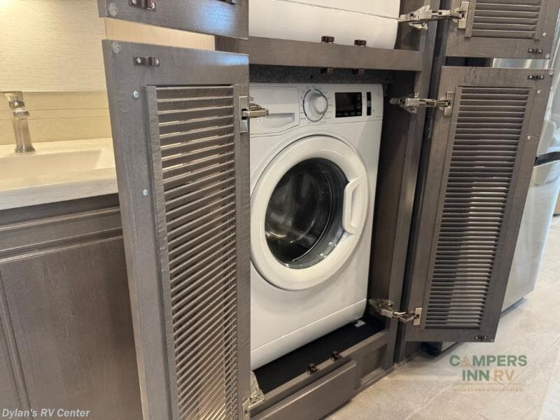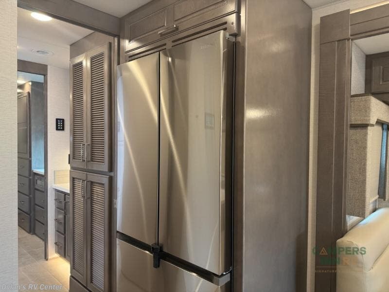 This family-friendly coach offers sleeping space for six when you convert the hide-a-bed sofa, the second sofa and the booth dinette. The triple slides open up the living area and bedroom giving everyone lots of floor space to move about during the day and at night. The rear bedroom offers a memory foam mattress, a wardrobe and a 32" Smart LED TV. You will surely appreciate the split-style bathroom when trying to quickly get ready to shop in town or prepare for bed. You can make meals for everyone using the recessed two burner induction cooktop and convection microwave, and will also appreciate 18 cu. ft. French door residential refrigerator with stainless steel doors.