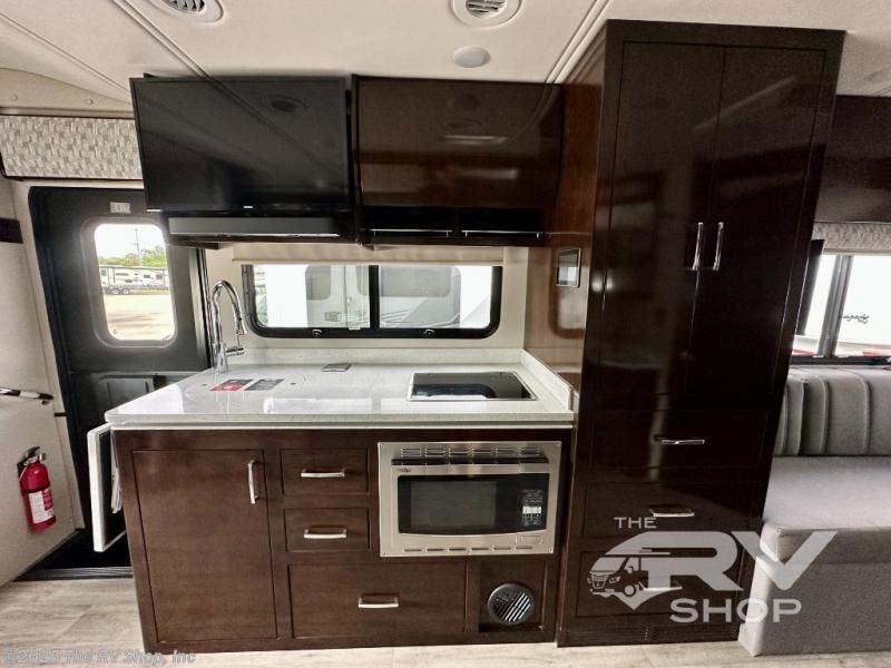 You will appreciate the versatility of this motorhome! Relax on the jiffy sofa during the day, then enjoy a restful night's sleep on the Murphy bed. A cozy L-shaped sofa is tucked in the rear corner and features storage beneath. The rear corner bath includes a sink outside the door for flexible use. The kitchen features an 8 cu. ft. refrigerator, microwave, and pantry, plus a closet to store miscellaneous items. And with a 46" x 80" bunk mattress above the cab, another person can join in on the fun!