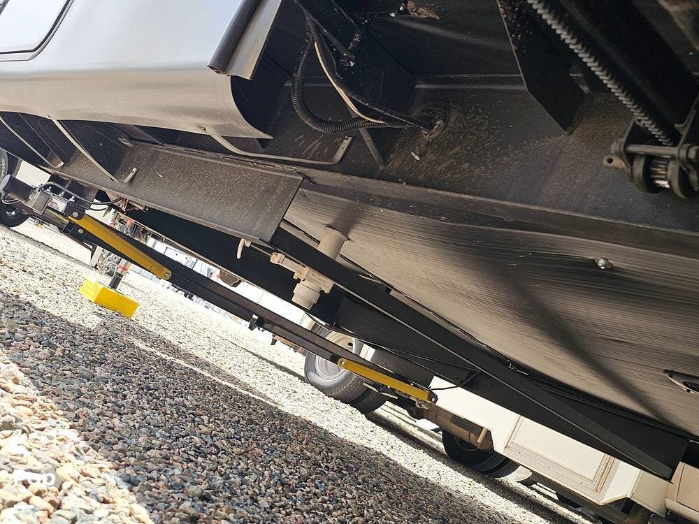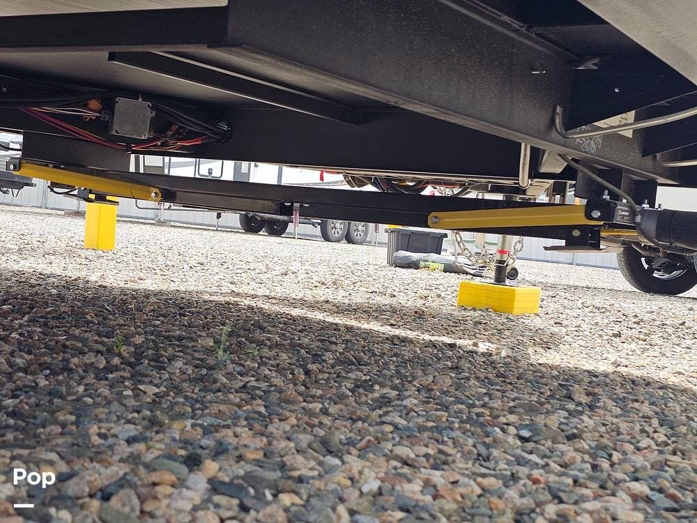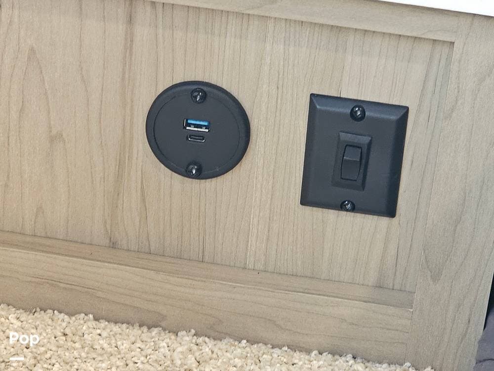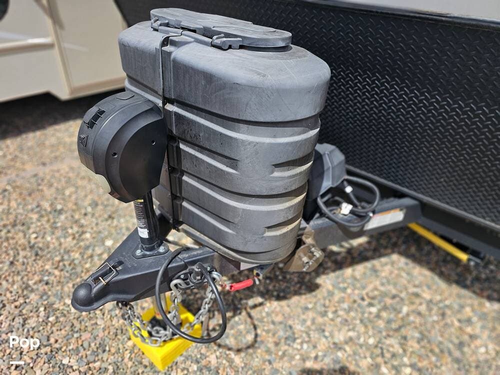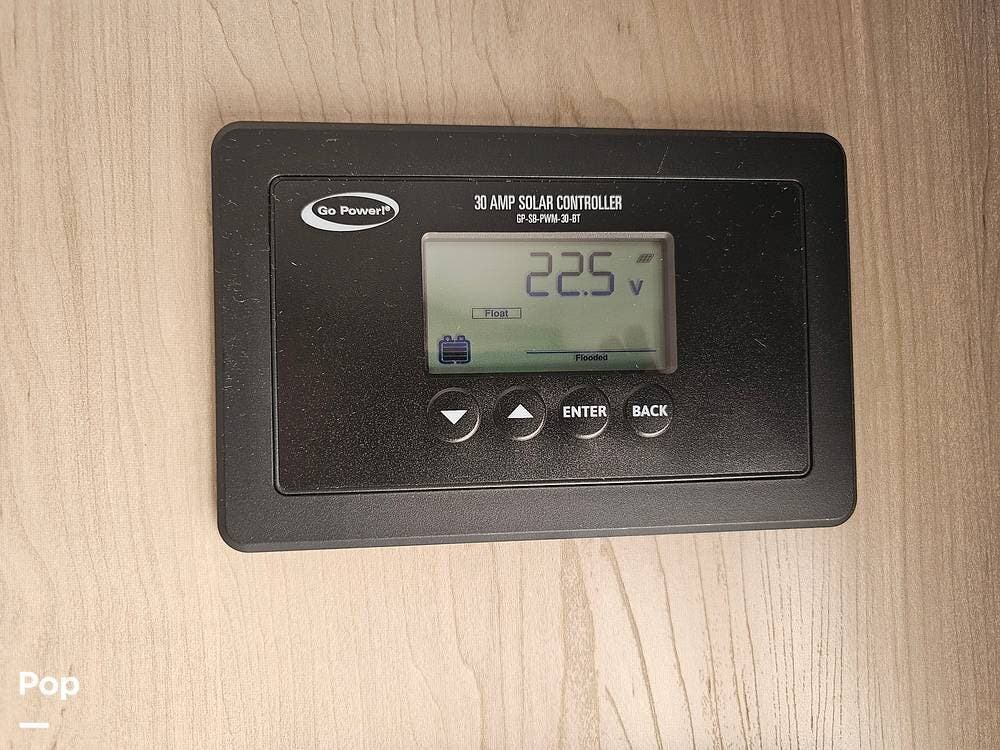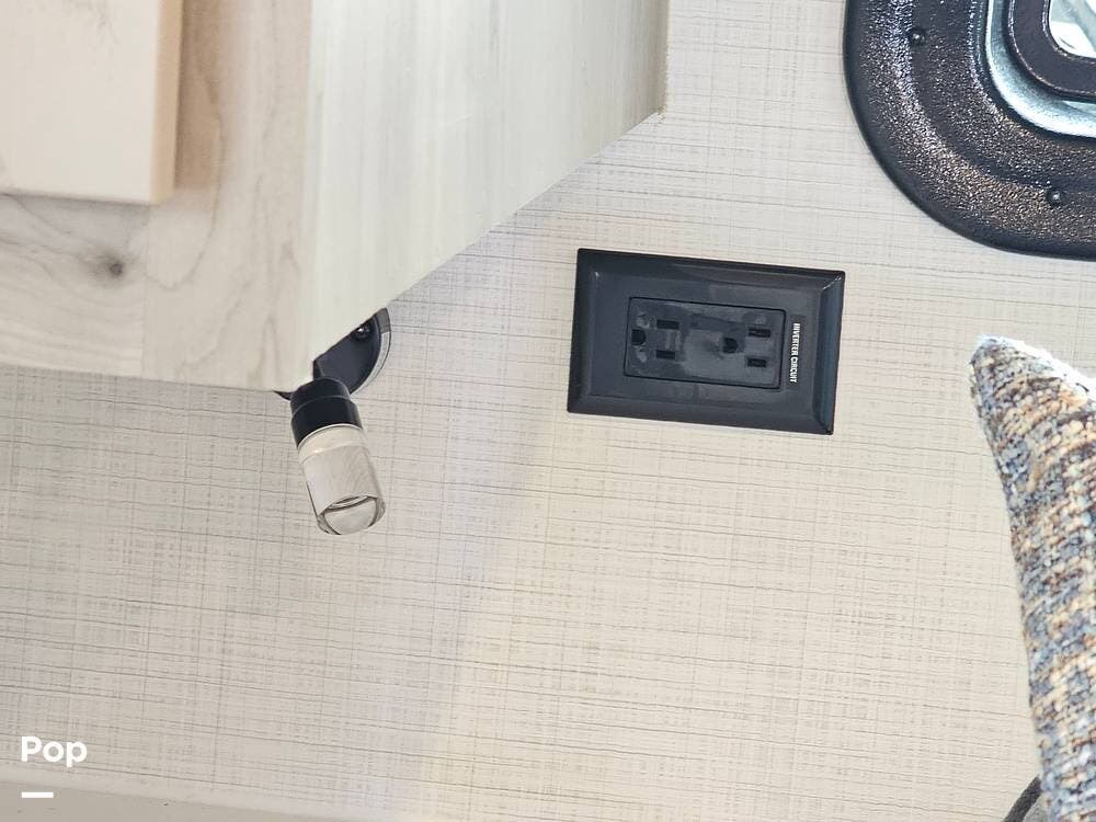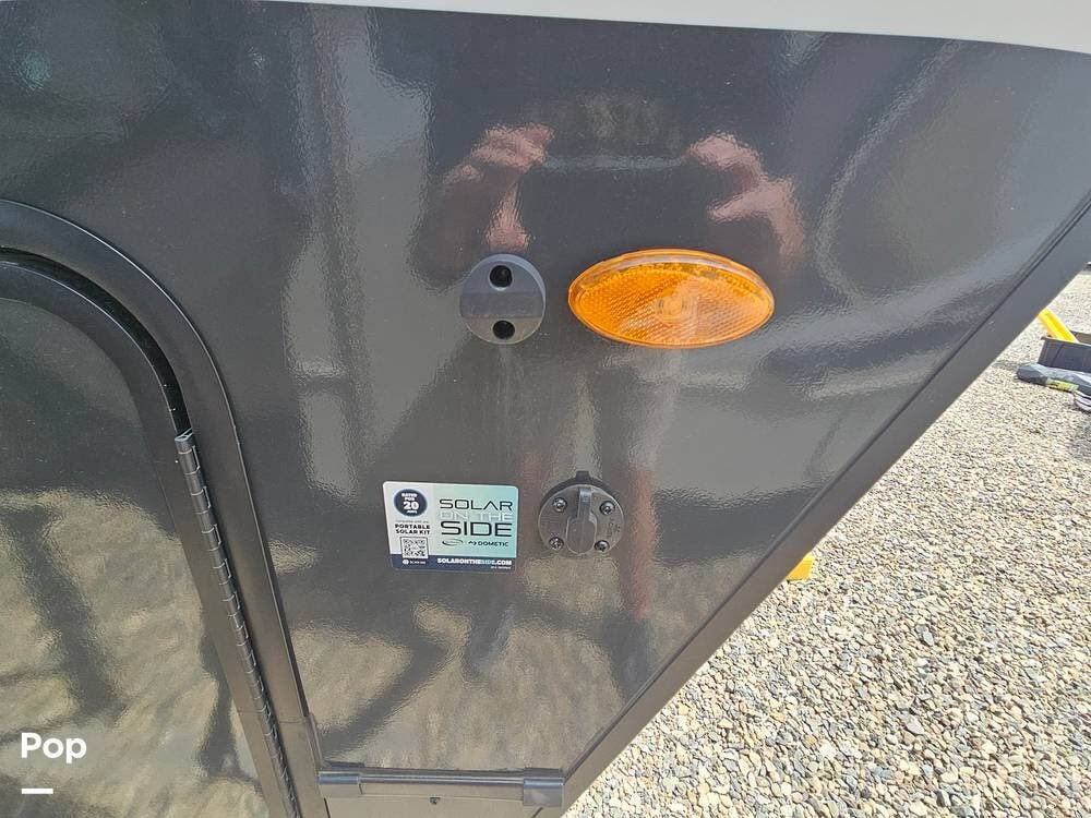 Additional amenities include a Bluetooth stereo system, USB charging ports, 400 watts of solar panels, and a 1,800 watt inverter, supporting modern connectivity and off-grid capabilities. This one also includes powered stabilizer jacks, and a weight distributing hitch.