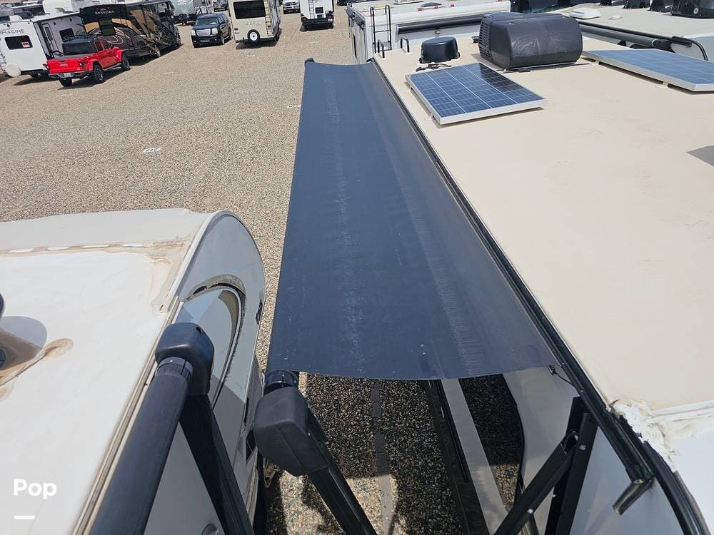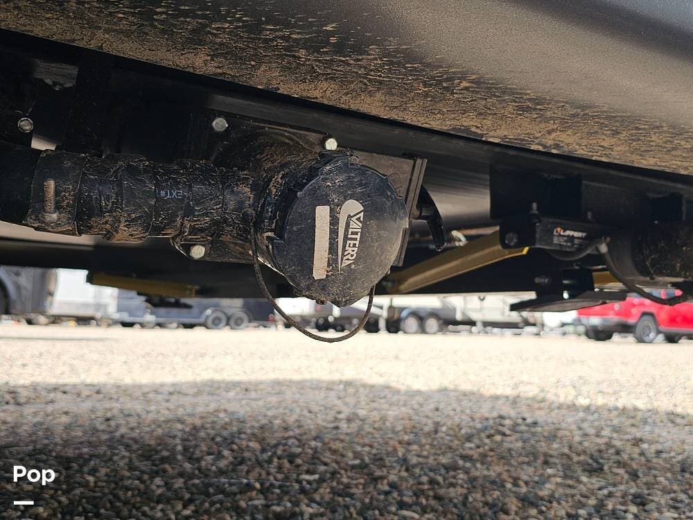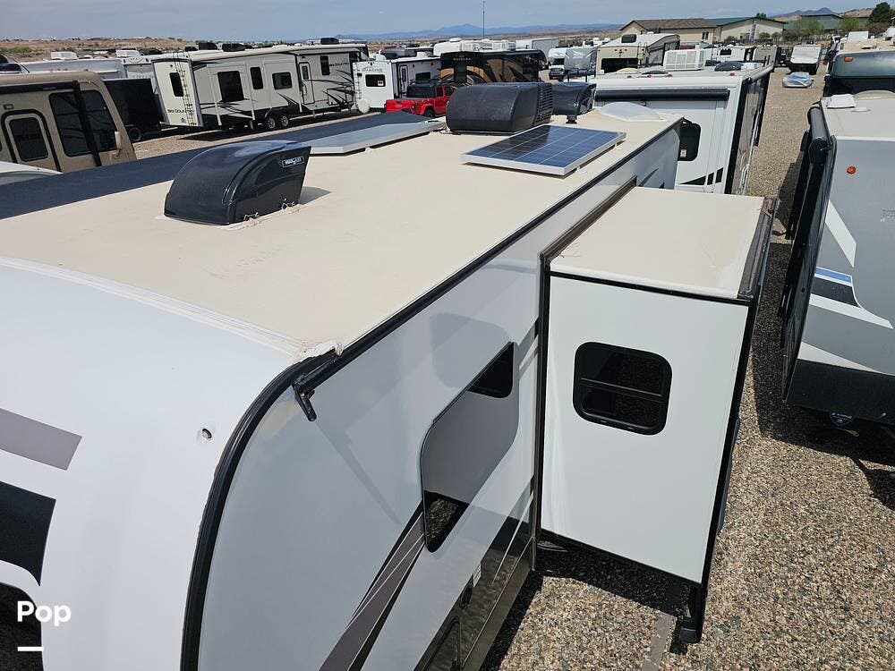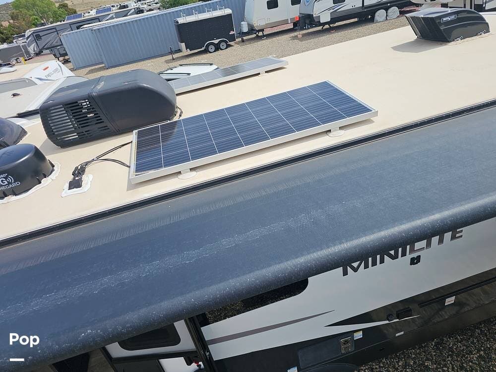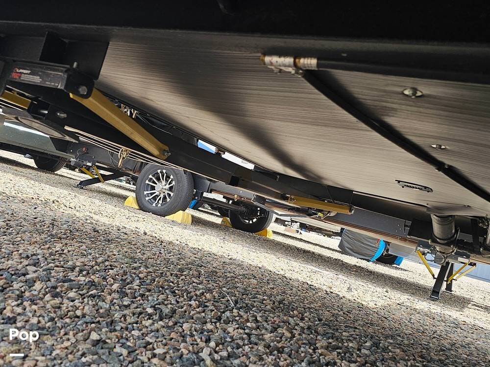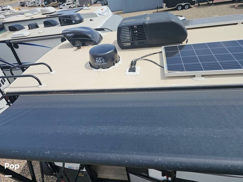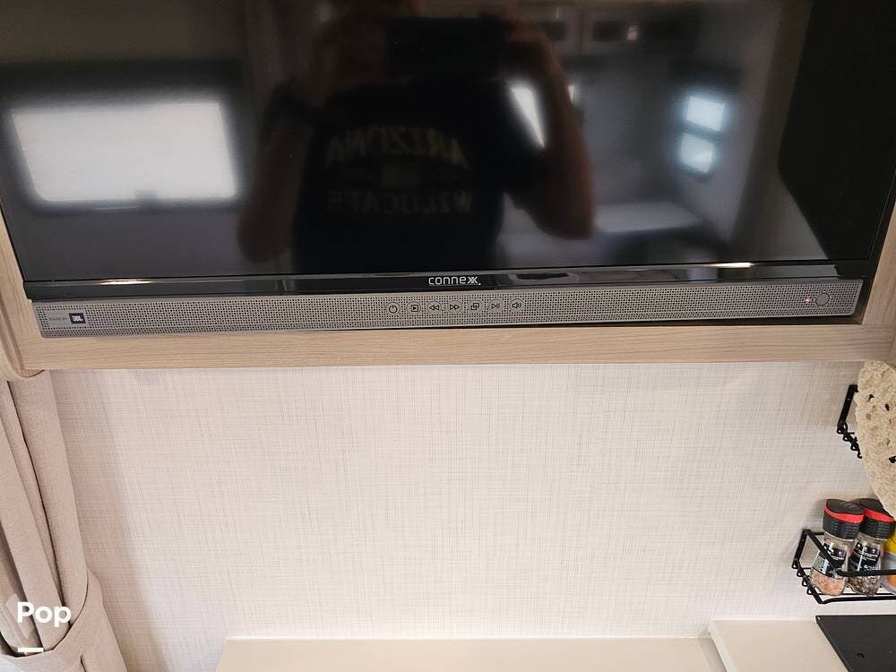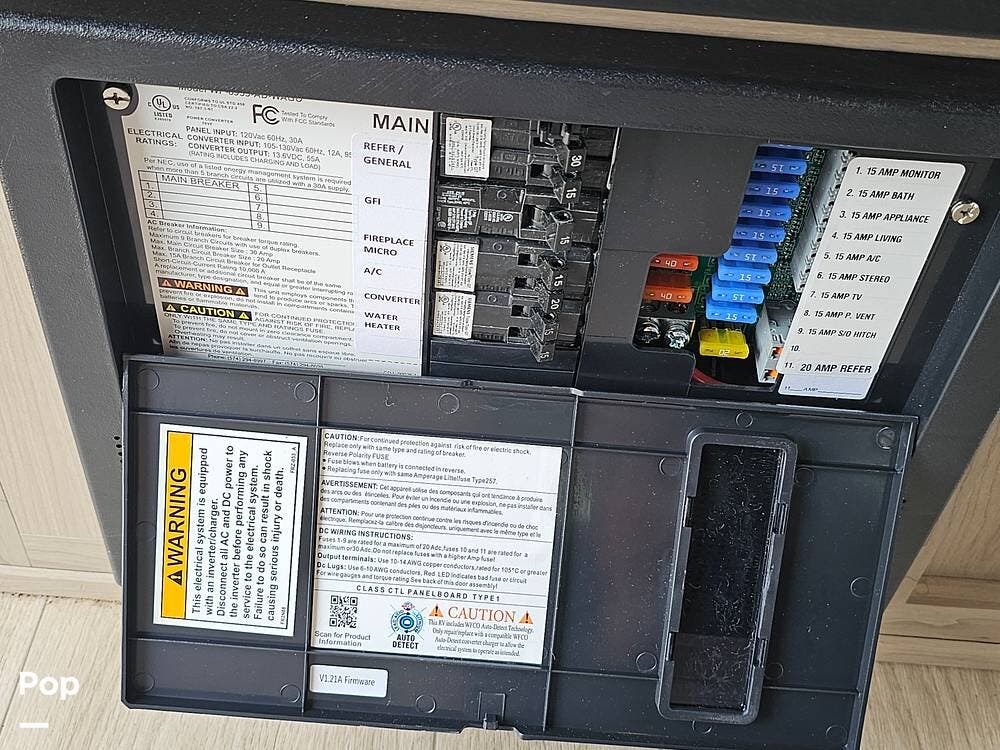 Additional amenities include a Bluetooth stereo system, USB charging ports, 400 watts of solar panels, and a 1,800 watt inverter, supporting modern connectivity and off-grid capabilities. This one also includes powered stabilizer jacks, and a weight distributing hitch.