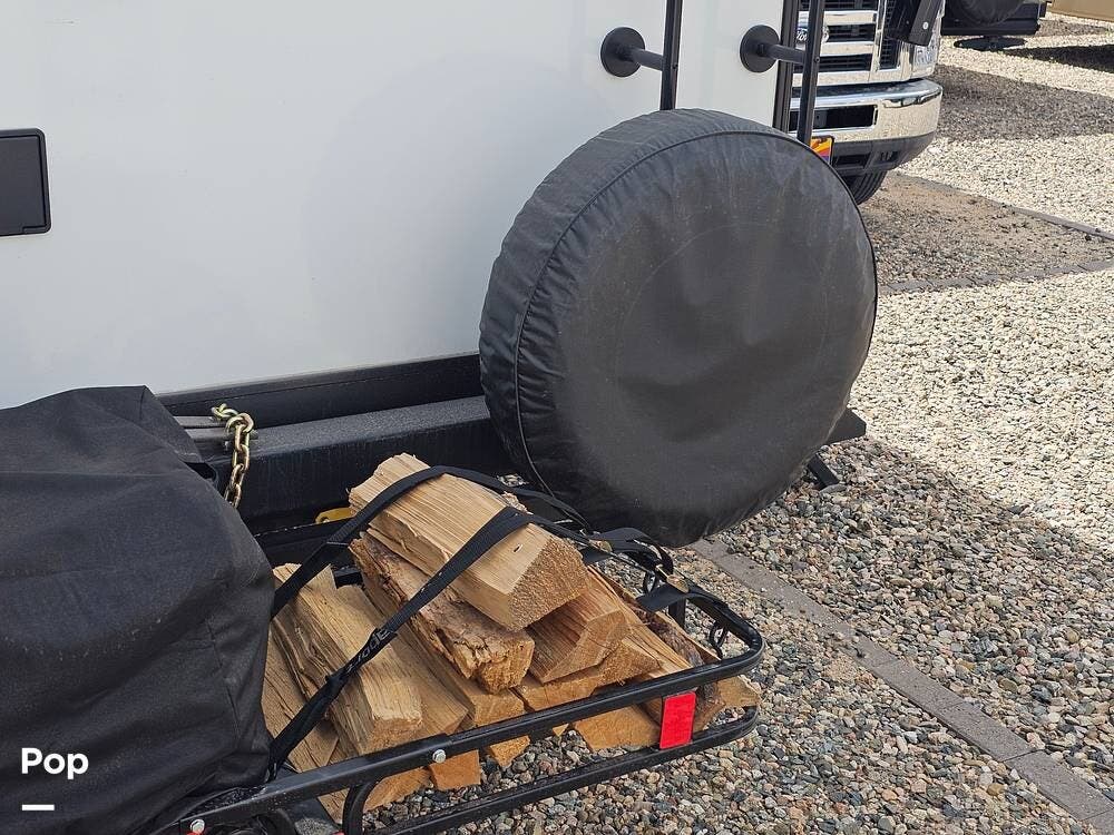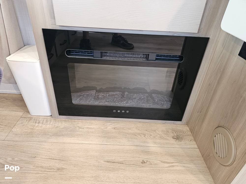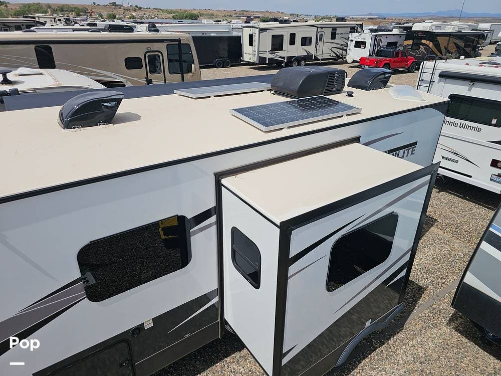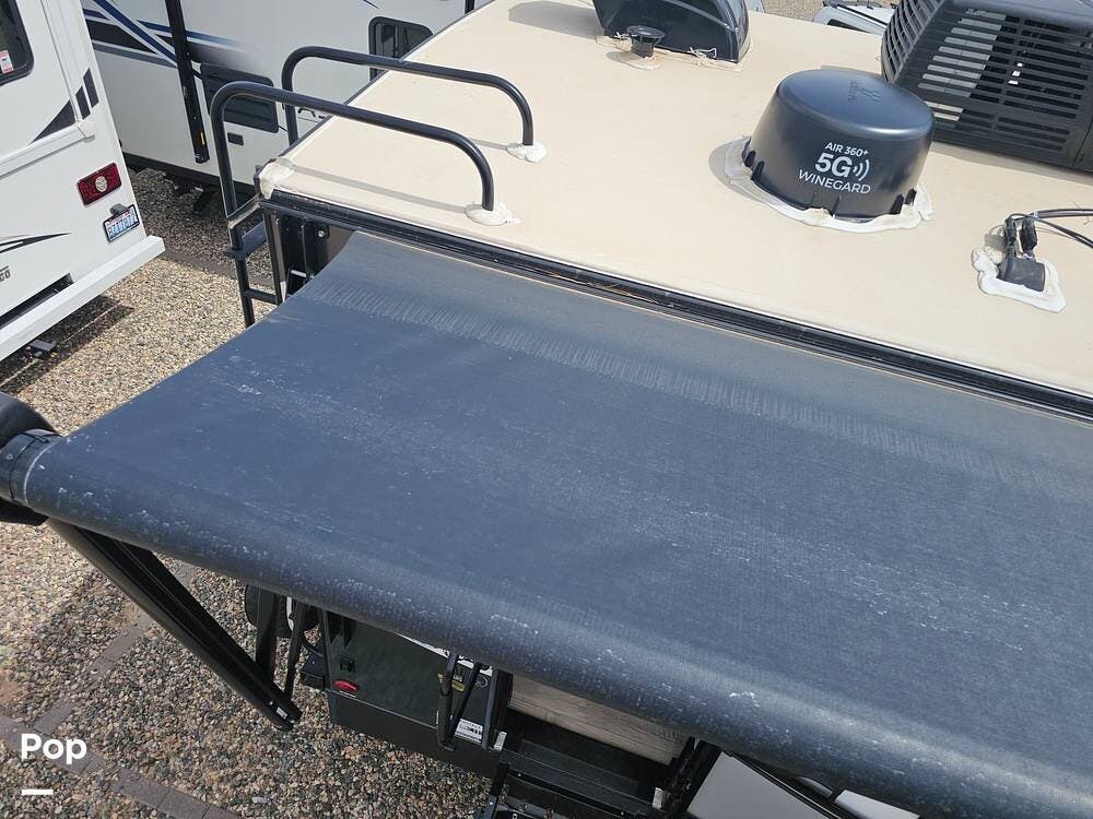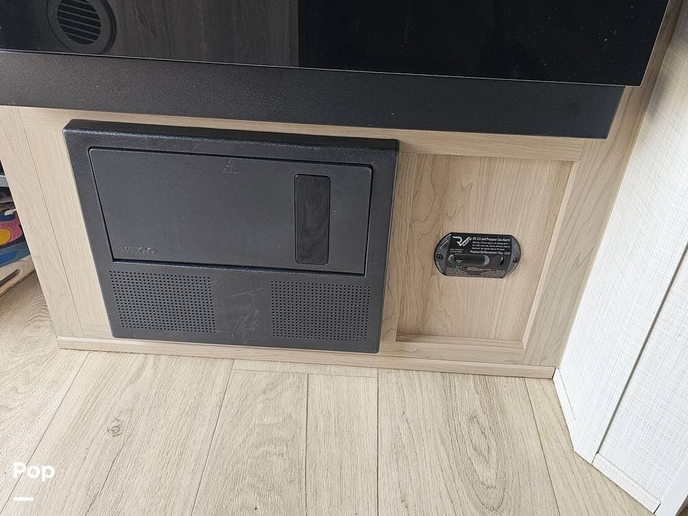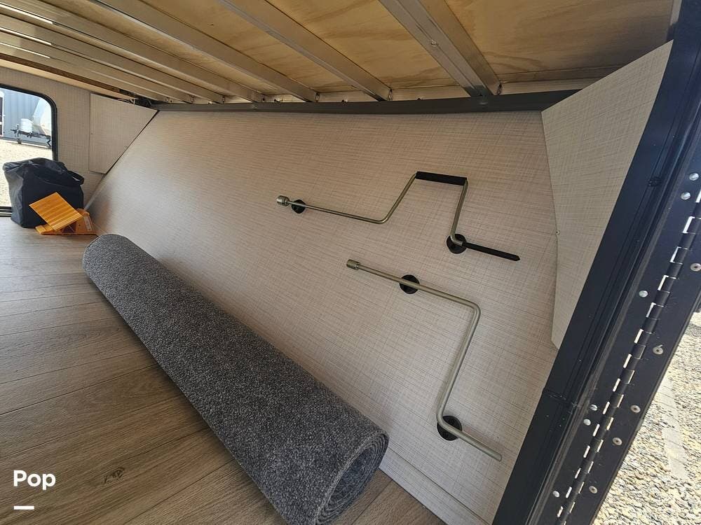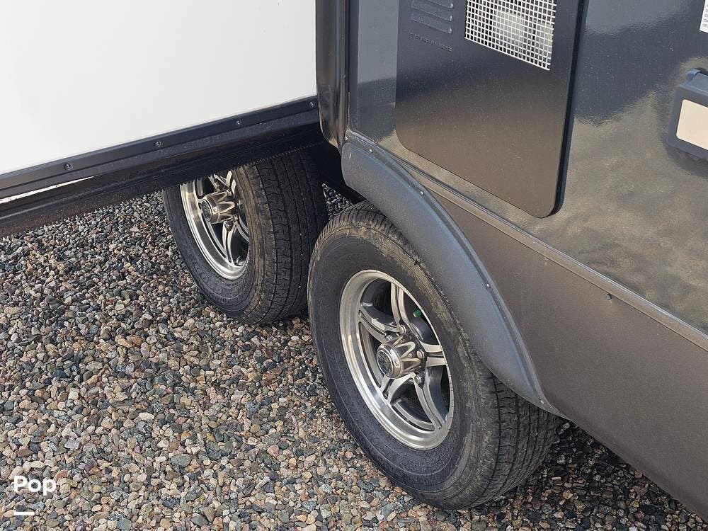 Additional amenities include a Bluetooth stereo system, USB charging ports, 400 watts of solar panels, and a 1,800 watt inverter, supporting modern connectivity and off-grid capabilities. This one also includes powered stabilizer jacks, and a weight distributing hitch.