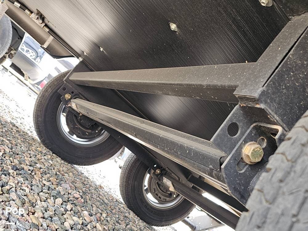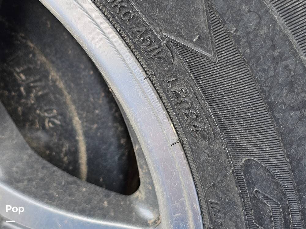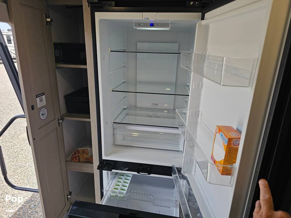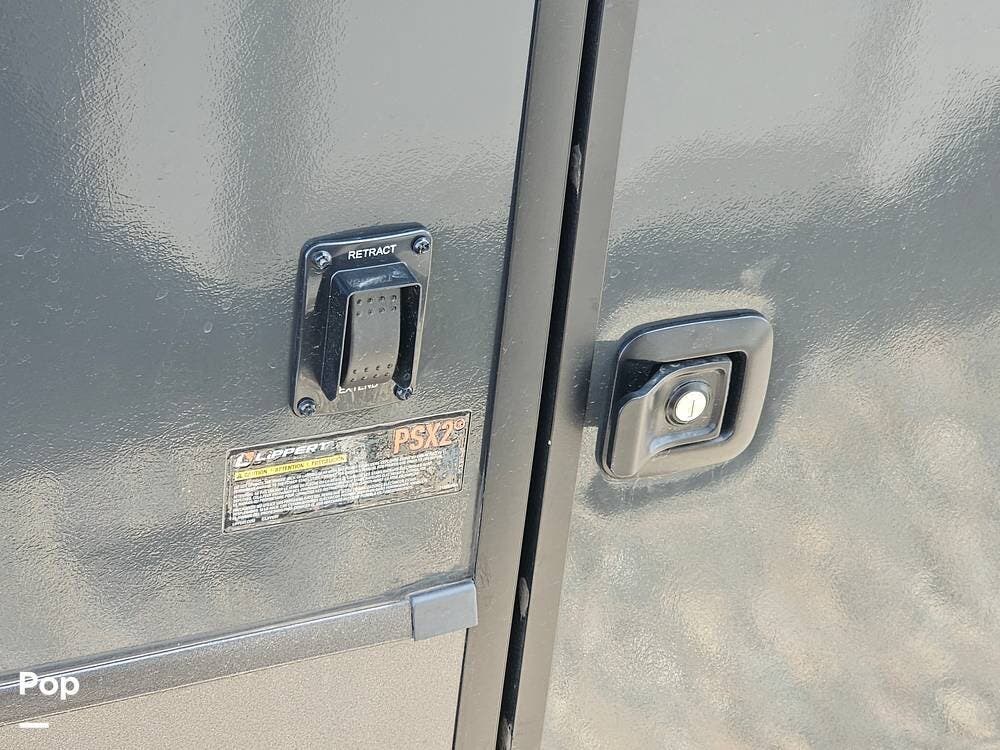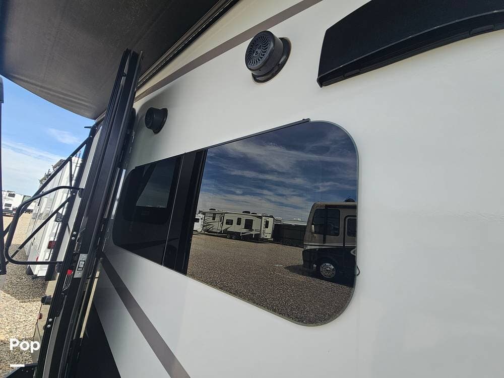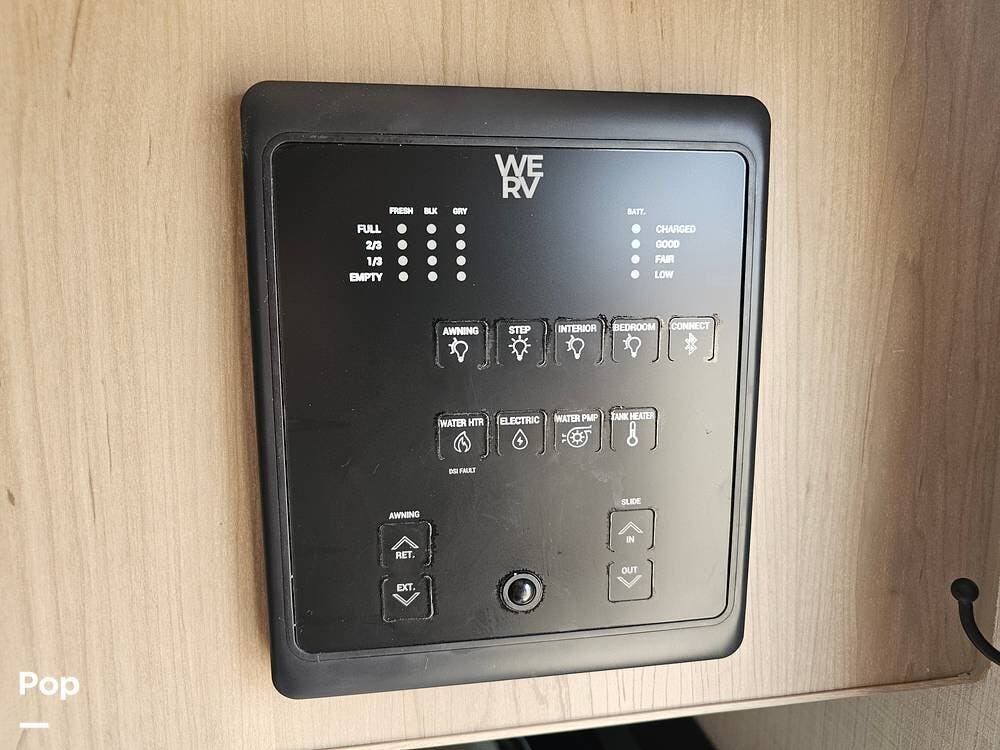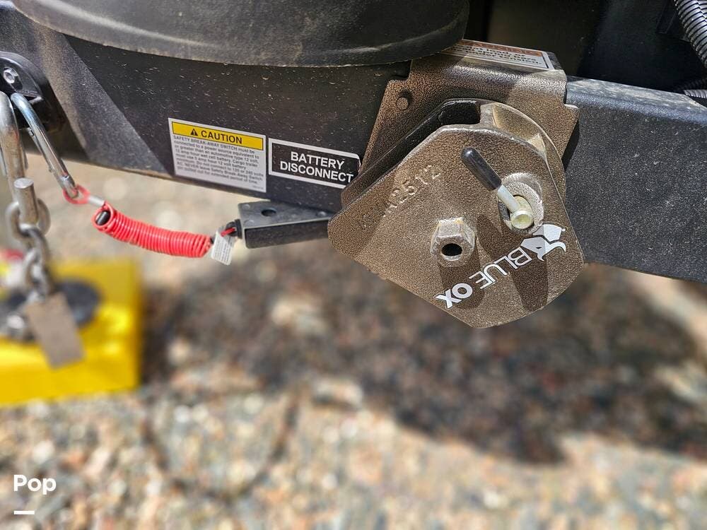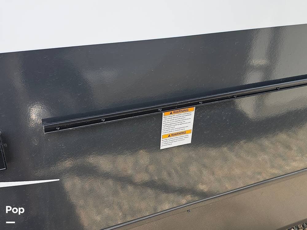 Additional amenities include a Bluetooth stereo system, USB charging ports, 400 watts of solar panels, and a 1,800 watt inverter, supporting modern connectivity and off-grid capabilities. This one also includes powered stabilizer jacks, and a weight distributing hitch.