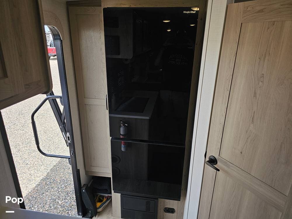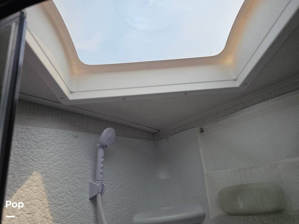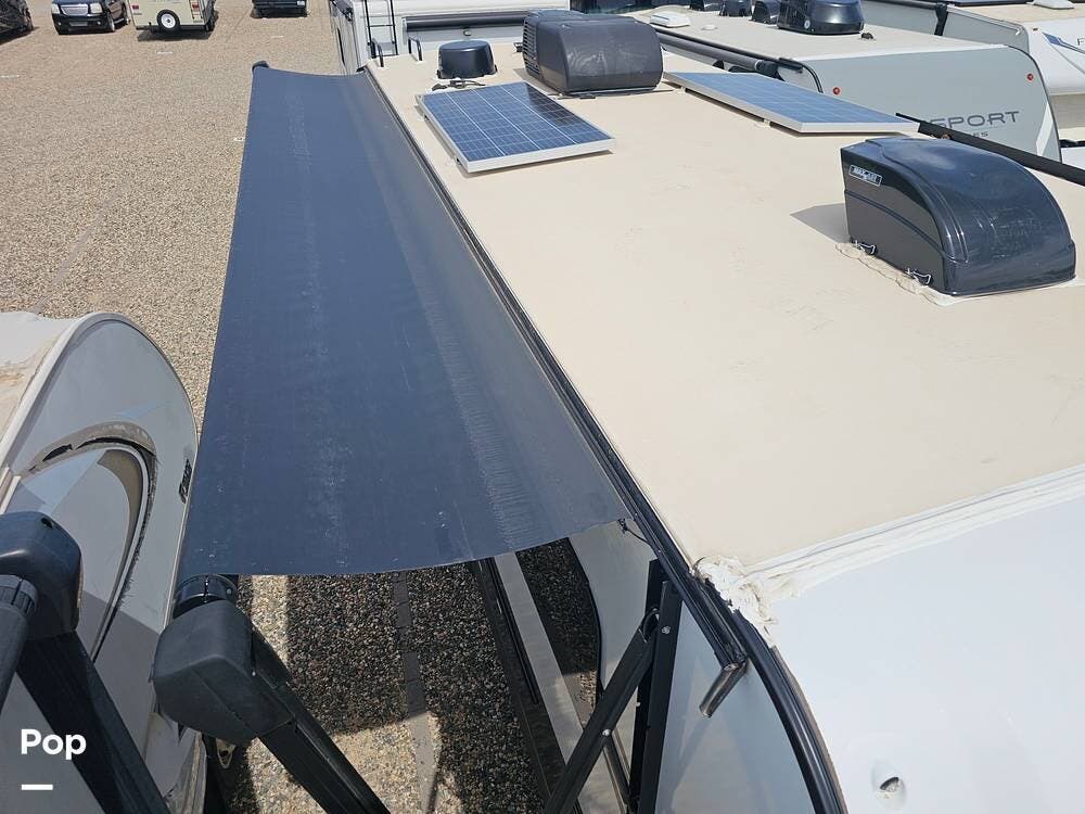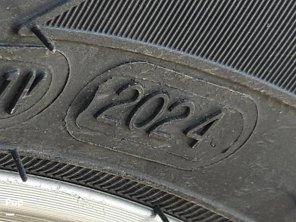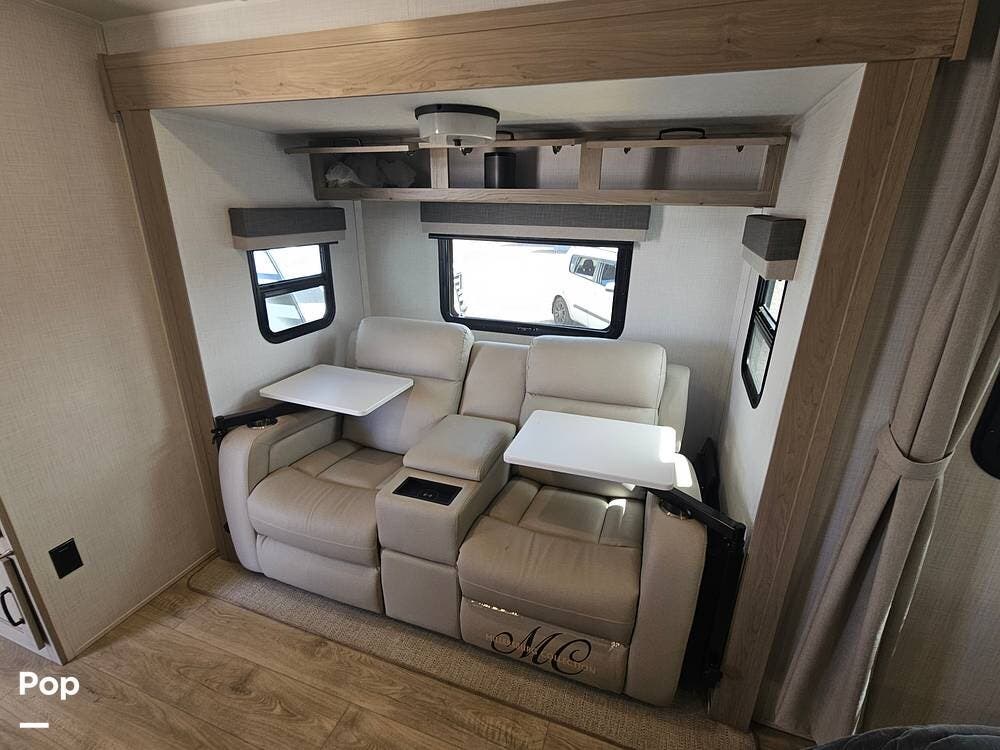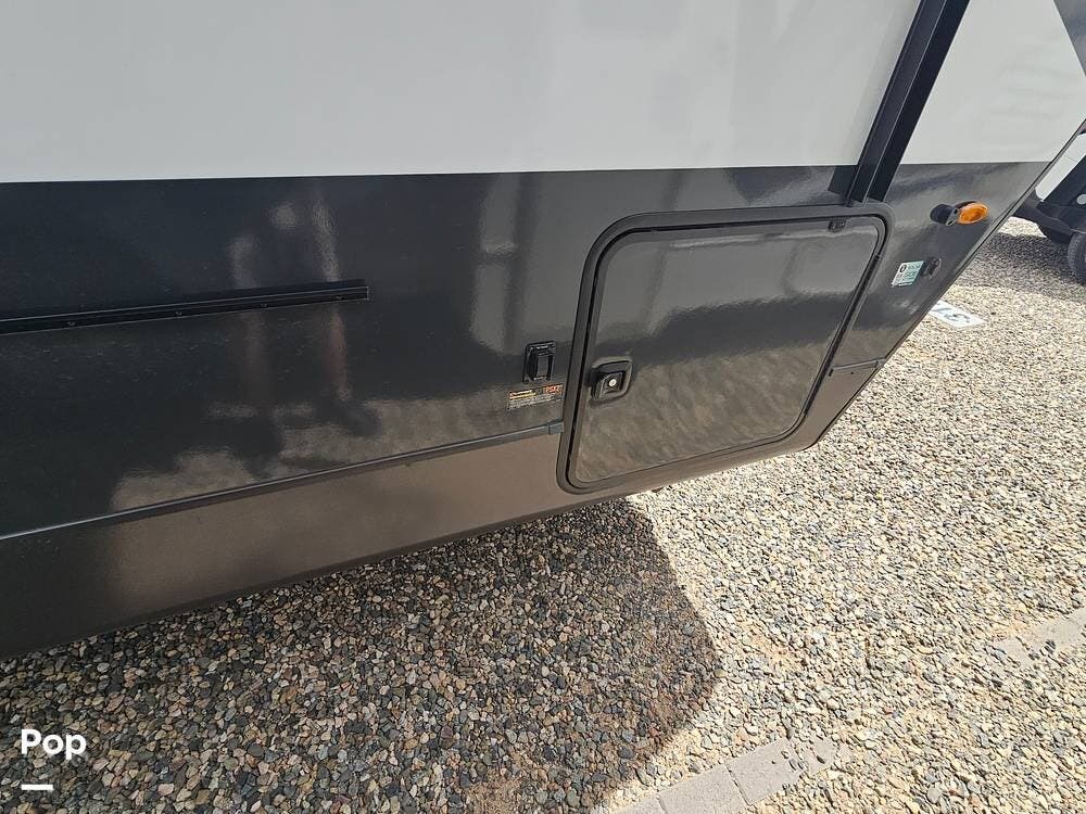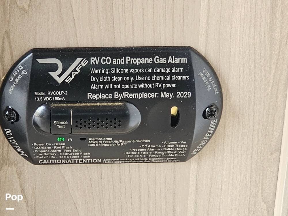Additional amenities include a Bluetooth stereo system, USB charging ports, 400 watts of solar panels, and a 1,800 watt inverter, supporting modern connectivity and off-grid capabilities. This one also includes powered stabilizer jacks, and a weight distributing hitch.