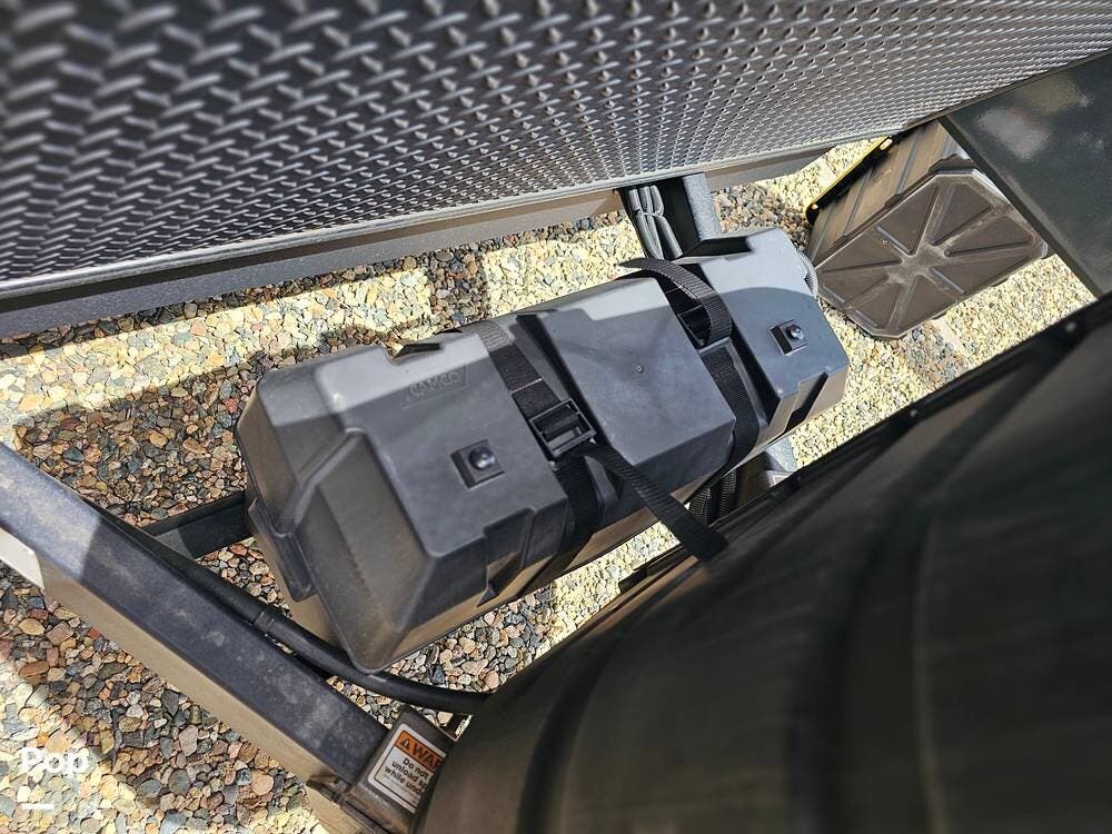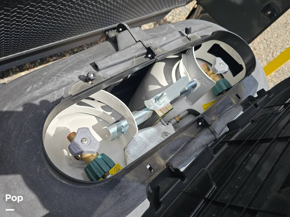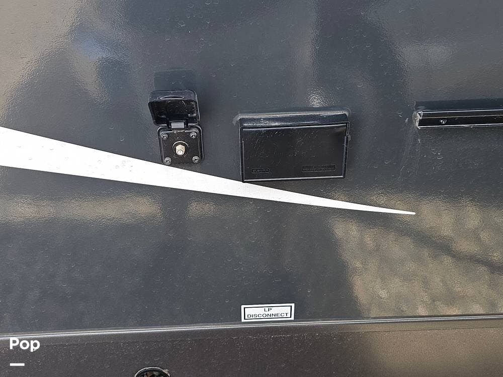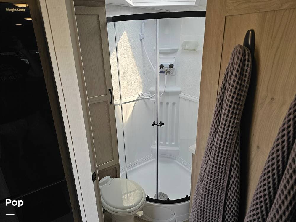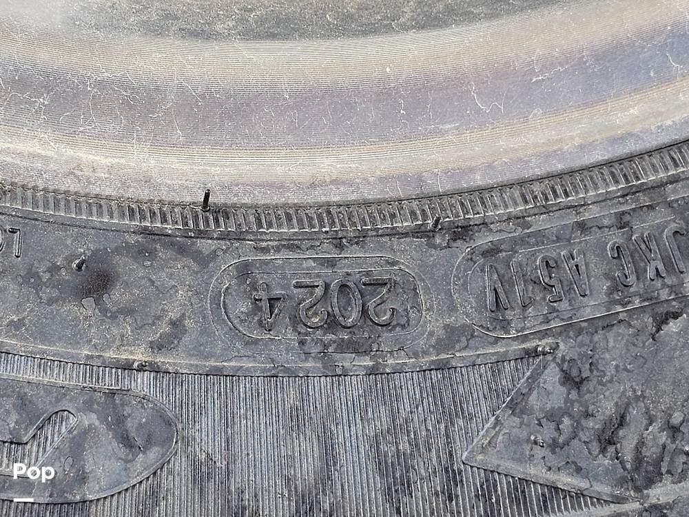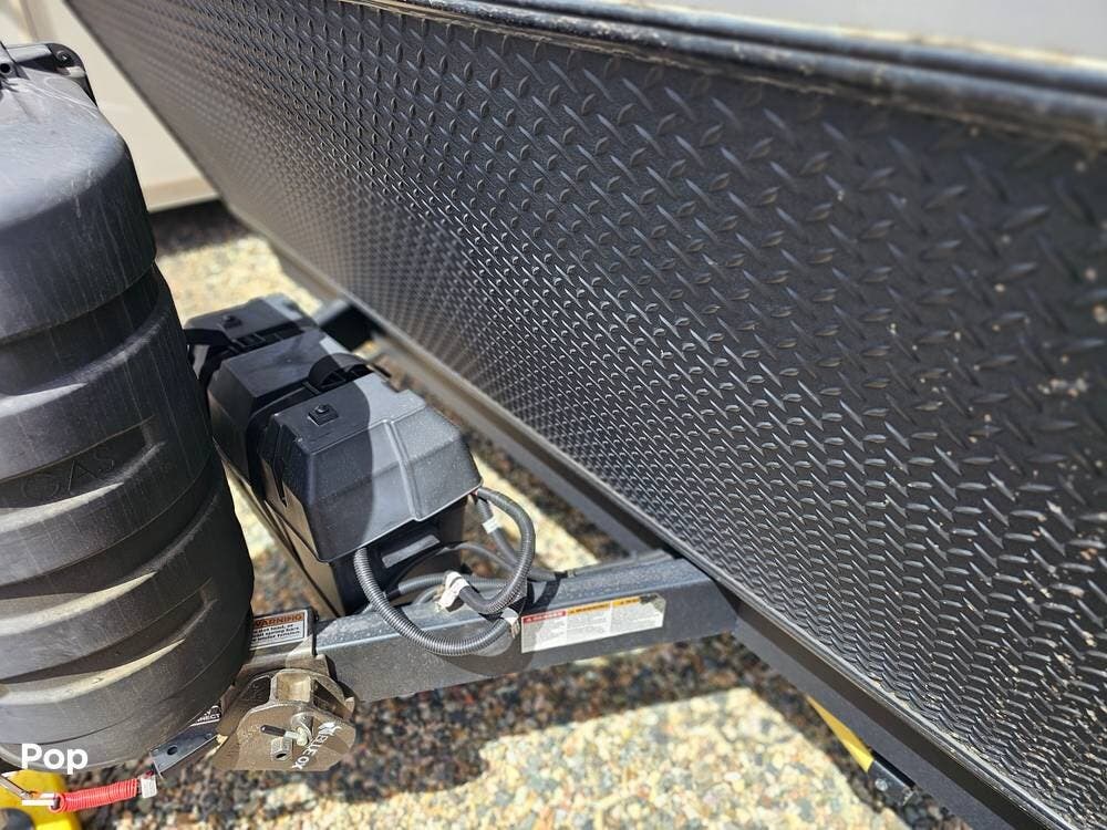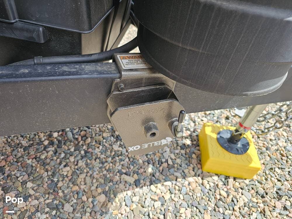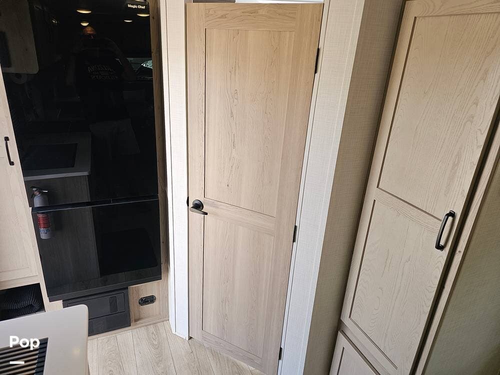 Additional amenities include a Bluetooth stereo system, USB charging ports, 400 watts of solar panels, and a 1,800 watt inverter, supporting modern connectivity and off-grid capabilities. This one also includes powered stabilizer jacks, and a weight distributing hitch.