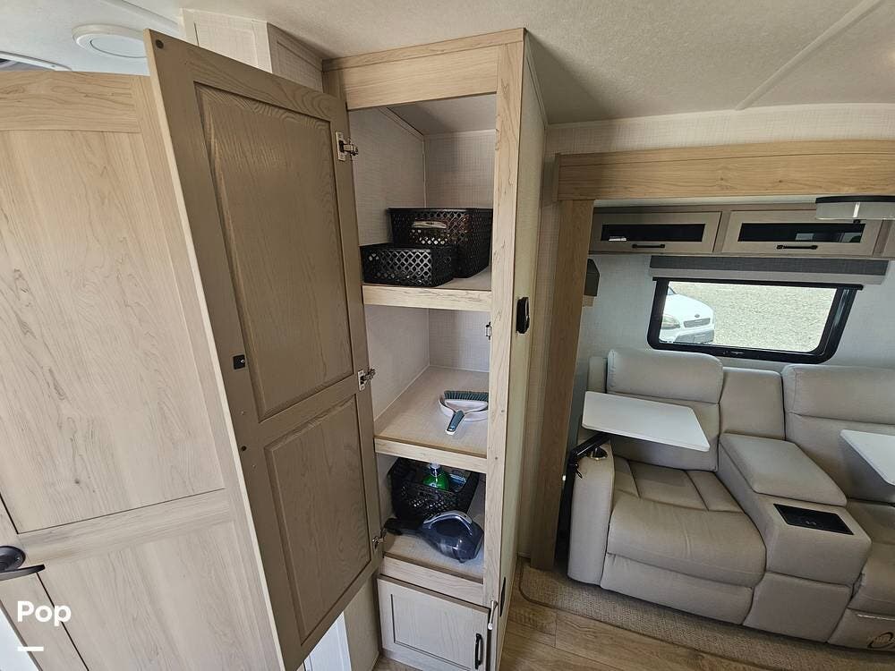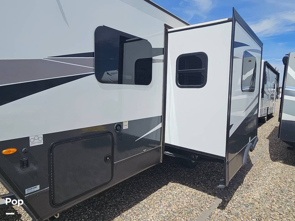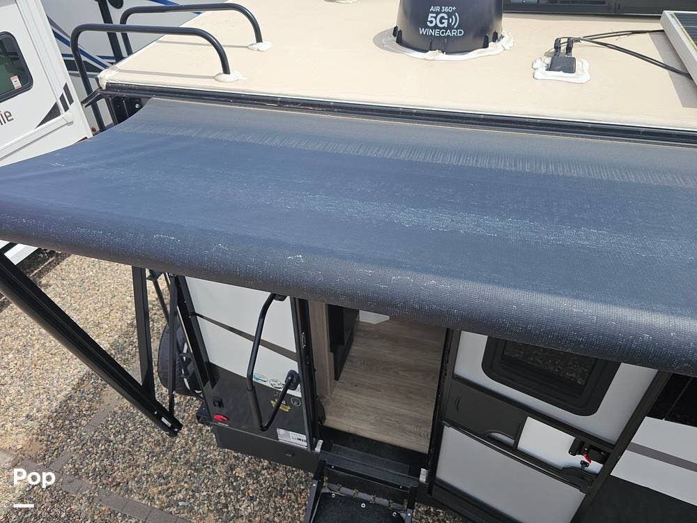 The exterior features an aerodynamic profile with fiberglass siding, enhancing both aesthetics and durability. It is equipped with a power tongue jack, LED lighting, and an awning with integrated LED lights, providing ease of setup and outdoor comfort.