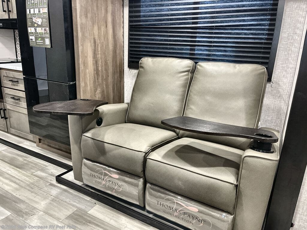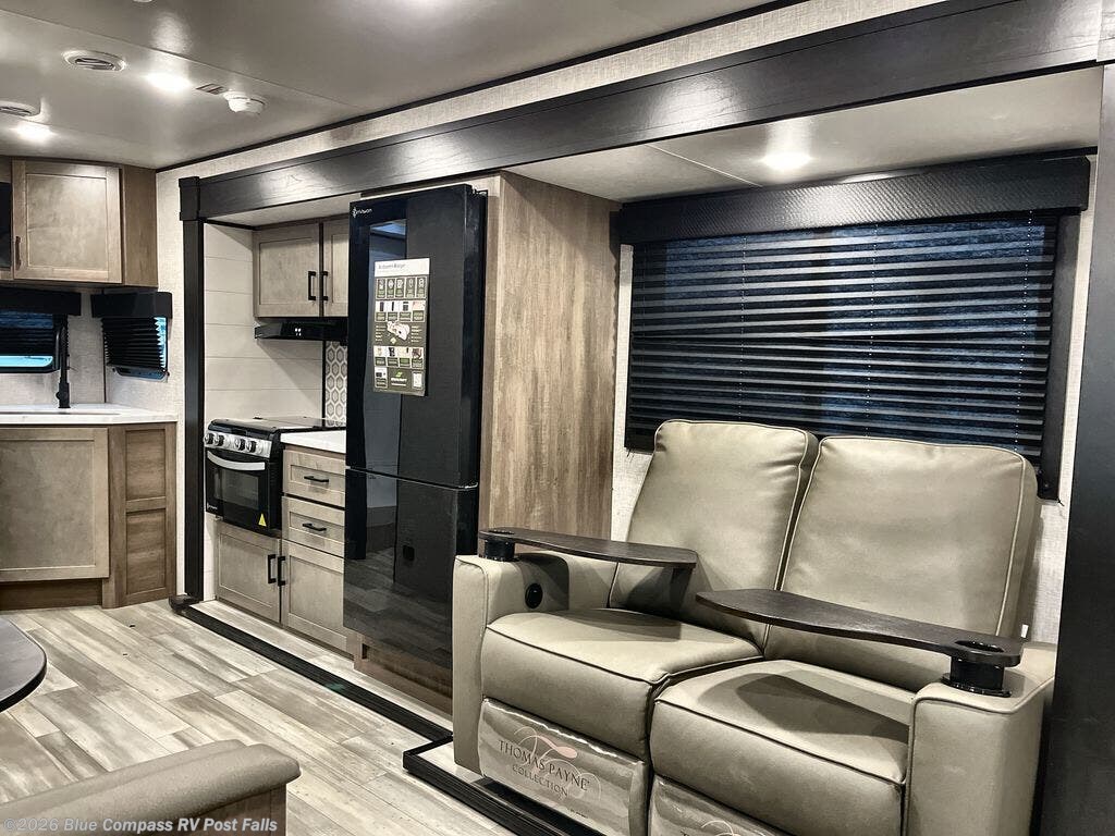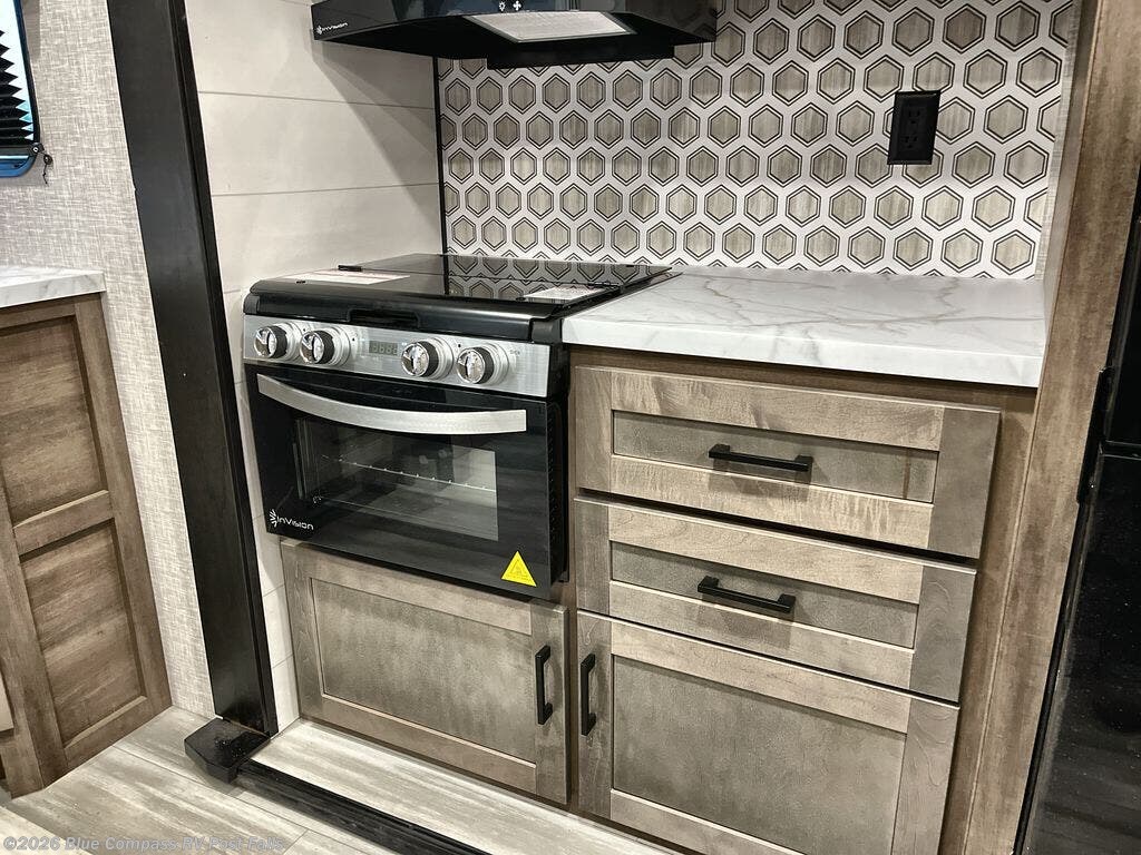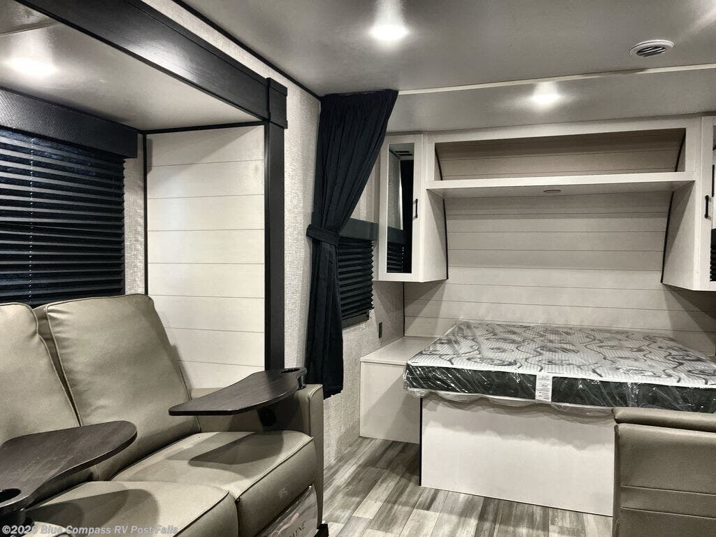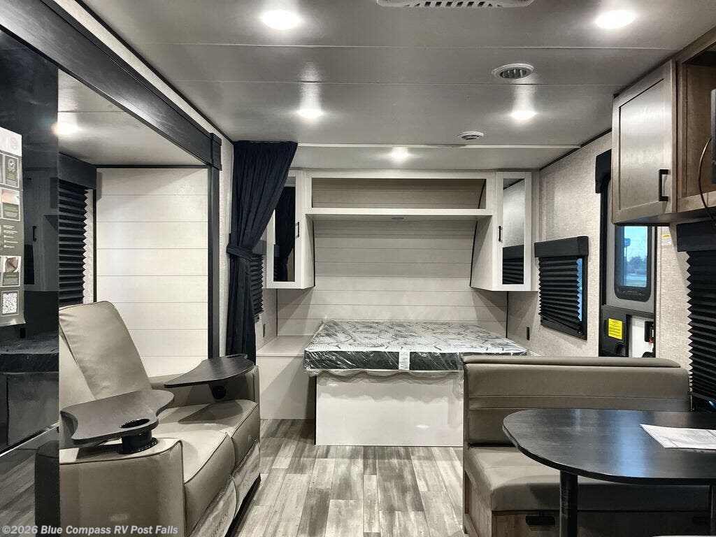 You'll love the amount of space you have in this travel trailer thanks to the large slide out. Here, you'll find theater seating, a three burner range with countertop space, plus an 8 cu. ft. 12V refrigerator. There is additional counter space by the rear corner sink, along with overhead cabinets for kitchen knickknacks. A booth dinette provides a place to dine inside when you don't want to sit outdoors under the 18' power awning. You'll feel right at home in the front bedroom that includes a walk-around bed, dual wardrobes, and a privacy curtain!