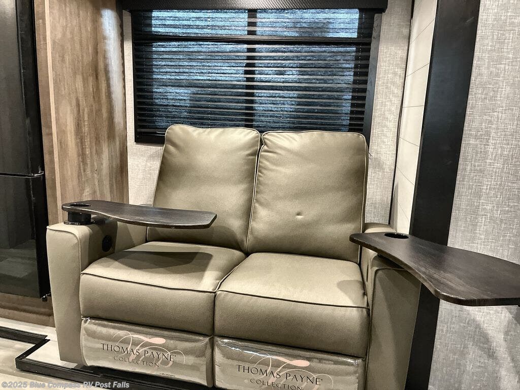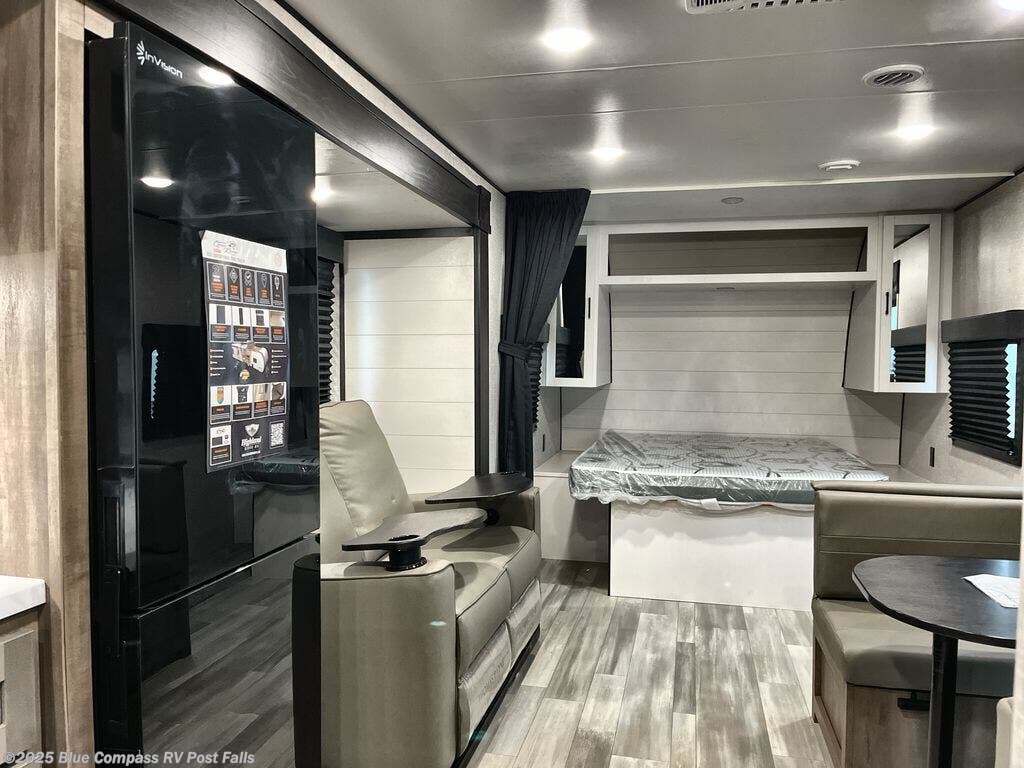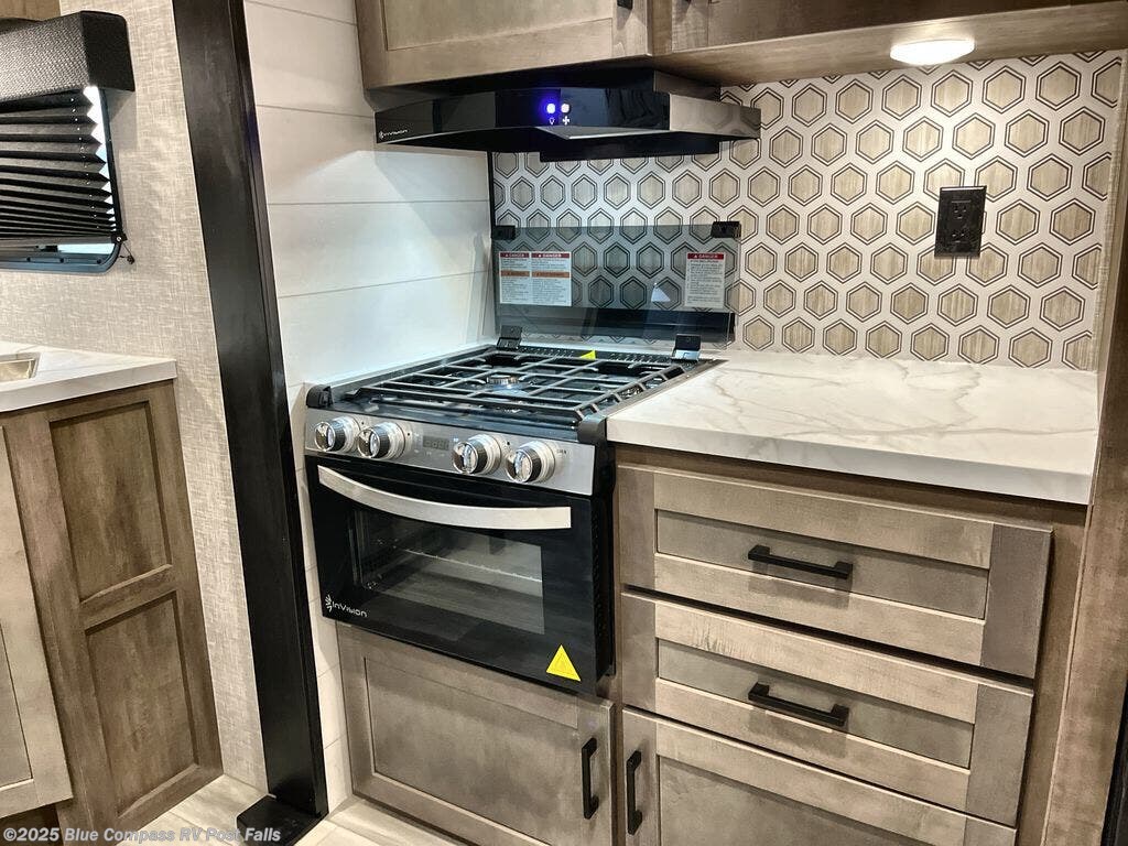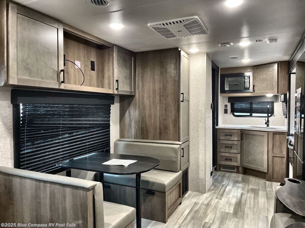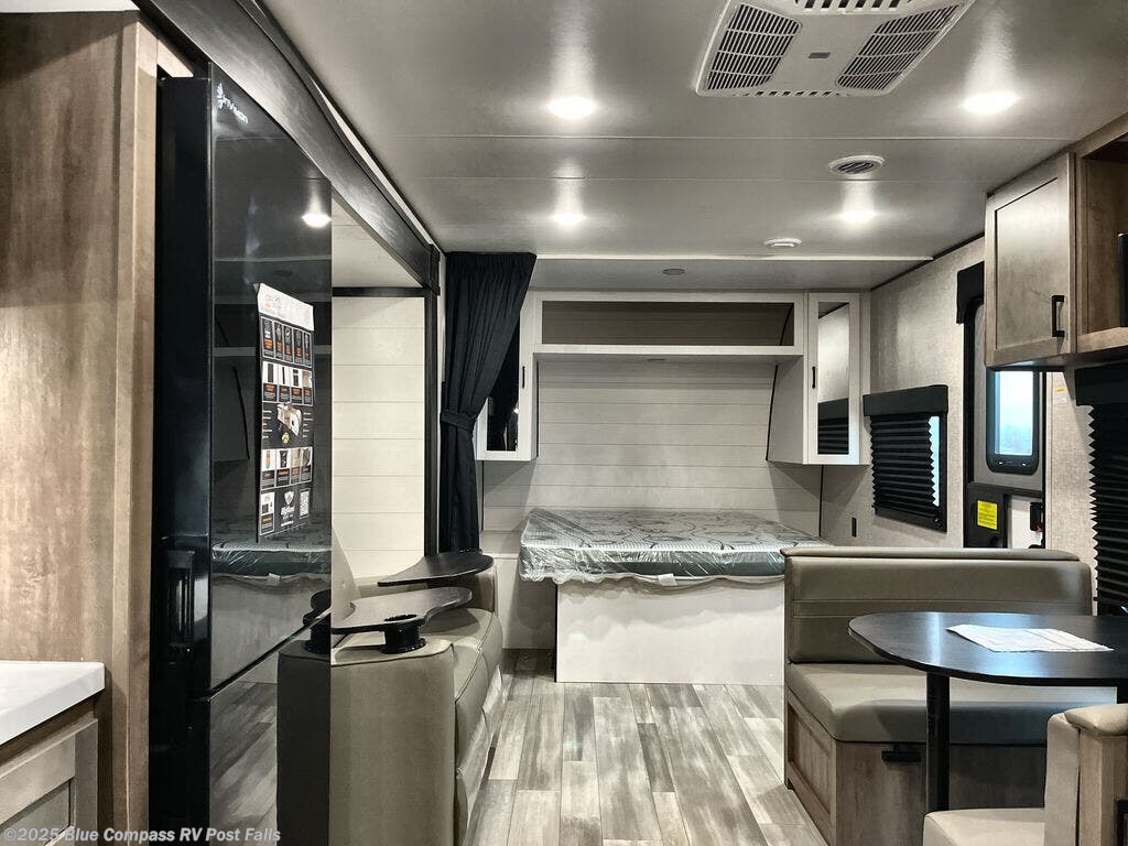 You'll love the amount of space you have in this travel trailer thanks to the large slide out. Here, you'll find theater seating, a three burner range with countertop space, plus an 8 cu. ft. 12V refrigerator. There is additional counter space by the rear corner sink, along with overhead cabinets for kitchen knickknacks. A booth dinette provides a place to dine inside when you don't want to sit outdoors under the 18' power awning. You'll feel right at home in the front bedroom that includes a walk-around bed, dual wardrobes, and a privacy curtain!