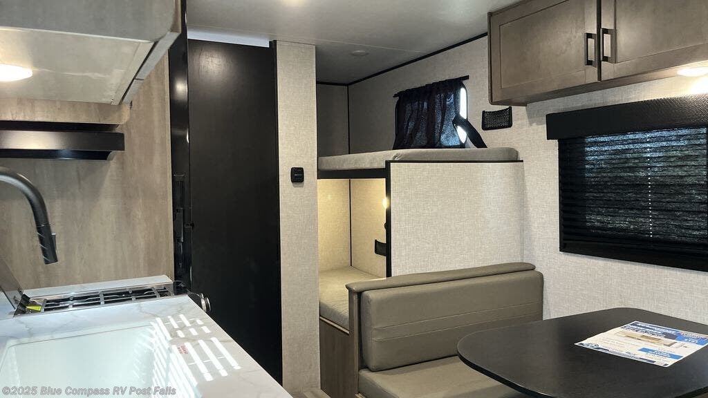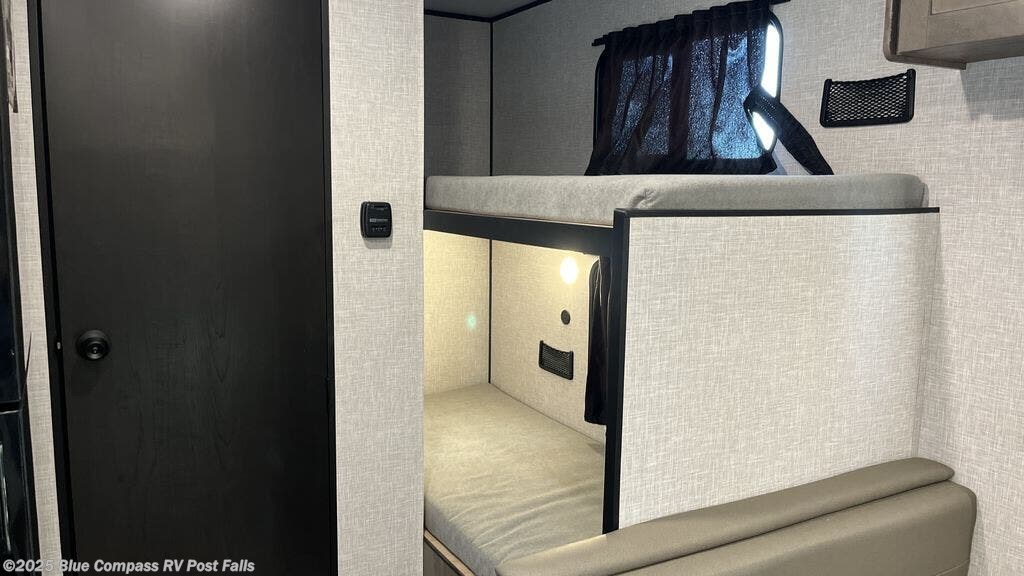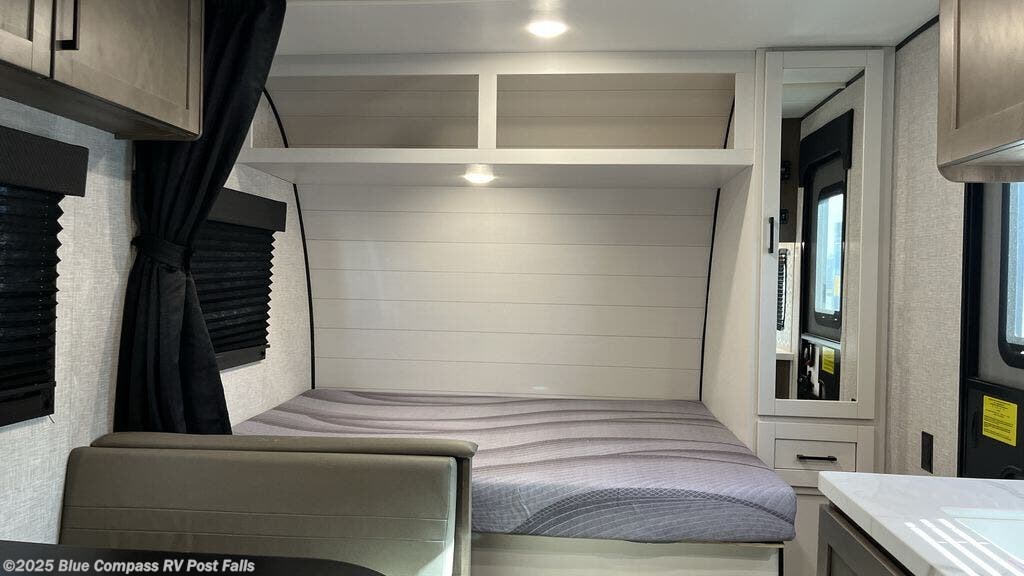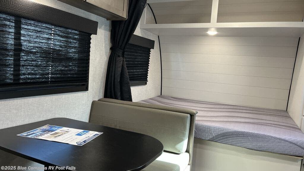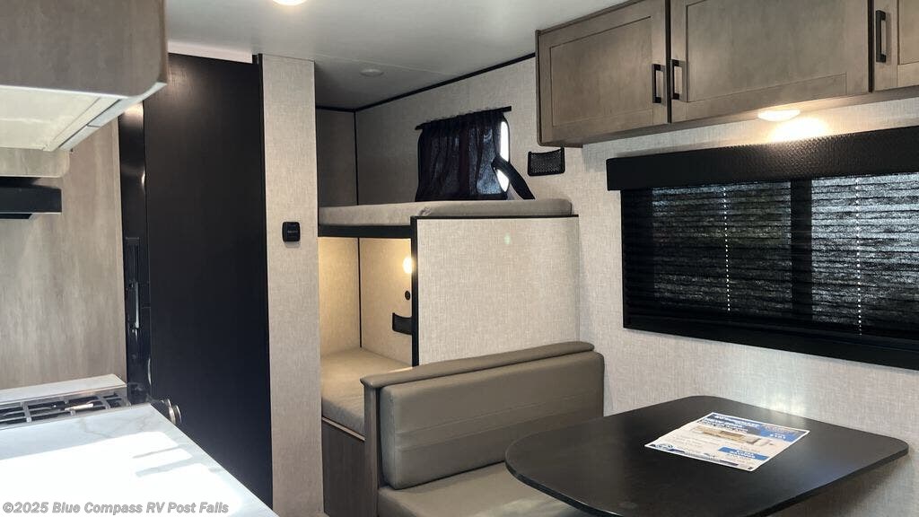 If you're in the market for a lightweight single axle travel trailer with bunk beds, you're in luck with this unit! You will have the front bed all to yourselves, and there is a wardrobe here to store your clothes. The chef can whip up lunch on the two burner cooktop, and you can dine at the booth dinette. If the weather is nice, you may just want to sit outdoors under the 13' power awning with LED lights. The rear corner bath includes a foot flush toilet and a tub/shower, and you'll find plenty of storage space throughout this model, including outside storage for charcoal, tackle boxes, and tools!