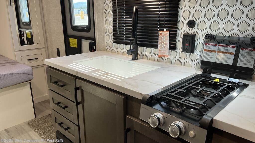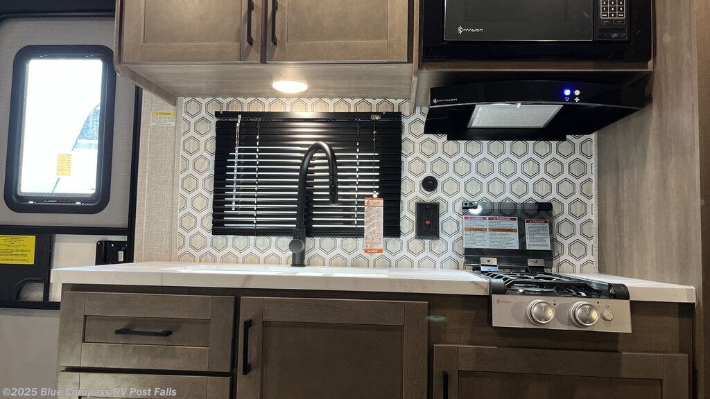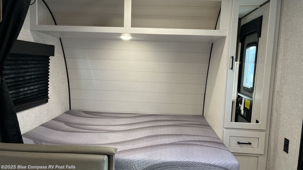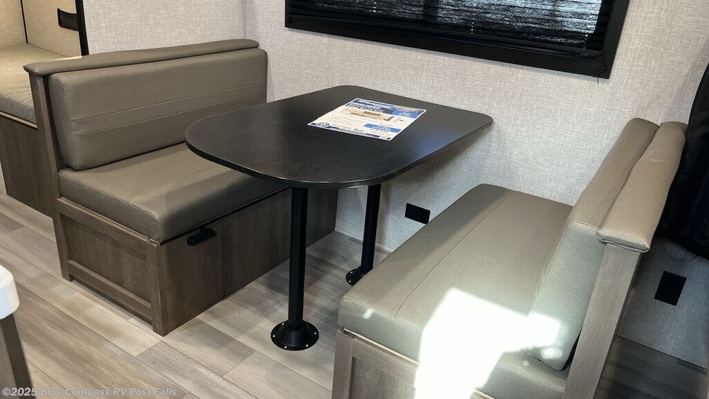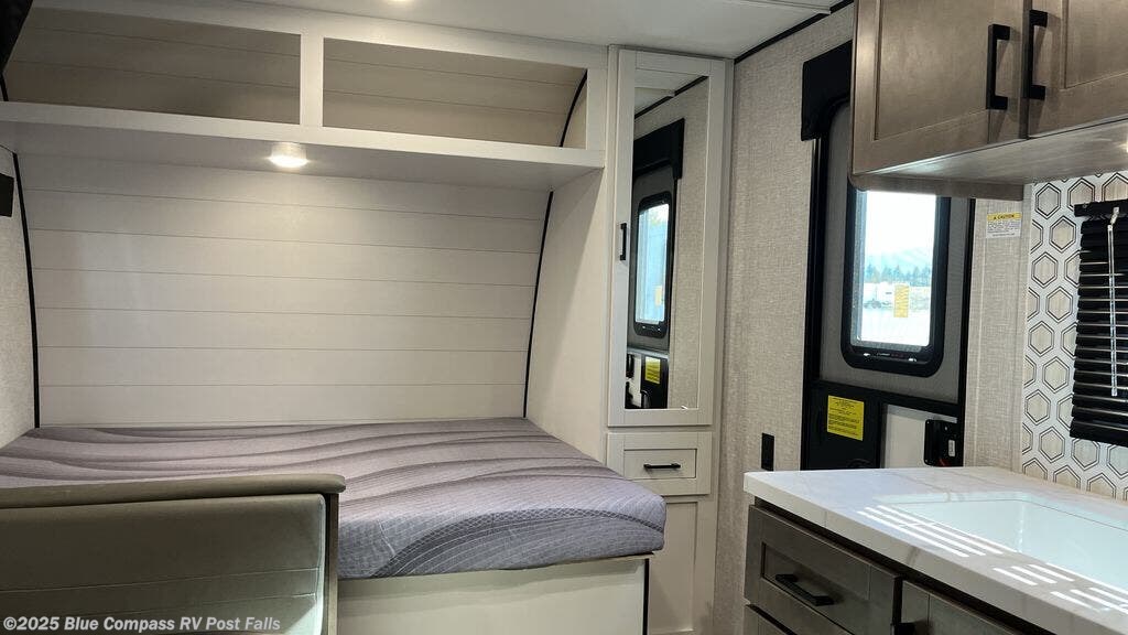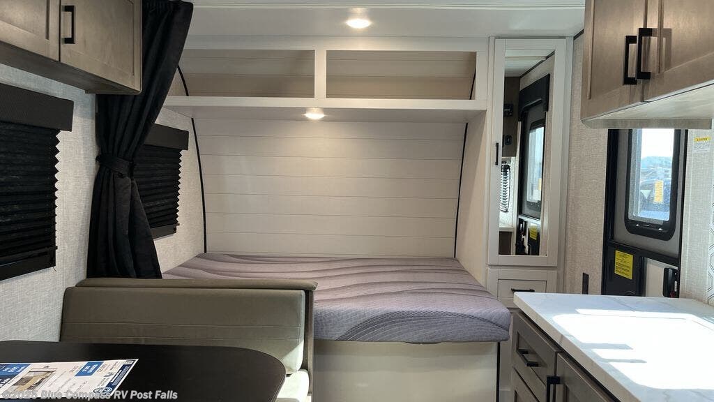 If you're in the market for a lightweight single axle travel trailer with bunk beds, you're in luck with this unit! You will have the front bed all to yourselves, and there is a wardrobe here to store your clothes. The chef can whip up lunch on the two burner cooktop, and you can dine at the booth dinette. If the weather is nice, you may just want to sit outdoors under the 13' power awning with LED lights. The rear corner bath includes a foot flush toilet and a tub/shower, and you'll find plenty of storage space throughout this model, including outside storage for charcoal, tackle boxes, and tools!