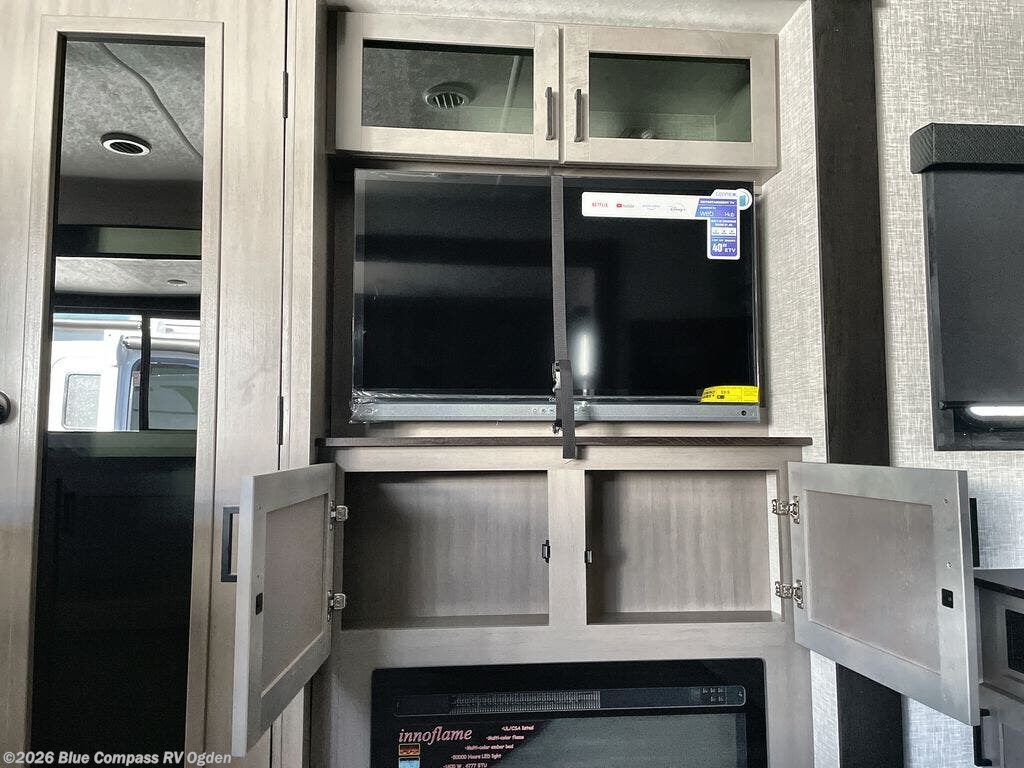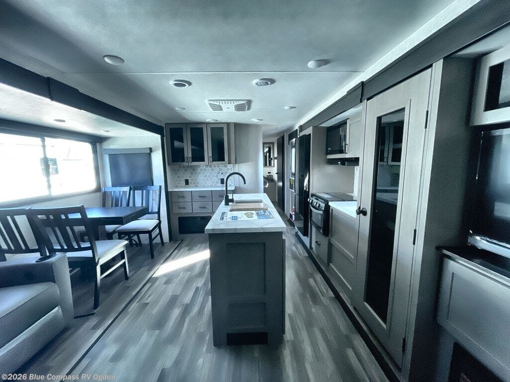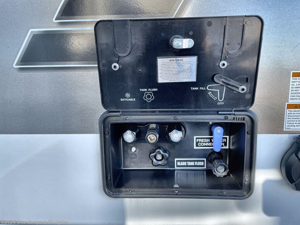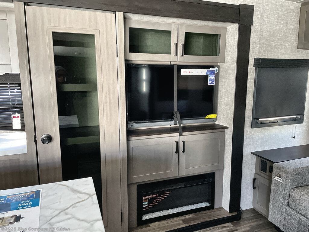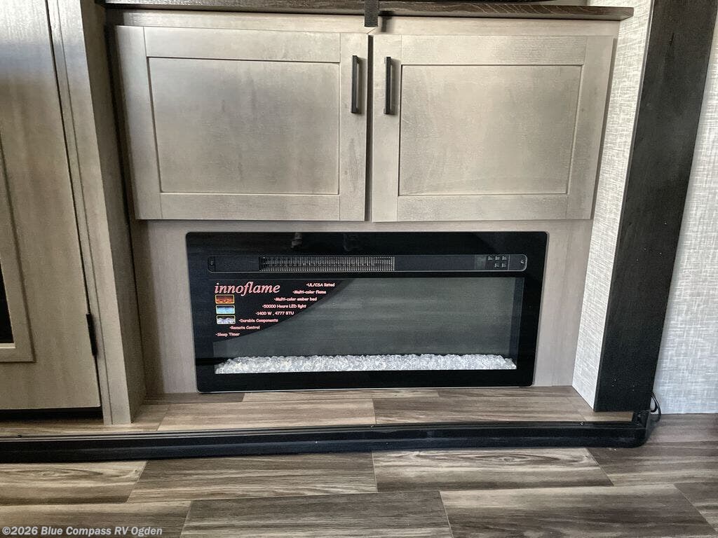 Cozy, comfortable and spacious are just a few of the adjectives you will be thinking about when you camp in this trailer! From the fireplace at the entertainment center to the theater seats, the rear tri-fold sofa and the booth dinette, there's something for everyone here. The dual opposing slides in the main living and kitchen area create more interior space. The kitchen includes appliances to make warm meals, an island with a sink to keep the dishes clean, a large pantry for lots of dry goods, and a hutch to store dishes. There is a full bathroom, and a front bedroom with a king bed and a closet with washer and dryer prep. You will find lots of features along the exterior as well such a two power awnings, a pass-through storage compartment, a sprayer hose and docking station to make camping more convenient.