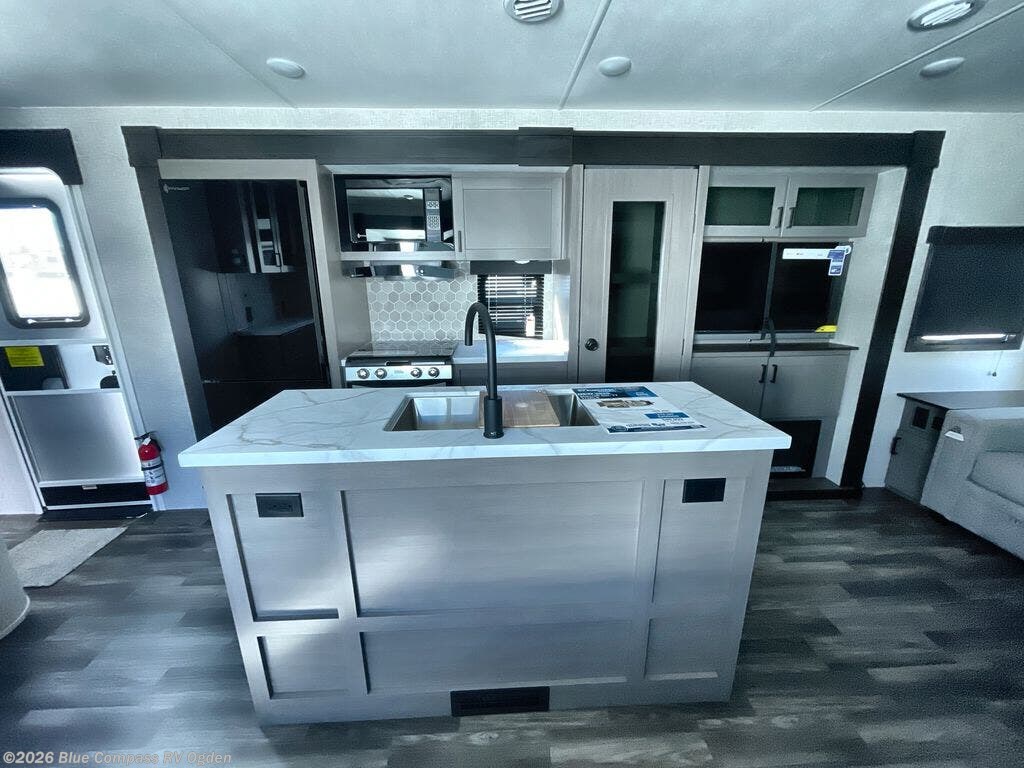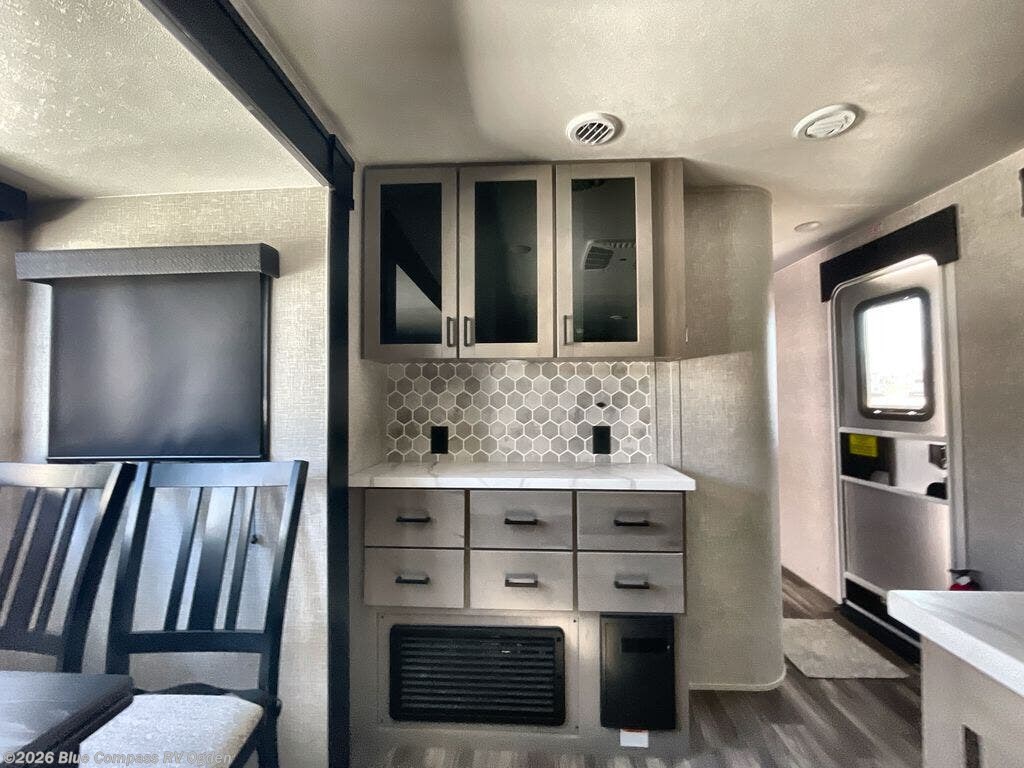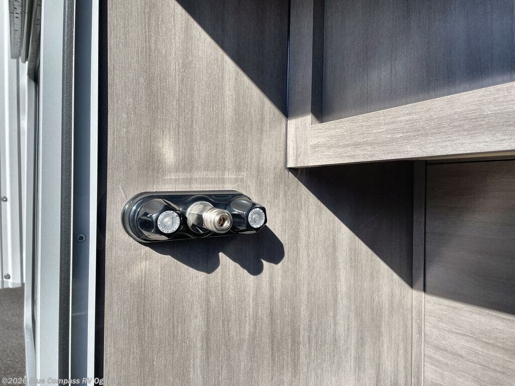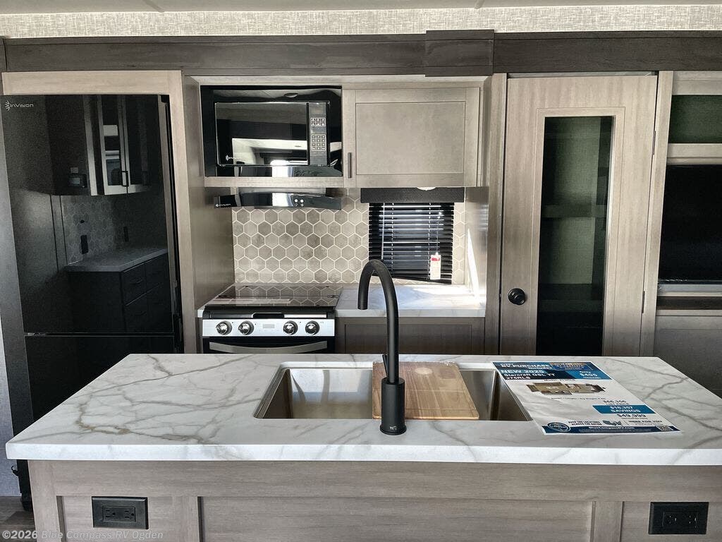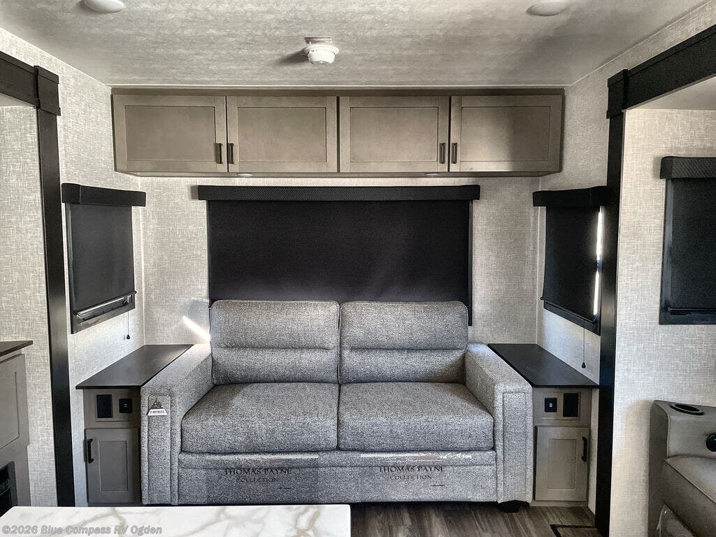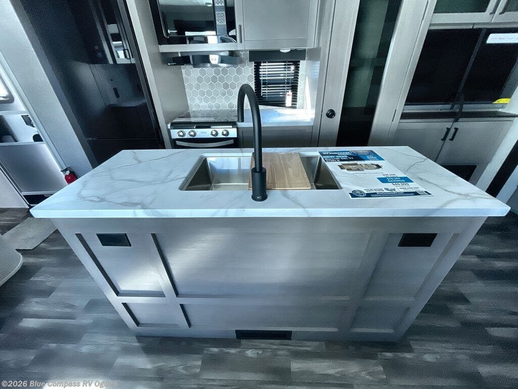 Cozy, comfortable and spacious are just a few of the adjectives you will be thinking about when you camp in this trailer! From the fireplace at the entertainment center to the theater seats, the rear tri-fold sofa and the booth dinette, there's something for everyone here. The dual opposing slides in the main living and kitchen area create more interior space. The kitchen includes appliances to make warm meals, an island with a sink to keep the dishes clean, a large pantry for lots of dry goods, and a hutch to store dishes. There is a full bathroom, and a front bedroom with a king bed and a closet with washer and dryer prep. You will find lots of features along the exterior as well such a two power awnings, a pass-through storage compartment, a sprayer hose and docking station to make camping more convenient.