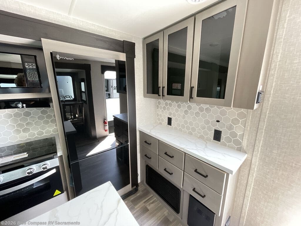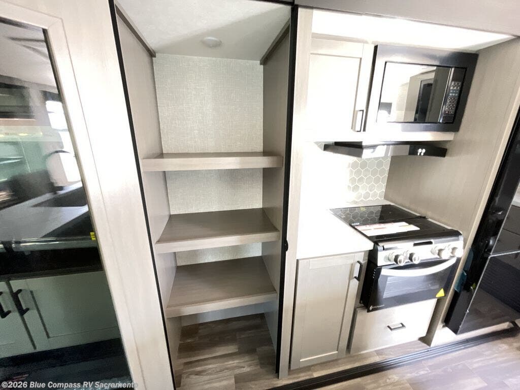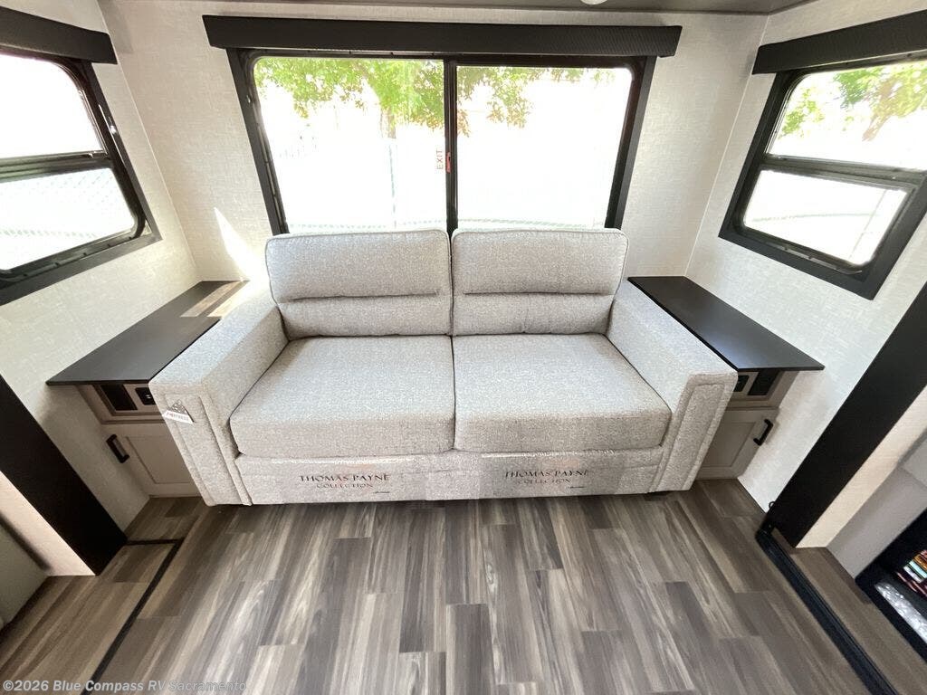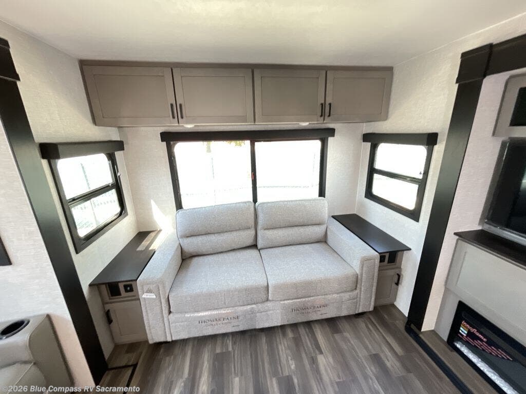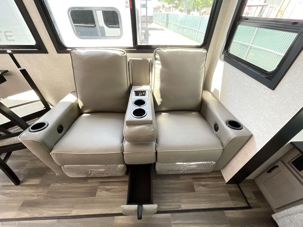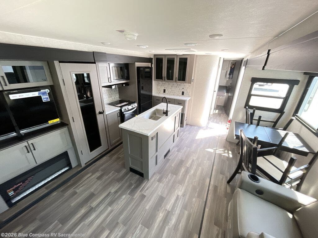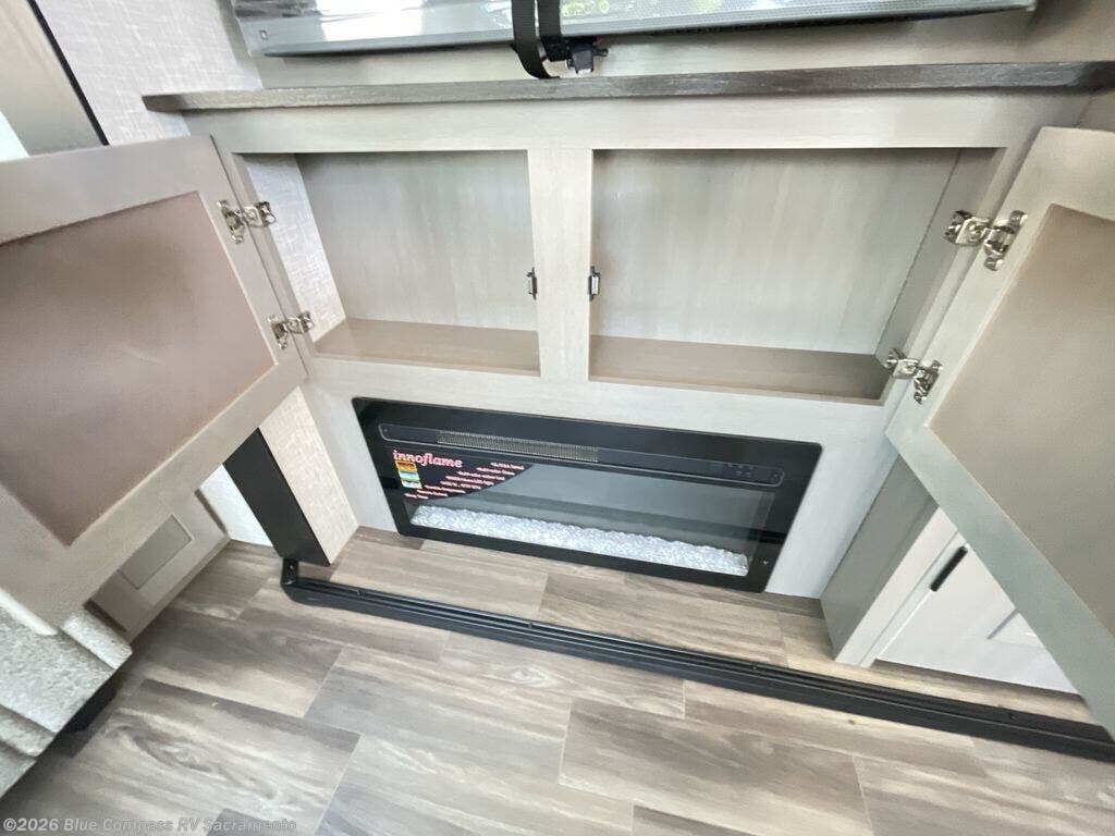 Relax, unwind and enjoy the comforts of this trailer! From the rear living area with a tri-fold sofa, and a slide out with theater seats and a booth dinette, to the fireplace, you might never want to get up to cook. Yet this kitchen is inviting as well with a center island, full kitchen amenities including a 10 cu. ft. refrigerator, a large pantry to hold all the dry goods, and the hutch that offers even more storage and counter space. And the second slide out in this area gives everyone more floor space. The full bathroom has access from the hallway which is near the main entry and the front bedroom where you will have a king bed to sleep on, dual wardrobes and a closet with washer and dryer prep if you choose to add these appliances.