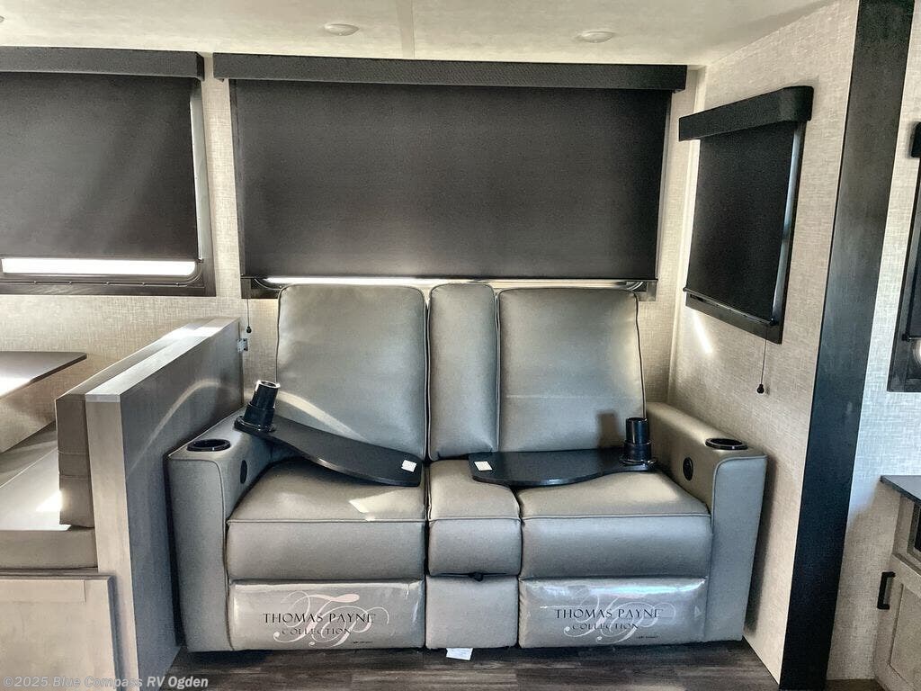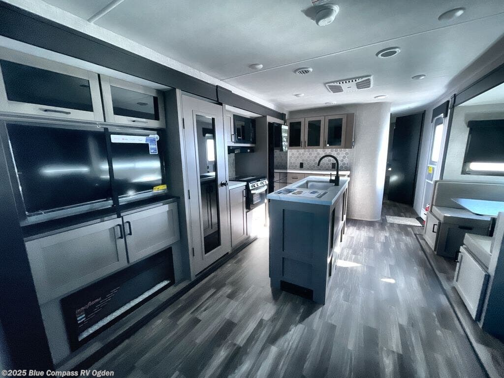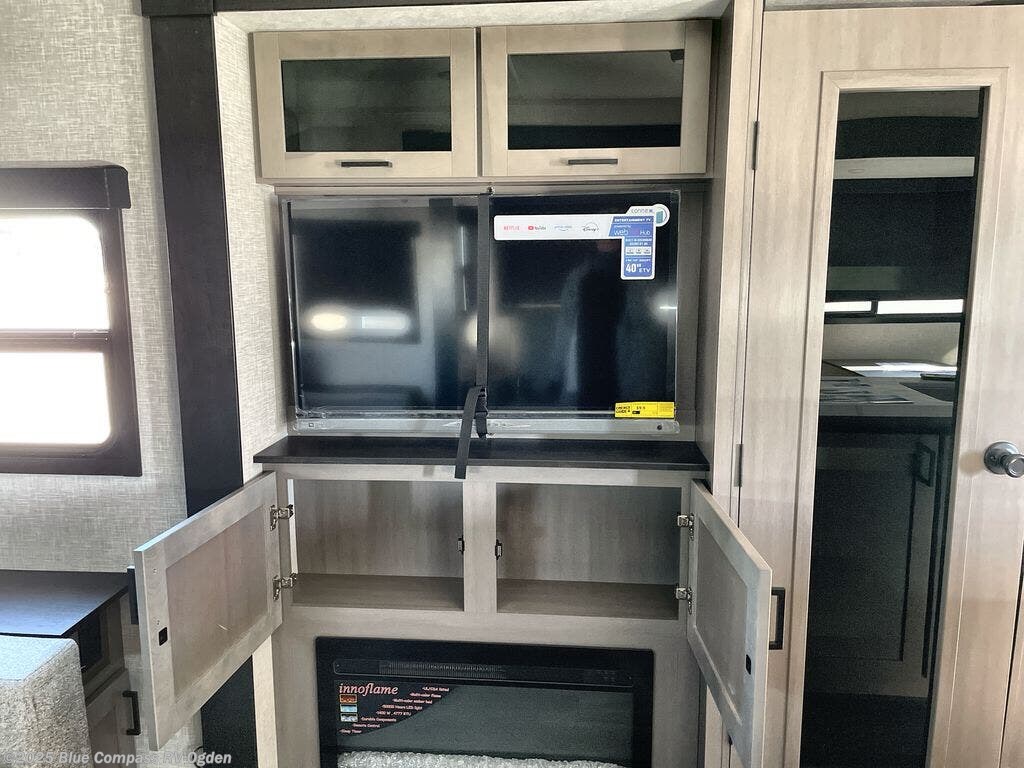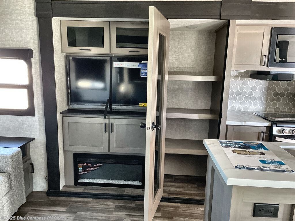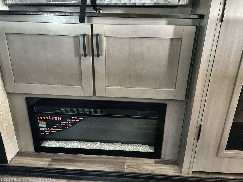 Relax, unwind and enjoy the comforts of this trailer! From the rear living area with a tri-fold sofa, and a slide out with theater seats and a booth dinette, to the fireplace, you might never want to get up to cook. Yet this kitchen is inviting as well with a center island, full kitchen amenities including a 10 cu. ft. refrigerator, a large pantry to hold all the dry goods, and the hutch that offers even more storage and counter space. And the second slide out in this area gives everyone more floor space. The full bathroom has access from the hallway which is near the main entry and the front bedroom where you will have a king bed to sleep on, dual wardrobes and a closet that is prepped to add an optional washer and dryer.