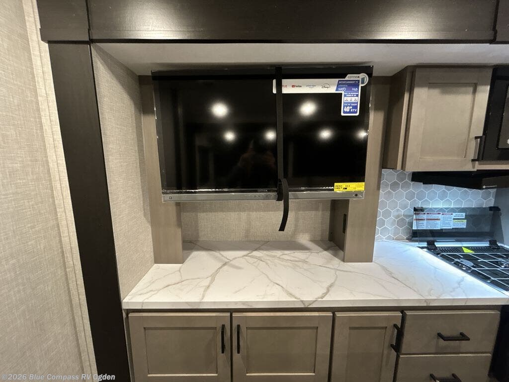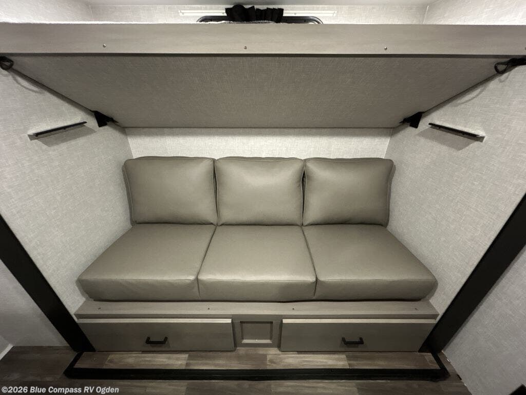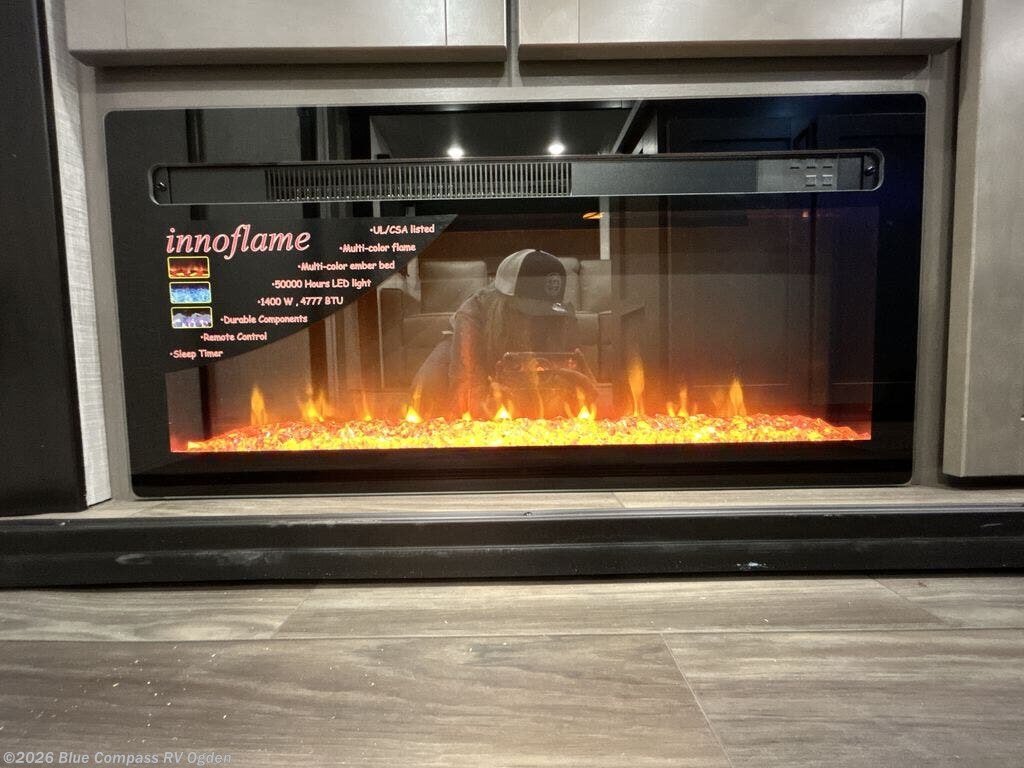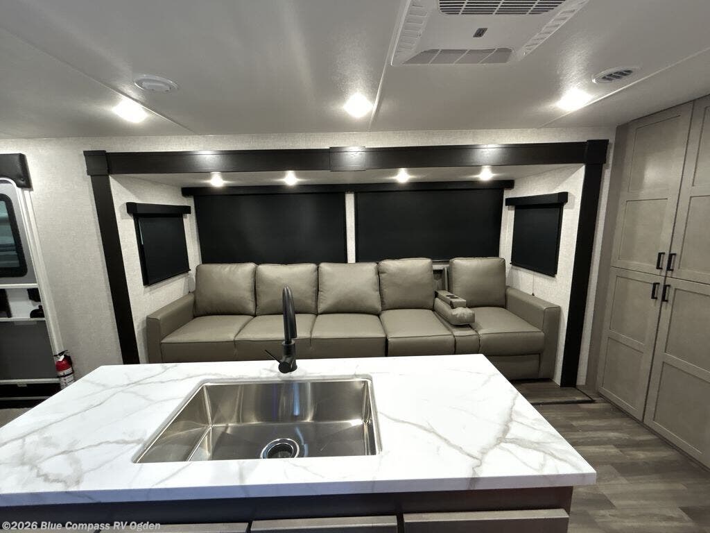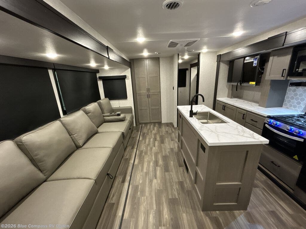 This travel trailer will have you feeling right at home! The rear private bunkhouse has plenty of space for the kiddos to move around, as well as a set of double-size bunks with a ladder and two wardrobes. There is also a slide with a flip-up bunk above a jackknife sofa for even more sleeping space. Everyone can gather together and either relax on the theater seating across from the entertainment center with a fireplace and Smart HDTV or play a game at the booth dinette. The kitchen island makes meal prepping easier and you can store your dishes in the hutch. You could even cook your meals while breathing in some fresh air with the outside kitchen which also has a refrigerator to keep your beverages cold. There's a full bathroom to stay clean and a closet in the front private bedroom with washer and dryer prep for the option to add these appliances.