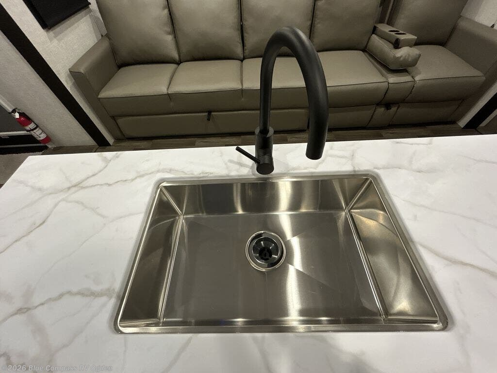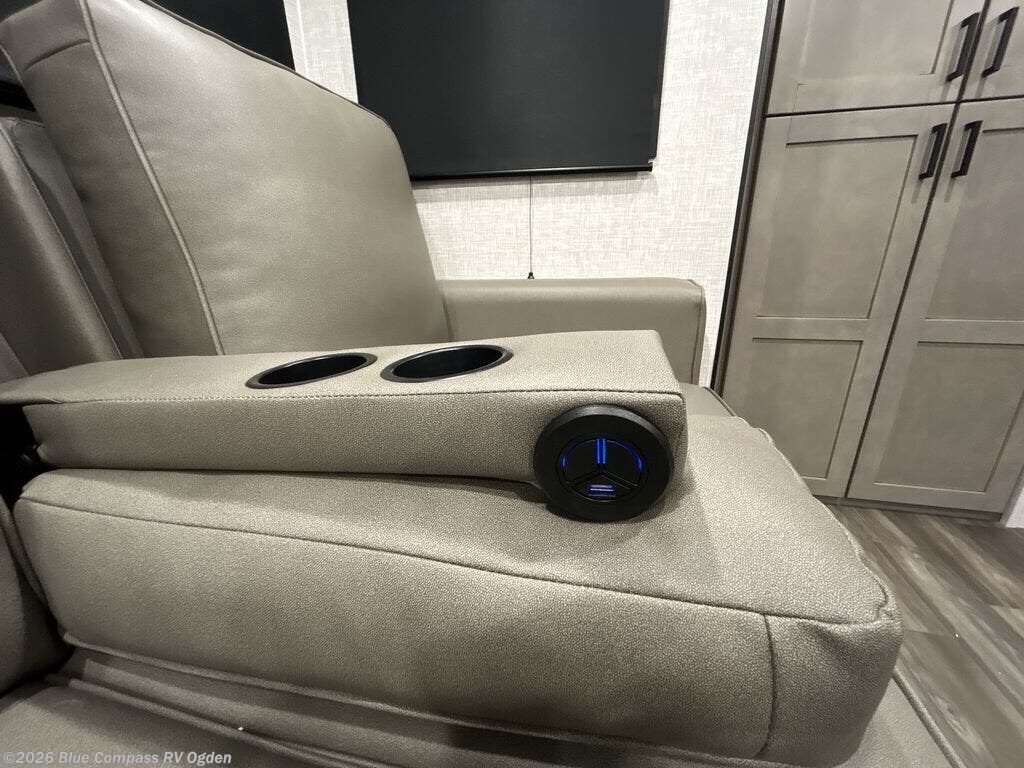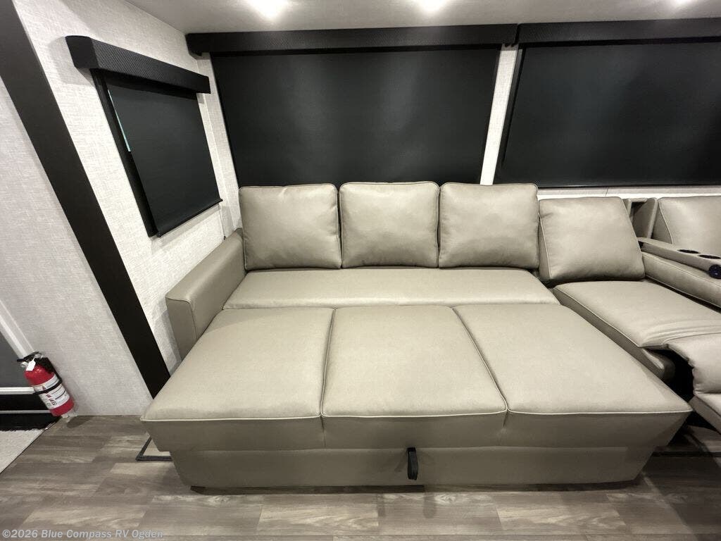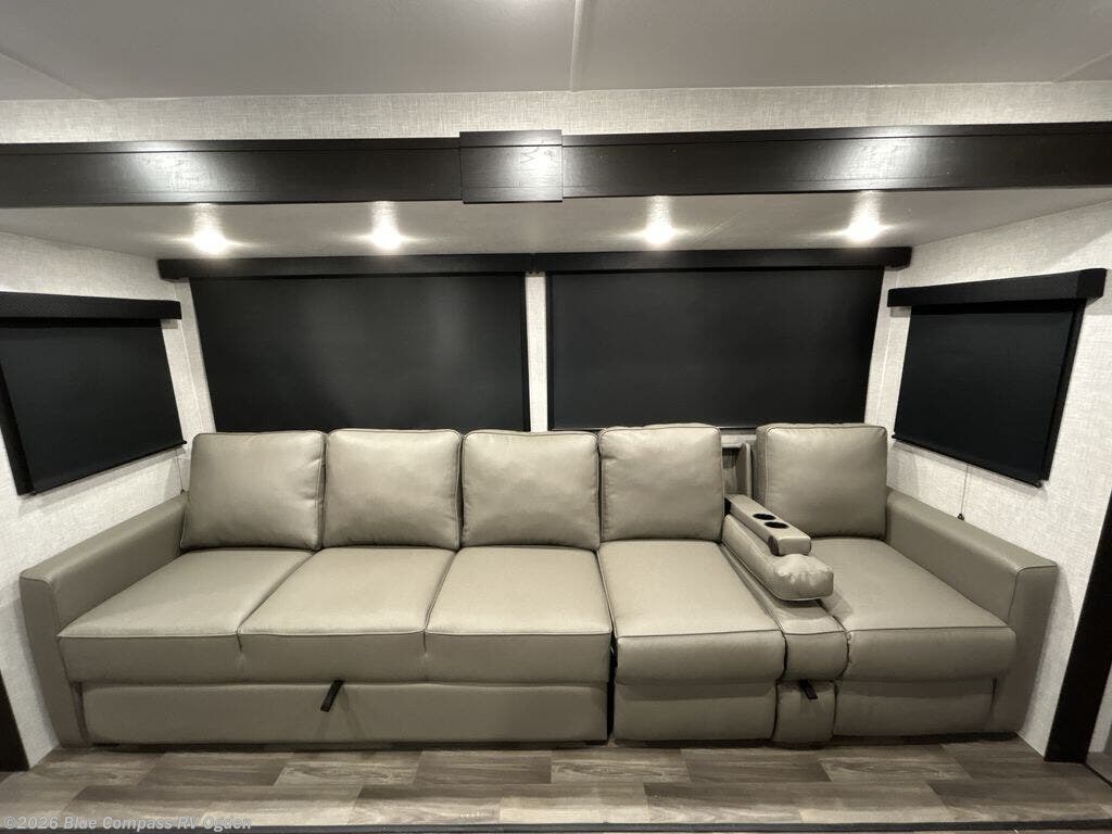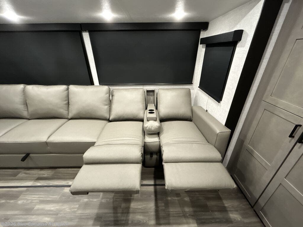 This travel trailer will have you feeling right at home! The rear private bunkhouse has plenty of space for the kiddos to move around, as well as a set of double-size bunks with a ladder and two wardrobes. There is also a slide with a flip-up bunk above a jackknife sofa for even more sleeping space. Everyone can gather together and either relax on the theater seating across from the entertainment center with a fireplace and Smart HDTV or play a game at the booth dinette. The kitchen island makes meal prepping easier and you can store your dishes in the hutch. You could even cook your meals while breathing in some fresh air with the outside kitchen which also has a refrigerator to keep your beverages cold. There's a full bathroom to stay clean and a closet in the front private bedroom with washer and dryer prep for the option to add these appliances.