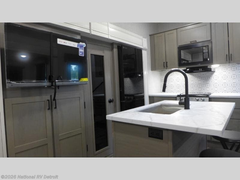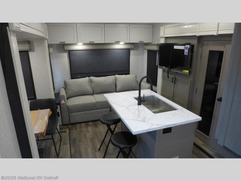 Start living your best camping lifestyle in this fifth wheel! A rear bi-fold sofa offers a comfortable place to relax after swimming in the water. When your stomach starts rumbling head to the fully equipped kitchen to prepare a meal with the three burner cooktop, large pantry, and kitchen island with two bar stools so you can sit down while chopping veggies. The table with four chairs slide offers a comfortable place to dine at, but you could also switch it out for an optional theater seat for more comfort. The full bathroom has a shower for you to rinse the sand out of your hair, and the front private bedroom has a queen bed for you to get a good night's rest. The exterior has storage space, a 13' power awning, an outside TV hook-up area, and grill hook-up area!