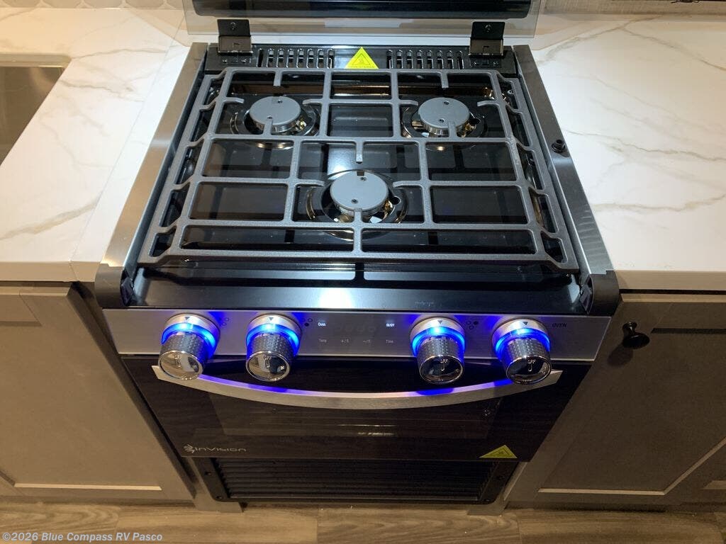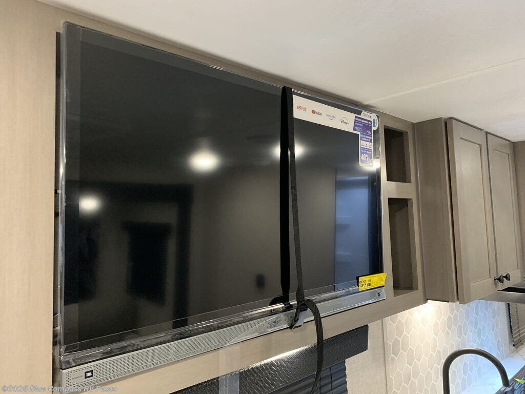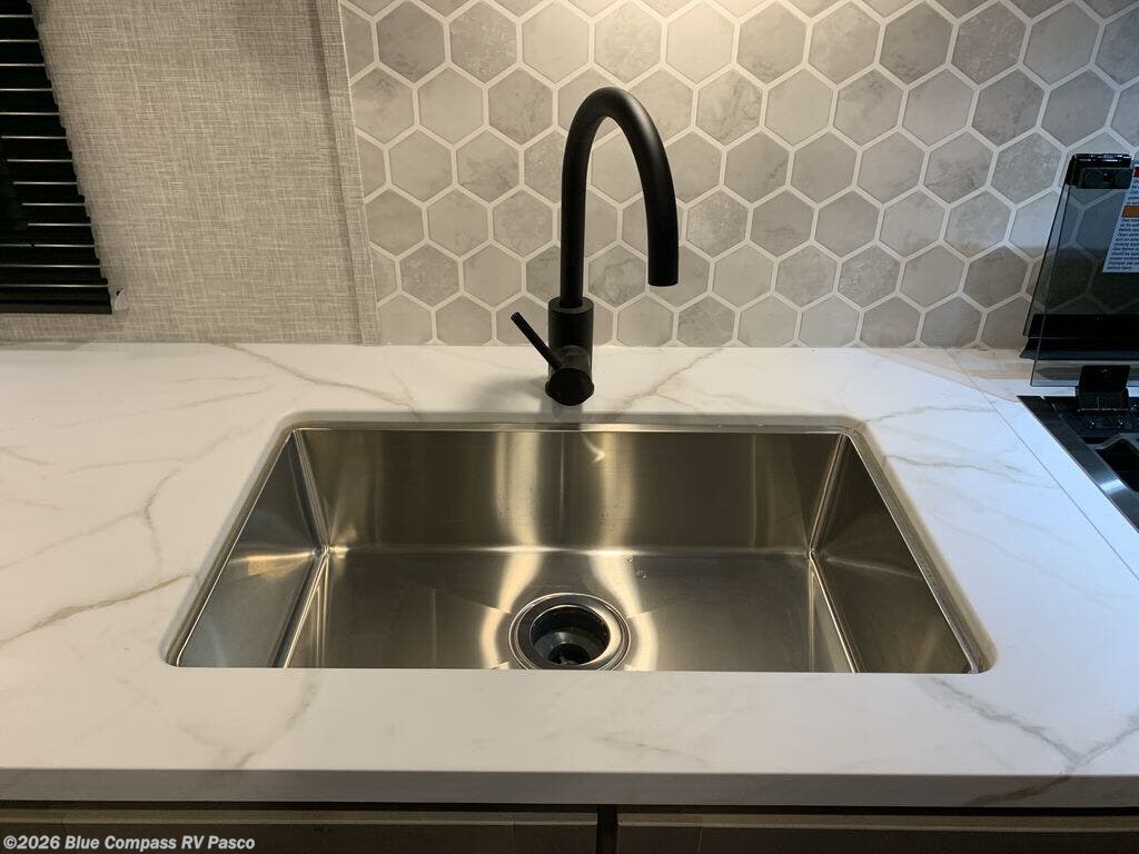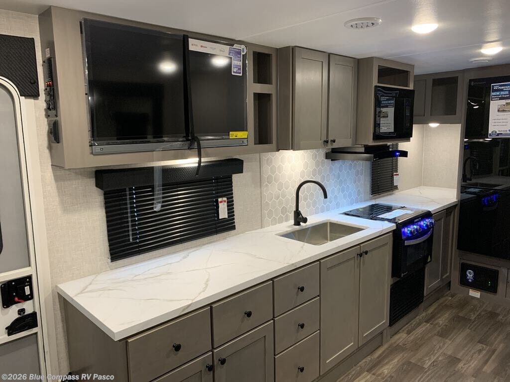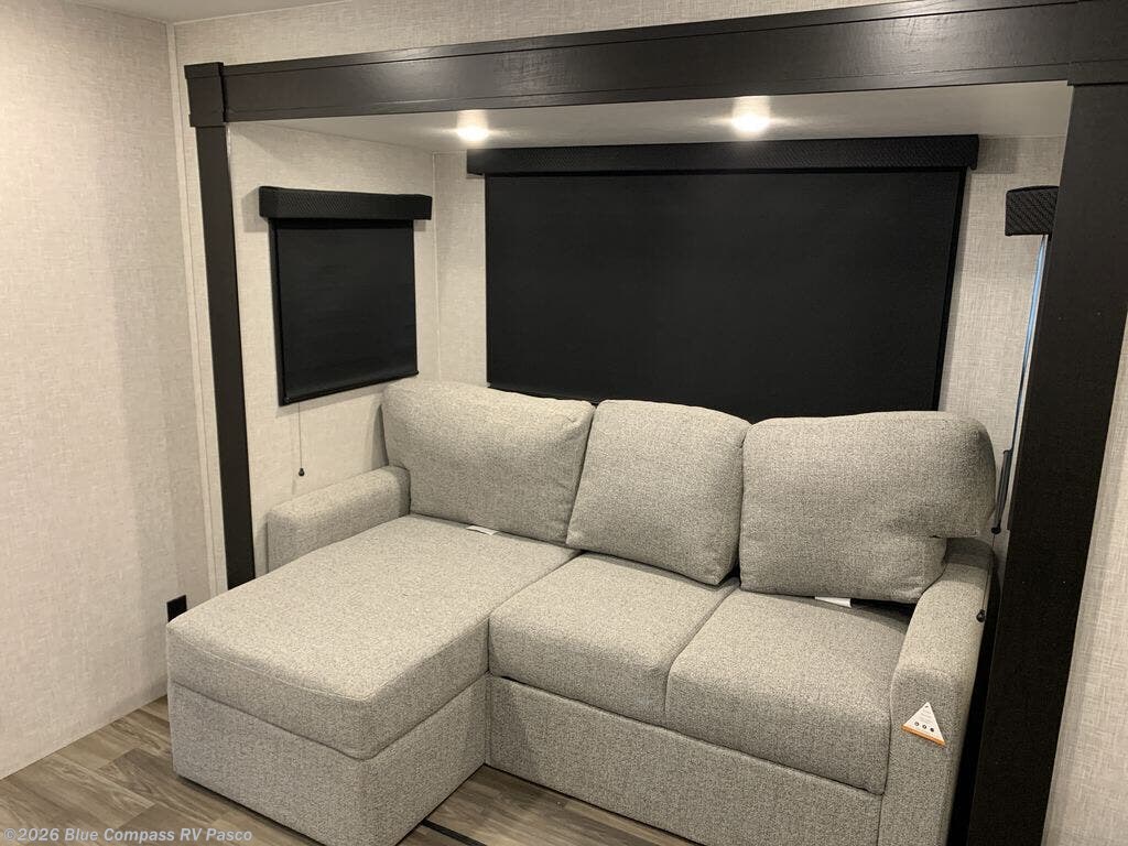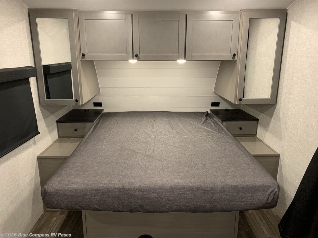 You and your spouse will enjoy camping in this travel trailer! The L-sofa slide out provides more space to stretch out and relax, and there is a table with it to enjoy your meals. This model includes a rear corner kitchen with plenty of counter space, a 10 cu. ft. 12V refrigerator, plus a three burner range with a 17" oven. Get a good night's rest each night on the front queen queen bed with wardrobes on either side and a privacy curtain to draw for added privacy. You will find a grill hookup LP quick connect outdoors plus an exterior docking station and a sprayer hose, and a pass-through storage for hiking and fishing gear!