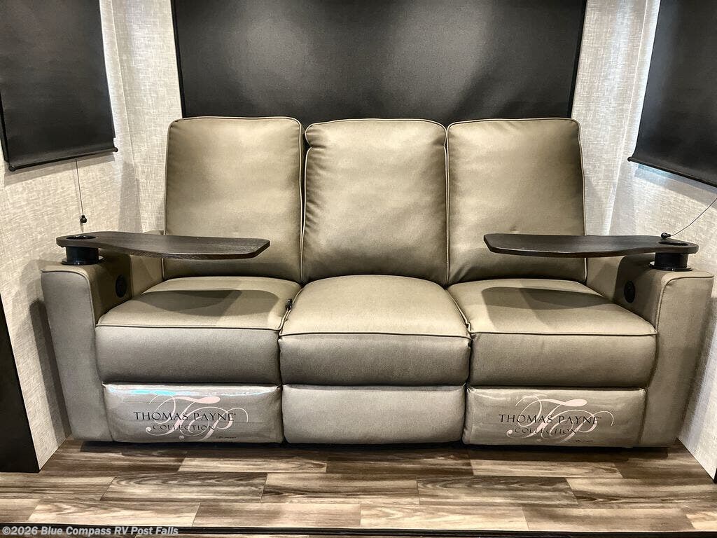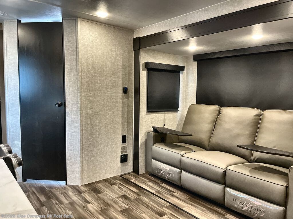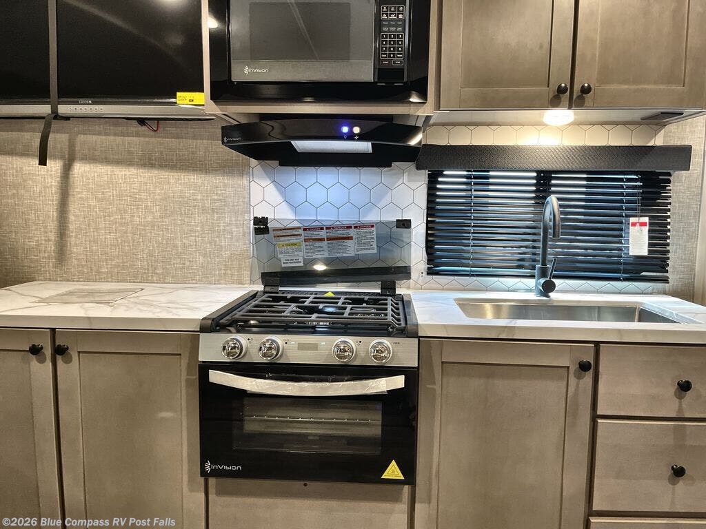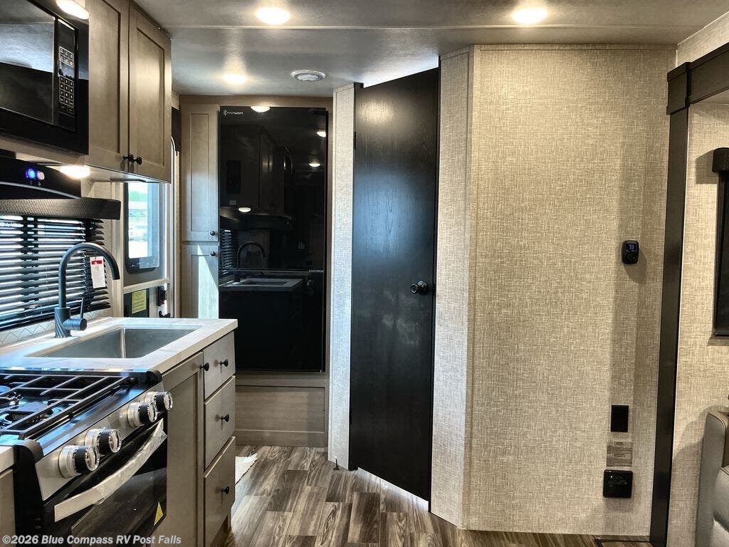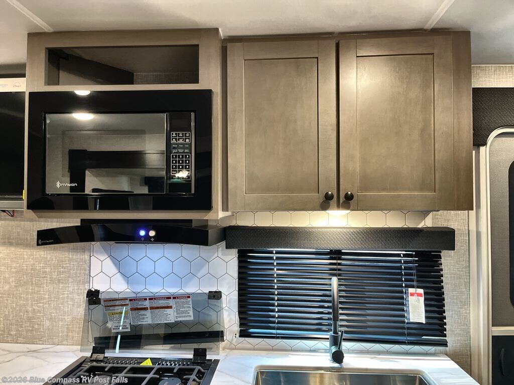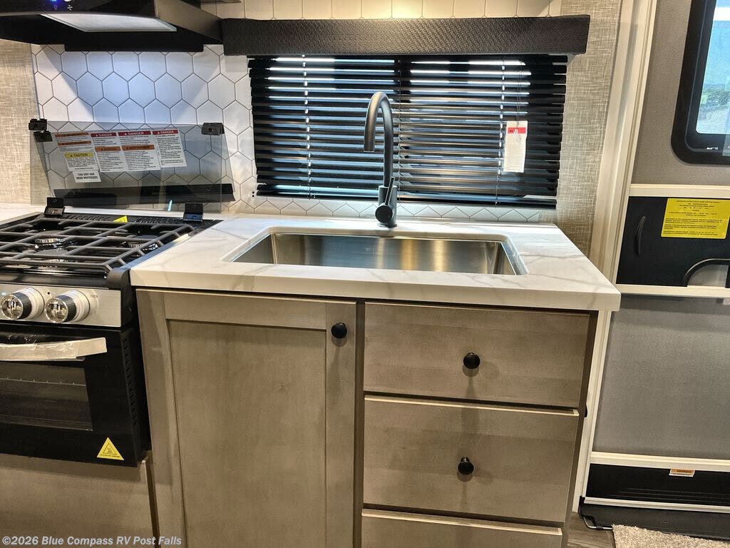 Get ready for some fun and relaxation with this trailer setup at your favorite campground! After enjoying the outdoors and everything it has to offer, you can whip up a meal in the galley kitchen with full amenities and clean the dishes with a single basin stainless steel under-mount kitchen sink with a residential high-rise faucet. The smart HDTV will provide inside entertainment as you relax on the L-shaped sofa with a table to dine at, and this space doubles as a sleeping area at night. The front bedroom offers a privacy curtain, a queen bed, dual wardrobes, and electric outlets and USB ports. And everyone can take turns getting cleaned up in the rear corner bathroom which offers linen storage after hanging out under the 12' power awning.