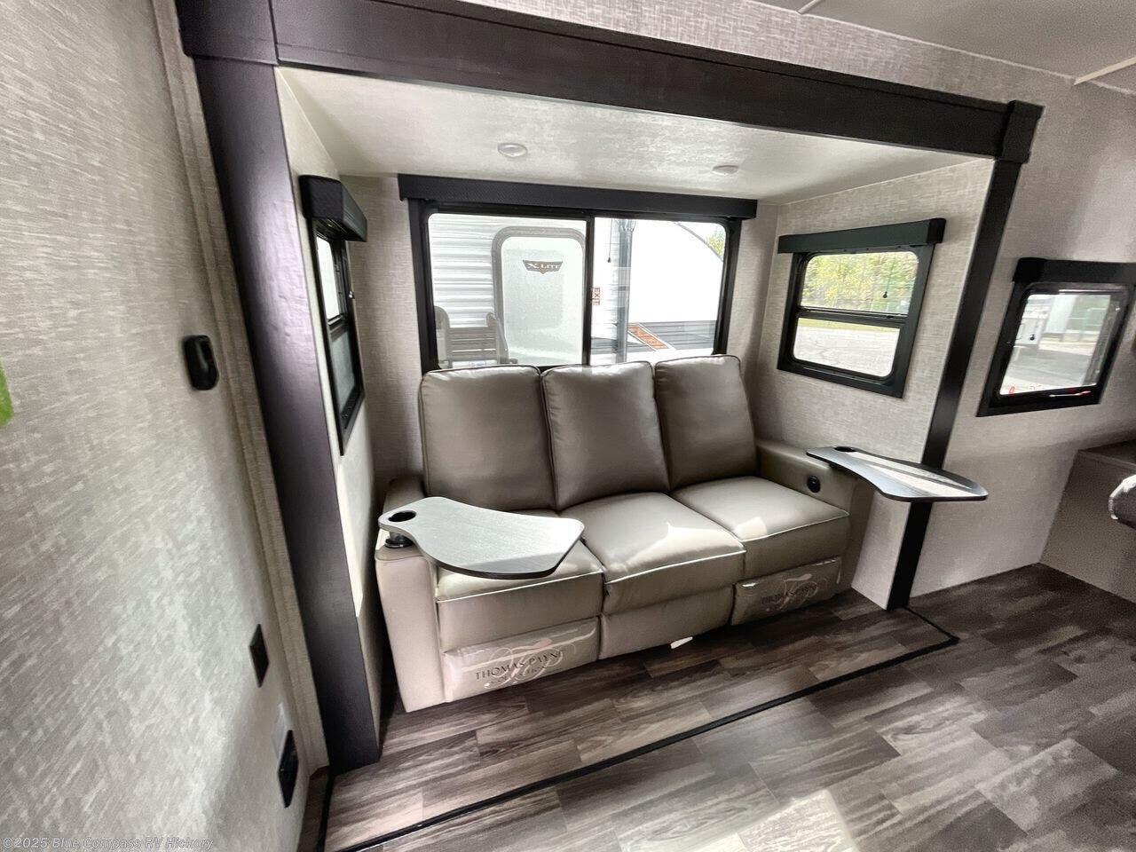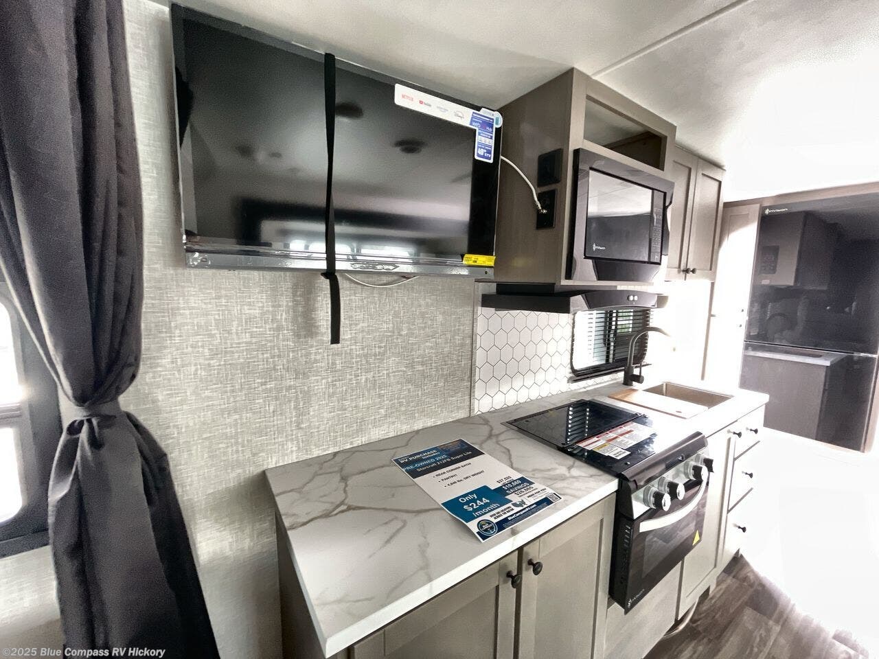 Get ready for some fun and relaxation with this trailer setup at your favorite campground! After enjoying the outdoors and everything it has to offer, you can whip up a meal in the galley kitchen with full amenities and clean the dishes with a single basin stainless steel under-mount kitchen sink with a residential high-rise faucet. The smart HDTV will provide inside entertainment as you relax on the L-shaped sofa with a table to dine at, and this space doubles as a sleeping area at night. The front bedroom offers a privacy curtain, a queen bed, dual wardrobes, and electric outlets and USB ports. And everyone can take turns getting cleaned up in the rear corner bathroom which offers linen storage after hanging out under the 12' power awning.