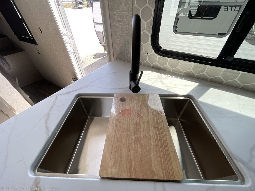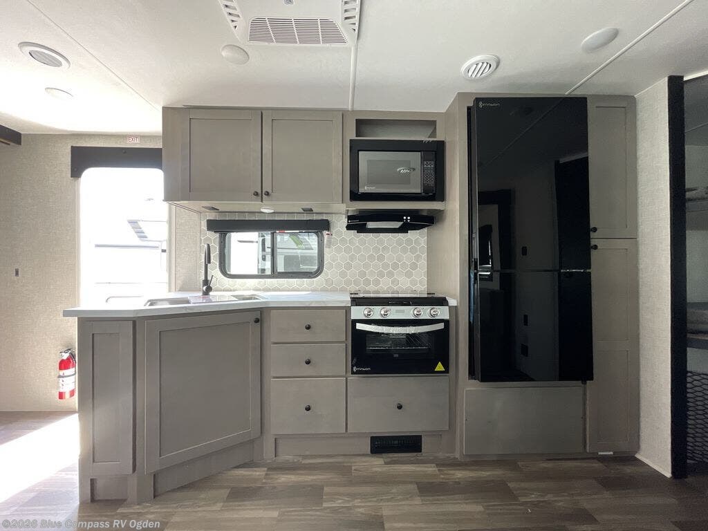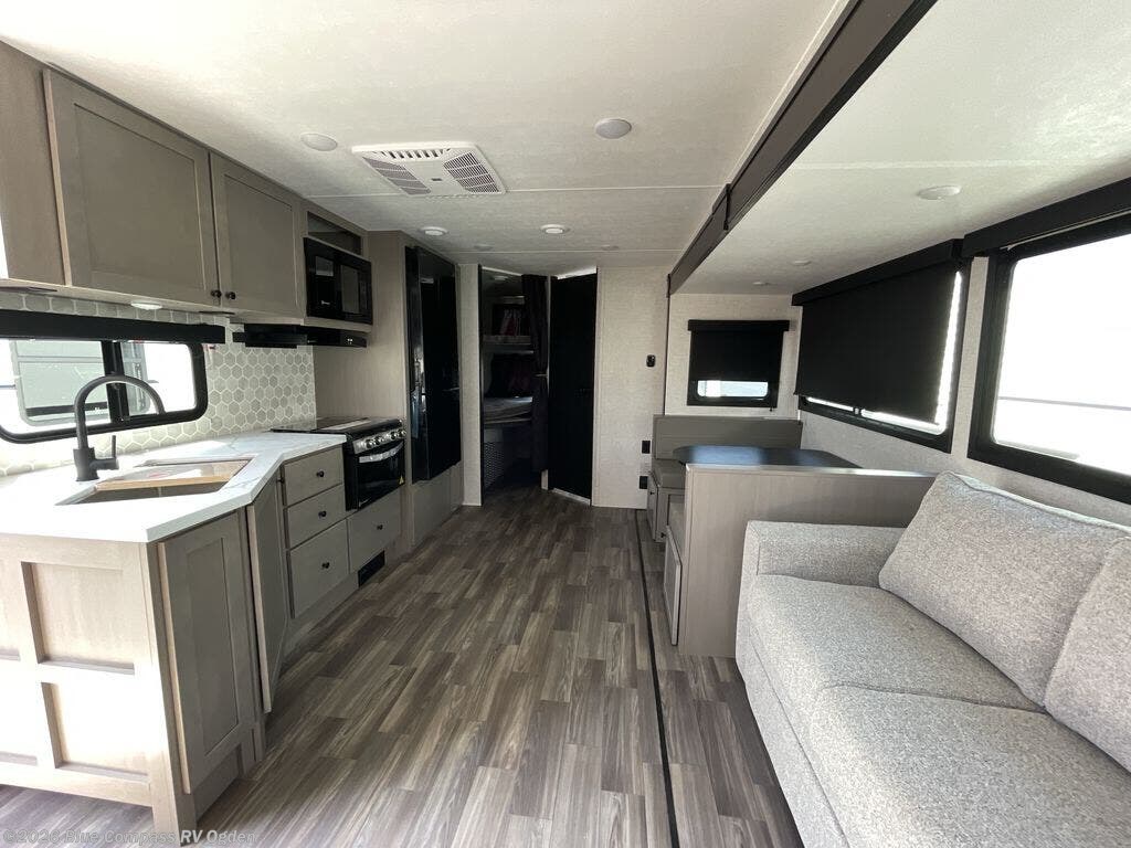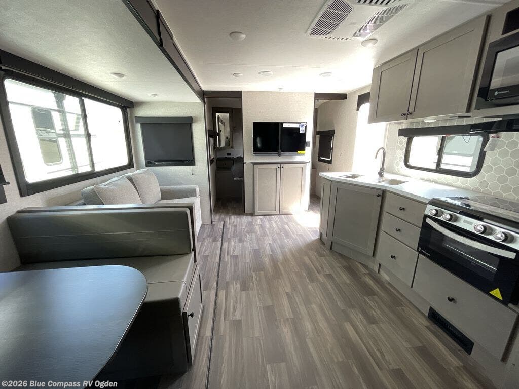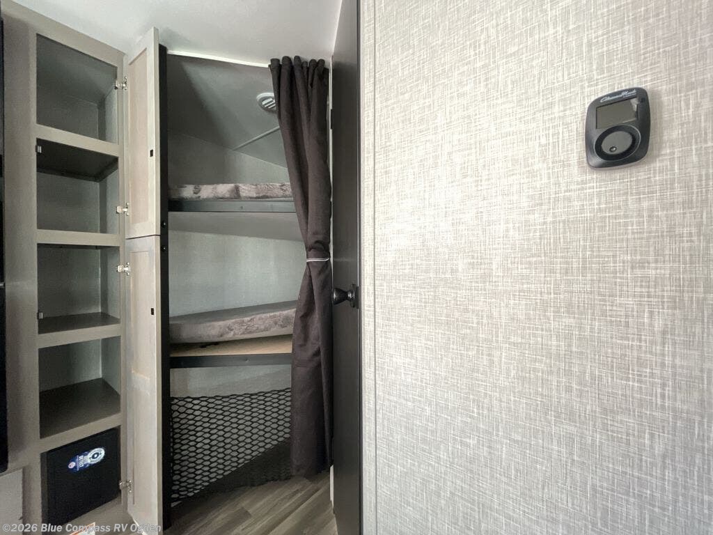 You will love the amount of storage space you'll find inside and outside this travel trailer. There is plenty of sleeping space for a larger group also between the slide out in the main area with a dinette and tri-fold sofa, the double-size bunks next to the rear corner full bathroom, and the queen bed in the front bedroom with access to each side with its own sliding door. The cook will have full amenities including a pantry for storage, a single basin stainless steel under-mount kitchen sink with a residential high-rise faucet and overhead cabinets for more items. And they can cook on the outside kitchen with an exterior fridge while others relax under the 20' 6" power awning with LED lighting.