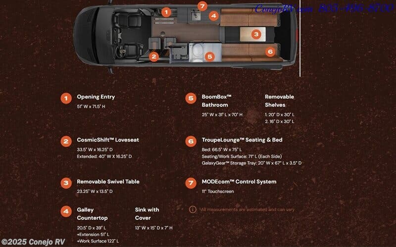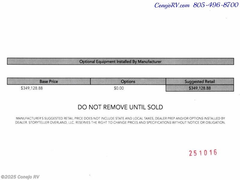 2025 Storyteller Overland Crew Mode XL AWD 16.8kWh Lithonics Lithium System Mercedes Turbo Diesel ***MSRP is $349,128.88 Storyteller See-Thru Price Only 249,377.77*** Mercedes Benz Chassis, 170” Wheelbase, High Roof, 3500XD High-Output Turbo Diesel, AWD, LED High Performance Headlamps, Fog Lamp with Cornering Light Function, Heated Swiveling Driver and Co-Driver Seats, Rain Sensor, Rear Glass Tint and Defrost, MBUX Multimedia System with 10.25” Touchscreen, Satellite Radio, Intelligent Navigation, Smartphone Wireless Charging, Active Lane Keeping Assist , Active Brake Assist, Traffic Sign Assist, Driver and Passenger Airbags, 16.8kWh M-Power System (Powered by Lithionics®), High Capacity Inverter Charger, High Output Auxiliary Alternator, 90Watt Solar Panel (Expandable up to 325 Watts), Roof AC, Diesel Fired Heating System, MODEcom™ 11" Touchscreen Control System, TroupeLounge™ Seating & Bed, Loft Bed w/ Interior Access, Seating for 5 Passengers, - VanSolo™ Removable Single Seat, - CosmicShift™ Loveseat, Removable Upper Cabinetry, GalaxyGear™ 60" Storage Tray, 300 lbs capacity, Side & Rear Bug Screens, Advanced Thermal-Acoustic Polymer Insulation, Fully Enclosed BoomBox™ Vented Full Bath, Dimmable LEDs in BoomBox™, Cassette Toilet w/ Freshwater Flushing, Exterior Shower, Diesel-Fired Water Heating System, Hot Water Recirculation System, Ceiling Power Vent, Power Ultra-Leather Slide/Swivel/Recline Captain’s Chairs that Rotate to Function as Coach Seating, Powered Hardsided LunarLoft™, Running Boards, 37 gal Fresh Water Tank (in Cabin), 24 gal Grey Water Tank w/ Heating Loop, City/Fresh Water Connection, Heavy-Duty Shore Power Inlet, Storyteller Overland® Heavy-Duty Custom Wheels w/ All-Terrain Tires, In Stock Now! ***MSRP is $349,128.88 Storyteller See-Thru Price Only 249,377.77*** We Have Some Fantastic Financing and Take Trades Also! It is our #1 Goal That Your Experience With Our Company is an Enjoyable One with Our Staff of Industry Professionals, Conejo Wholesale Auto & RV, Exclusive Ventura County Dealer For Winnebago Navion, Revel, Solis, Ekko, Travato, Porto, Roam, Era, Storyteller Mode, Crew and Hilt, Tiffin GH1, GT1, and Open Trail, Roadtrek, Zion, & Agile and Play, Westfalia, South Bay Pontoon Boats, We Also Carry a Large Selection of Quality Pre-Owned Motorhomes which come with Our 45 Day/1000 Mile In-House Warranty at No Charge, Conejo RV, 661 E. Thousand Oaks Blvd, Thousand Oaks, CA 91360, 805-496-8700, Open 7 Days, 9am to 6pm, All Coaches Fully Inspected, Serviced and Detailed, Come Experience the No Pressure No Haggle Sales Approach at Conejo RV, We Also Buy Clean Late Model Coaches, 1 Year Free Camping Membership Included Ask For Details! (***plus tax & license fees***)