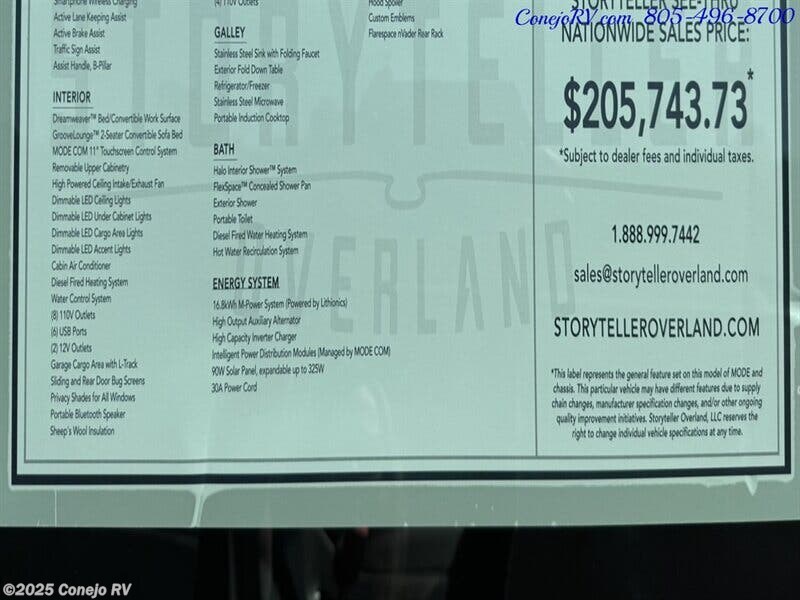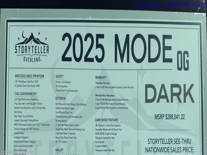 2025 Storyteller Overland Dark Mode OG AWD 16.8KWH Lithonics Lithium System Mercedes Sprinter Turbo Diesel ***$205,744(Before Rebate)*** Dark Mode Features; JBL Premium Co-Axial Door Speakers, Storyteller Wheels with All-Terrain Tires, DARK MODE Graphics Package, Flarespace Updog Rear Step, Hood Spoiler, Custom Emblems, Flarespace nVader Rear Rack, ***Mercedes Benz Sprinter Chassis, 2500 4-Cylinder Diesel High Output AWD 208HP & 332ft-lb of Torque, Upgraded 9G-TRONIC Transmission, Hydraulic 4 Wheel Antilock Braking, Adaptive Cruise Control, Active Brake Assist, Active Lane Keeping Assist, Light/Rain Sensor/Blind Spot Monitoring with Indicator Lights in Side Mirror, Collision Prevention Assist/High Beam Assist, Driver and Passenger Airbags, Parking Package With 360 Degree Cameras, 16.8kWh M-Power System (Powered by Lithionics®), High Capacity Inverter Charger, High Output Auxiliary Alternator, 90Watt Solar Panel (Expandable up to 325 Watts), Roof AC, Diesel Fired Heating System, Rear Bedroom With Storable Dreamweaver™ Bed System/ Convertible Work Surface, Gear Hauler Cargo Space w/ L-Track Locking System, MoonBoot Flooring and Side Wall, GrooveLounge™ 2-Seater Convertible Sofa Bed, Halo Interior Shower™ System, FlexSpace™ Concealed Shower Pan, Exterior Shower, Portable Toilet, Diesel Fired Water Heating System, Ceiling Power Vent, Galley With Stainless Steel Sink with Folding Faucet & Glass Cover, Exterior Fold-Down Table, Dual Voltage Refrigerator/Freezer, Stainless Steel Microwave with Turntable, One True Induction Cooktop, Rich Wood Cabinetry With Padded Interior Cabinets, Power Ultra-Leather Heated Slide/Swivel/Recline Captain’s Chairs that Rotate to Function as Coach Seating, Swing Arm Dinning Table 3 Point Harness On Rear Seats, Infotainment Center with GPS—10.25'’ Touch Screen MBUX Multi-Media System Including Voice Recognition, Apple CarPlay and Android Auto, SiriusXM Satellite Radio, Advanced GPS Navigation, JBL Premium Co-Axial Door Speakers, Power Windows, Door Locks and Mirrors, Furrion Bluetooth Detachable Speaker System w/110V Outlets, USB Ports, 12V Outlets, Exterior Shower, Power Patio Awning with Alumiguard and Integrated LED Lighting, Tinted Coach Windows, Sliding Door, Rear Exterior Wash Station, Tow Package, Keyless Entry, ***$205,744(Before Rebate)*** We have some fantastic financing and take trades also! It is our #1 goal that your experience with our company is an enjoyable one with our staff of industry professionals, Conejo Wholesale Auto & RV, Exclusive Ventura County Dealer For Winnebago Navion, Revel, Solis, Ekko, and Travato, All Storyteller Products, Outside Van Syncline and Approach, Tiffin GH1, All Roadtrek Products, We Also Carry Some Quality Pre-Owned Motorhomes which come with Our 45 Day/1000 Mile In-House Warranty at No Charge, Conejo RV, 661 E. Thousand Oaks Blvd, Thousand Oaks, CA 91360, 805-496-8700, Open 7 Days, 9am to 6pm, All Coaches Fully Inspected, Serviced and Detailed, Come Experience the No Pressure No Haggle Sales Approach at Conejo RV, We Also Buy Clean Late Model Coaches, 1 Year Free Camping Membership Included Ask For Details! (***plus tax & license fees***)
