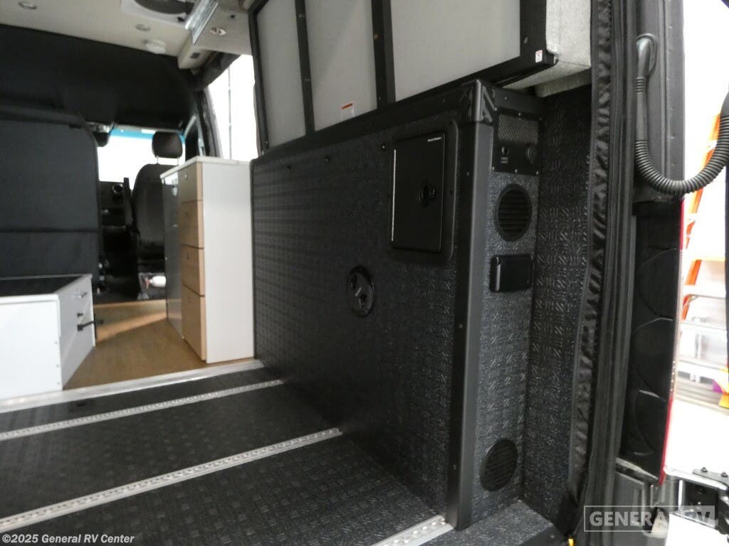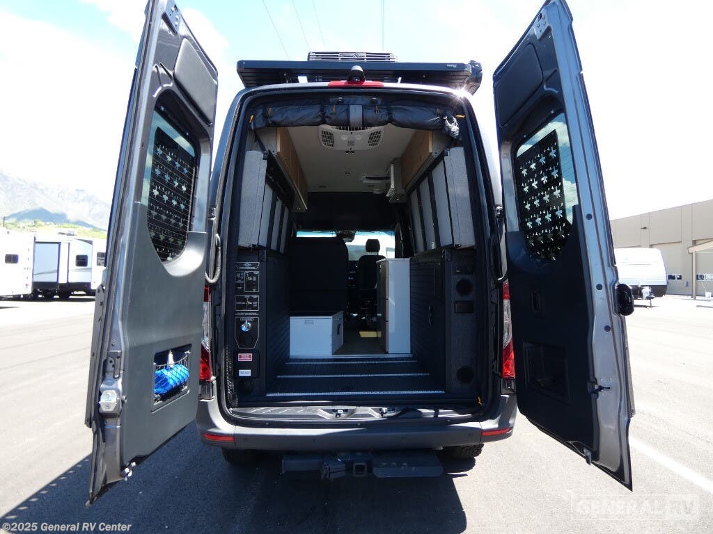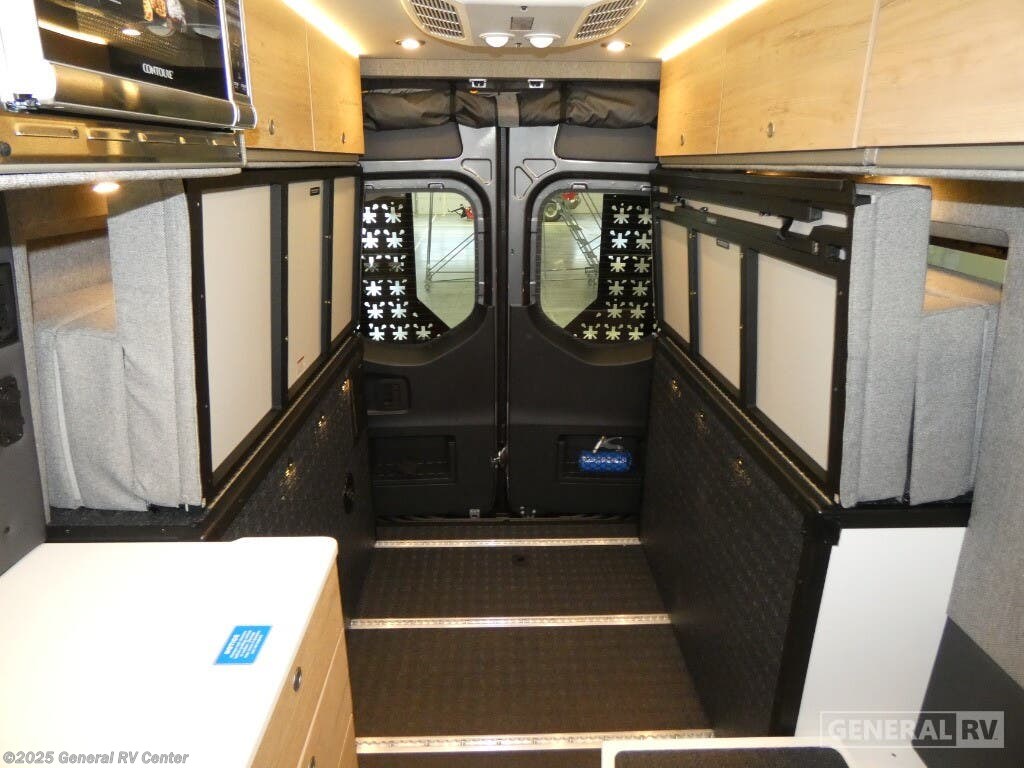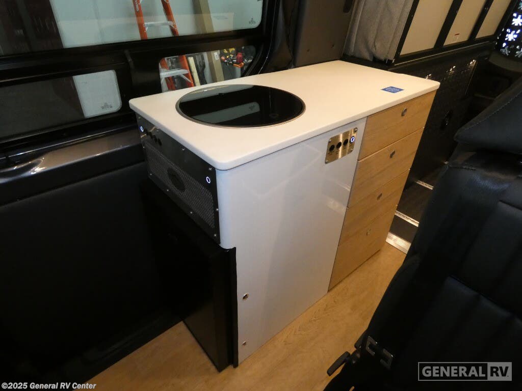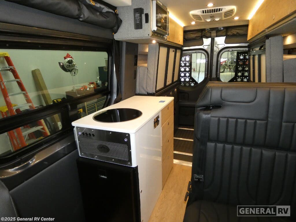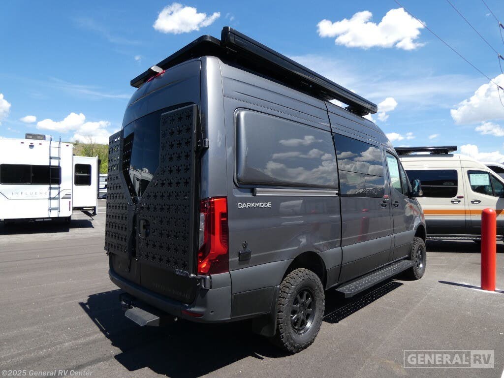 DARKMODE Graphics Package All-Terrain Tires Stainless Steel Microwave Cargo Area with L-Track Halo Shower You'll love the stealthy exterior of the DARKMODE OG! The GrooveLounge can seat two adults and can convert to a couch or bed, plus you'll have Dreamweaver bed that easily folds up to reveal a workspace. There is plenty of storage space throughout, including under the bed and in the removable upper cabinetry. You can whip up your best meals with the portable induction cooktop and stainless steel microwave, and the refrigerator/freezer will keep cold items fresh. There is also a stainless steel sink with a folding faucet and an exterior fold-down table if you want to get some fresh air as you prep dinner. You'll appreciate the Halo shower with a FlexSpace concealed shower pan, along with a portable toilet and hot water recirculation system. Live free, explore endlessly, and tell better stories with the Storyteller Overland Class B diesel van! With an all-wheel drive and diesel engine, the Storyteller Overland MODE OG models are always ready to go whenever you are! You can travel with complete peace of mind knowing that each van meets all of the qualifications for the various and rigorous safety tests, so it is safe. But the Storyteller Overland is also fun and rugged with its rugged roof rack with sonic wedge deflector, powered awning with dimmable LED lights, portable toilet, outside shower, and portable Bluetooth speaker. The HALO shower conveniently stores in a cabinet and includes a shower head and curtain that can be rolled up and stored when not in use, providing you with more living space! Additional features include an M-Power energy system powered by Lithionics, convenient bug screens, plus 110V outlets and USB ports to keep you charged up!
