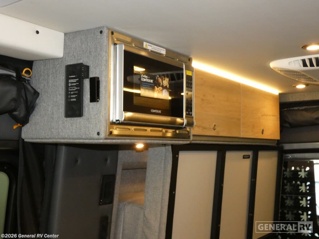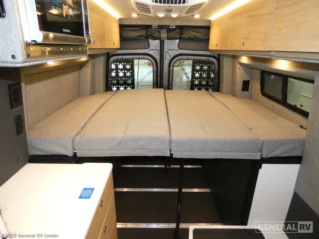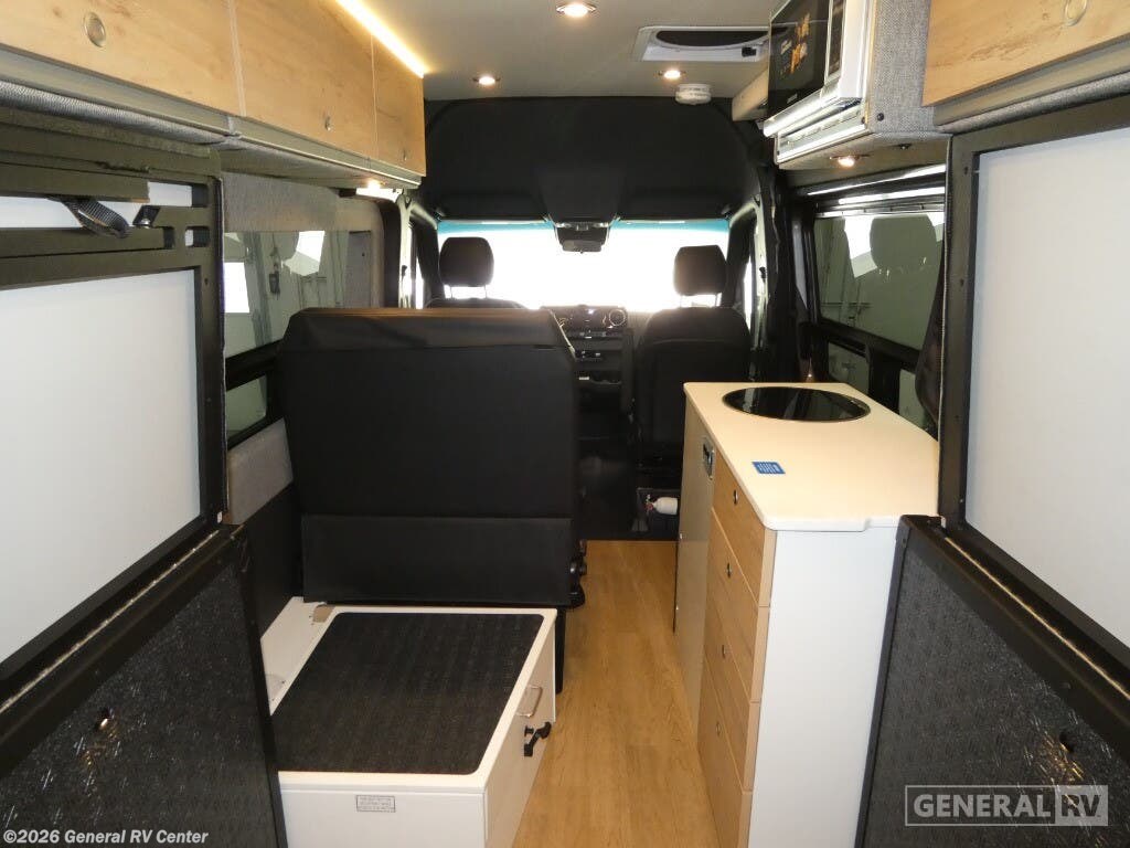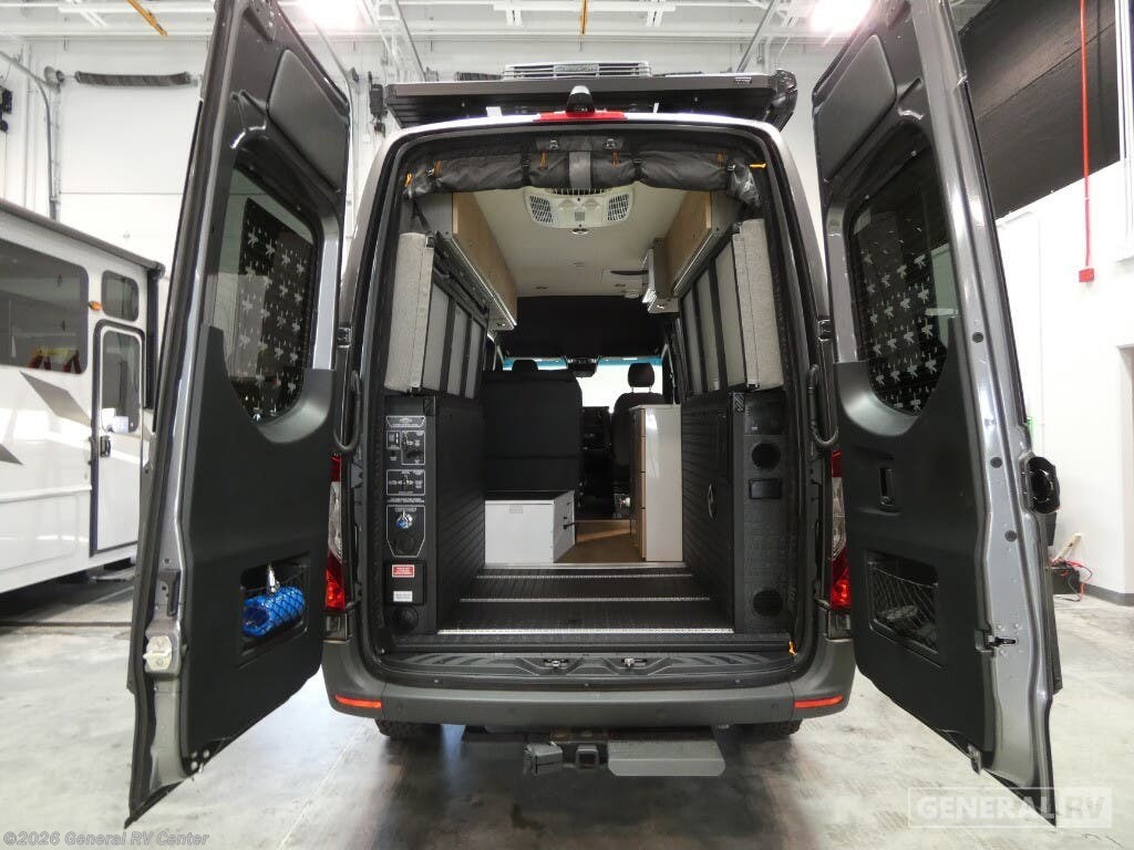 DARKMODE Graphics Package All-Terrain Tires Stainless Steel Microwave Cargo Area with L-Track Halo Shower You'll love the stealthy exterior of the DARKMODE OG! The GrooveLounge can seat two adults and can convert to a couch or bed, plus you'll have Dreamweaver bed that easily folds up to reveal a workspace. There is plenty of storage space throughout, including under the bed and in the removable upper cabinetry. You can whip up your best meals with the portable induction cooktop and stainless steel microwave, and the refrigerator/freezer will keep cold items fresh. There is also a stainless steel sink with a folding faucet and an exterior fold-down table if you want to get some fresh air as you prep dinner. You'll appreciate the Halo shower with a FlexSpace concealed shower pan, along with a portable toilet and hot water recirculation system. Live free, explore endlessly, and tell better stories with the Storyteller Overland Class B diesel van! With an all-wheel drive and diesel engine, the Storyteller Overland MODE OG models are always ready to go whenever you are! You can travel with complete peace of mind knowing that each van meets all of the qualifications for the various and rigorous safety tests, so it is safe. But the Storyteller Overland is also fun and rugged with its rugged roof rack with sonic wedge deflector, powered awning with dimmable LED lights, portable toilet, outside shower, and portable Bluetooth speaker. The HALO shower conveniently stores in a cabinet and includes a shower head and curtain that can be rolled up and stored when not in use, providing you with more living space! Additional features include an M-Power energy system powered by Lithionics, convenient bug screens, plus 110V outlets and USB ports to keep you charged up!