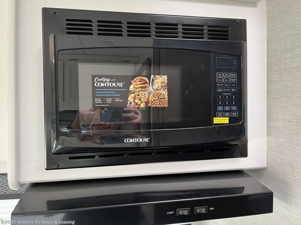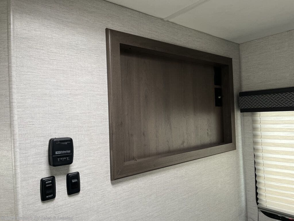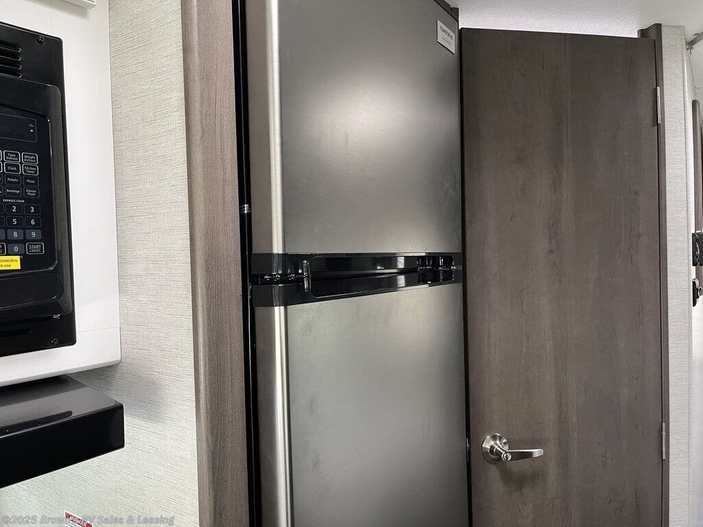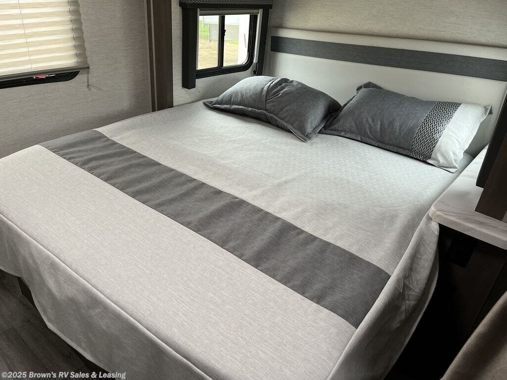 Modern amenities like touchscreen controls, a tankless water heater, 12V refrigerator, and solar prep ensure convenience on the road. Outside, you’ll appreciate the large power awning with LED lighting, exterior storage compartments, and bold graphics that make a statement at any campsite.
