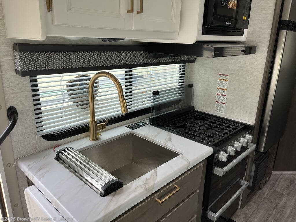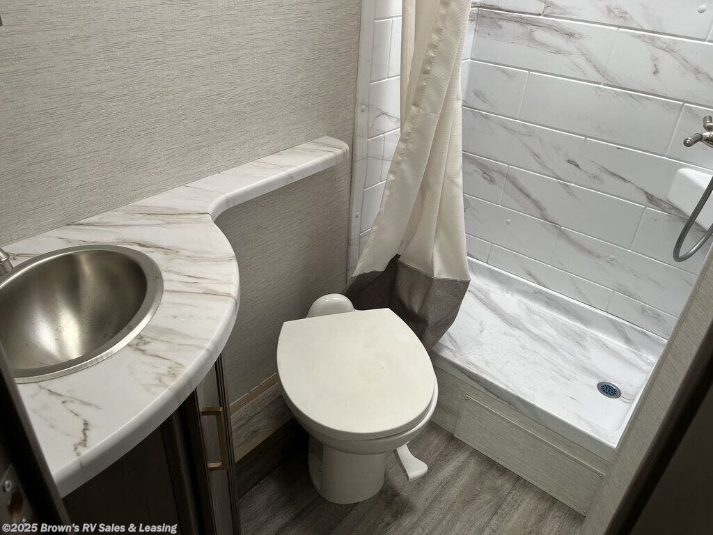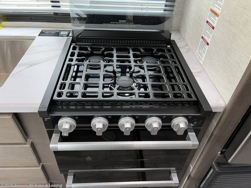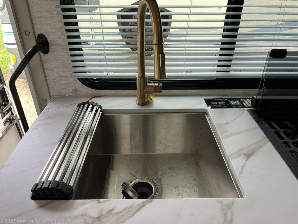Modern amenities like touchscreen controls, a tankless water heater, 12V refrigerator, and solar prep ensure convenience on the road. Outside, you’ll appreciate the large power awning with LED lighting, exterior storage compartments, and bold graphics that make a statement at any campsite.