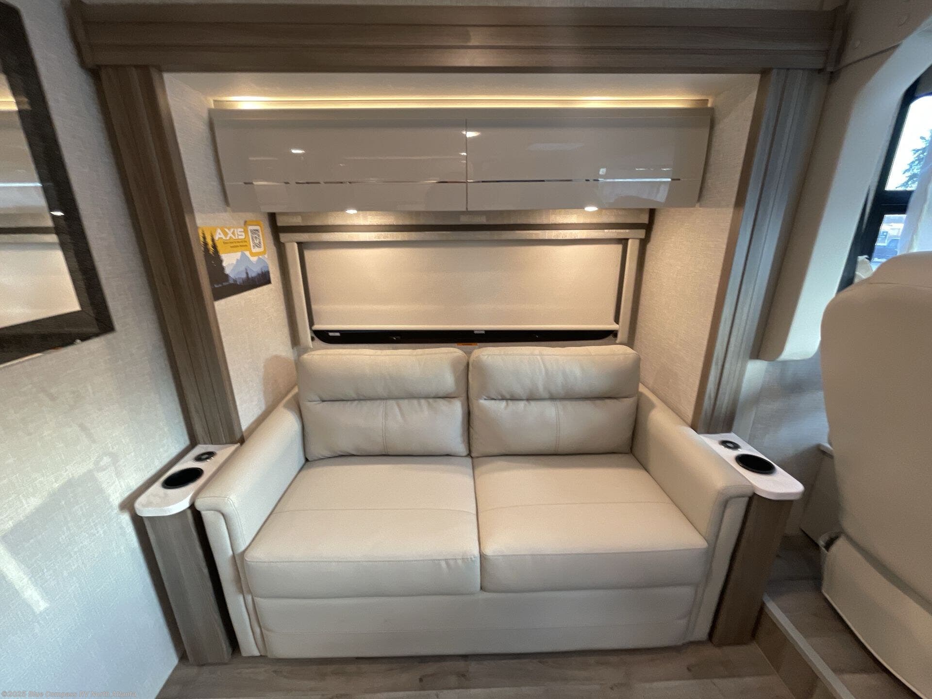 With any Axis Class A gas motorhome by Thor Motor Coach you will enjoy added technology features to make each trip enjoyable, like the RapidCamp+ multiplex lighting and systems control and the Winegard ConnecT 2.0 Wi-Fi/4G/TV antenna. Each model features heated and remote exterior mirrors with integrated side view cameras, reclining and swivel leatherette captain's chairs, and a dash workstation with 110-volt and 12-volt outlets to get some work done if needed. Relaxing after a long day of traveling will be easy with the leatherette furniture, complete kitchen and bath amenities, and 82" interior ceiling height. The HD-MAX exterior with graphics package and black frameless windows provide a sleek look you are sure to love, and don't overlook the lateral arm power awning with integrated LED lighting and lighted rotocast storage compartments for all your gear.