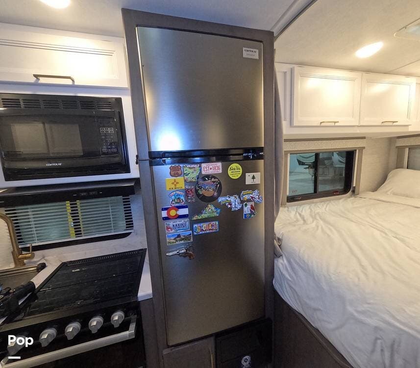 Inside, you'll find modern finishes, a fully equipped kitchen with a gas cooktop and microwave, a private rear queen bed, a roomy cab-over bunk, and a dinette that easily converts to extra sleeping space--perfect for family trips or weekend getaways.