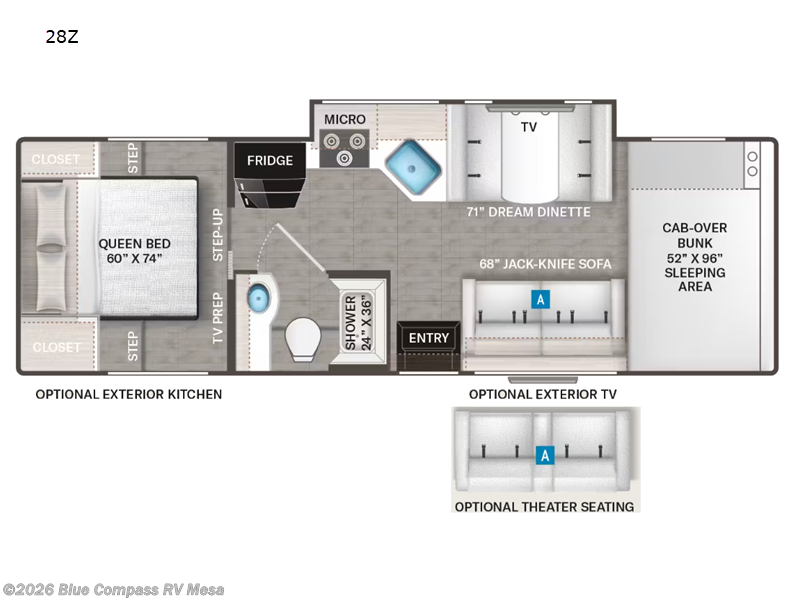 You will have everything you need for a comfortable vacation in this motorhome! Starting with the rear private bedroom which has a 60" x 74" queen bed with closets on either side of it and TV prep. As you step down from the bedroom, you will notice the full bathroom to your right which has a 24" x 36" shower with a skylight above it for added natural lighting. The fully equipped kitchen has everything you need to prepare your best home cooked meals, and you can enjoy them at the 71" Dream Dinette then relax on the 68" jackknife sofa across from the 40" TV. You could even add an optional exterior 32" TV for more entertainment!