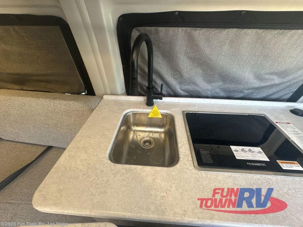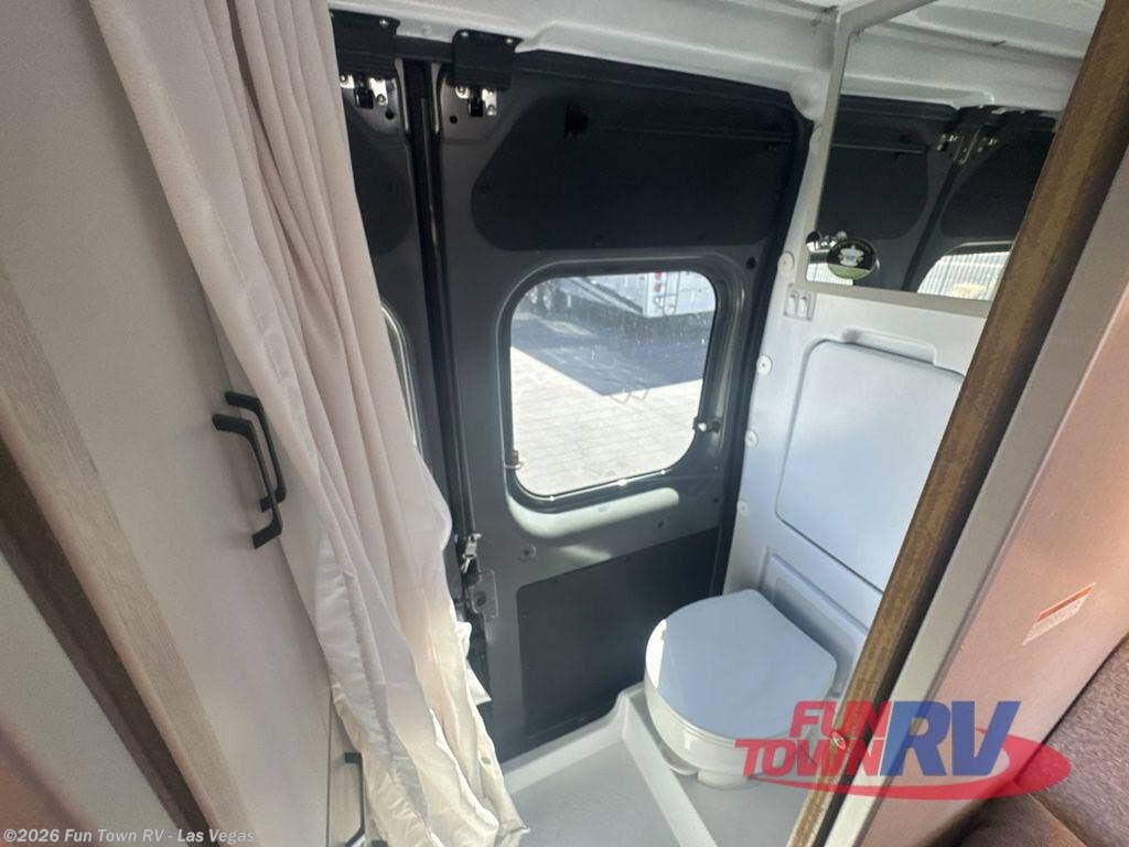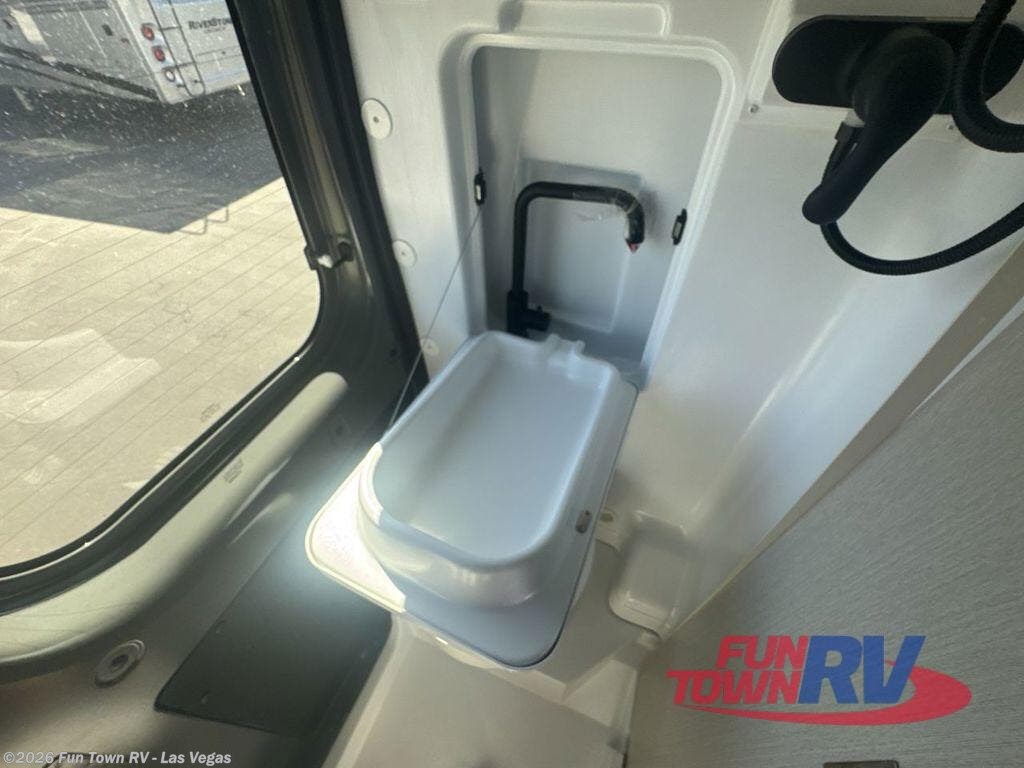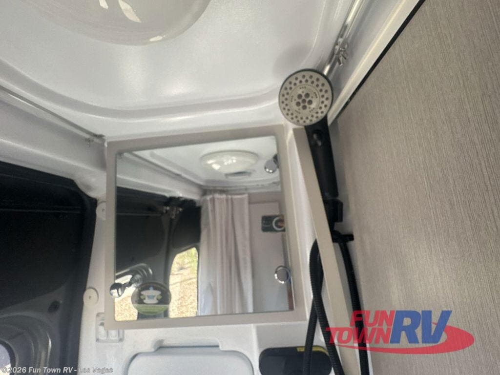 This Thor Motor Coach Dazzle includes a wet bath located all the way to the rear so you have more living space up front. The kitchen is just behind the cockpit swivel chairs, with a single door 12V refrigerator, two burner cooktop, and stainless steel sink. Towards the back are two twin beds that serve as seating areas during the day, and at night they can be converted to a king-size bed. There's also a removable dining table to enjoy all your meals. The fully enclosed rear wet bath features a shower and power vent. There's also an outdoor shower to keep things extra clean.